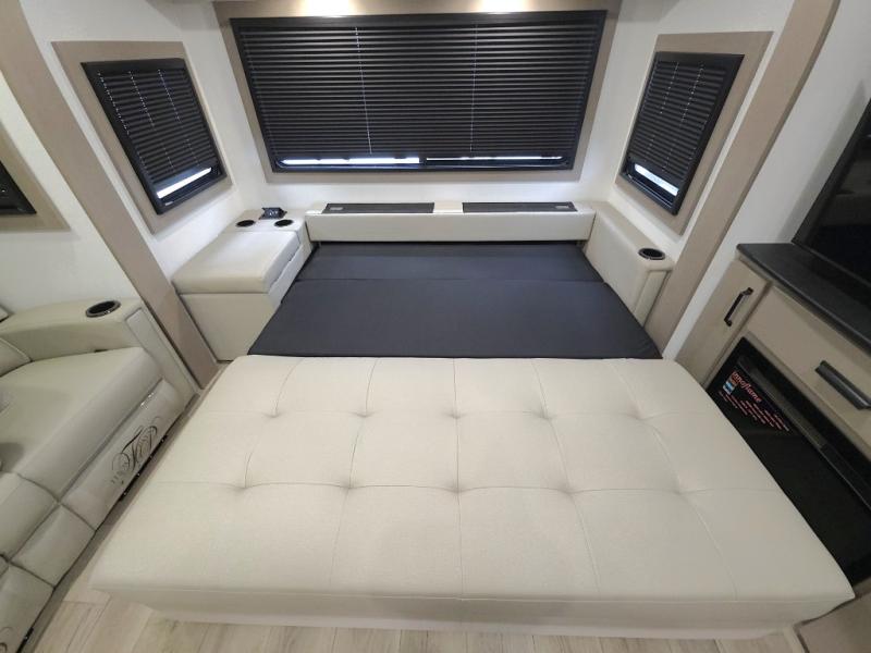 Rear Living Layout: Features a tri-fold sofa with adjustable headrests and theater seating directly across from a 40" TV and fireplace, creating a cozy lounge area for relaxing after a day outdoors.