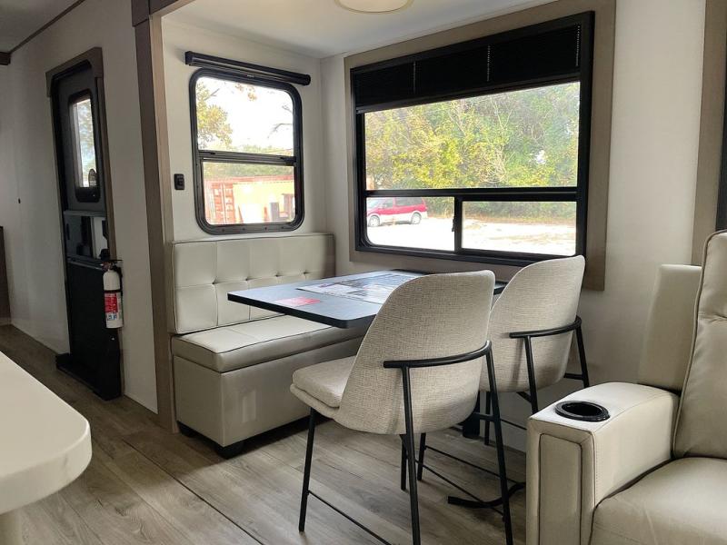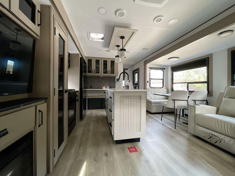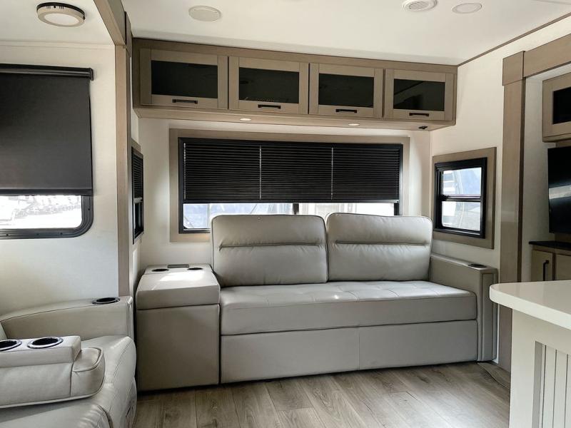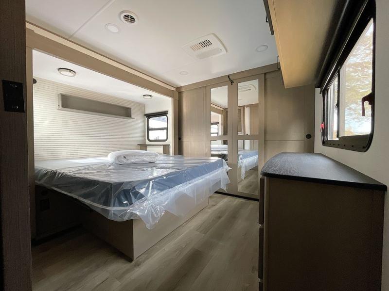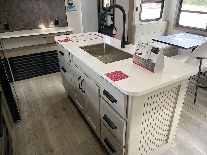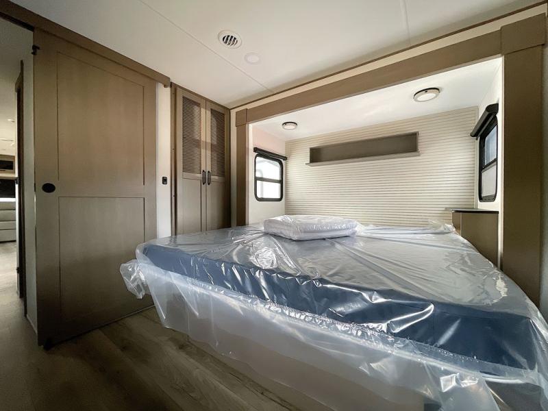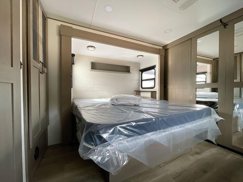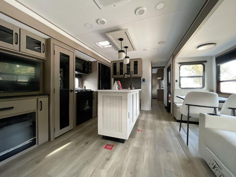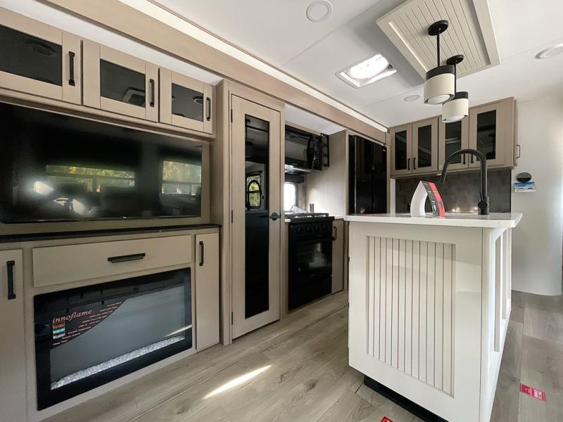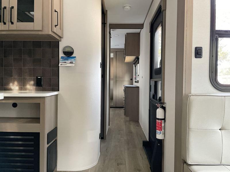 This rear living travel trailer will be perfect for extended stays at the campground or quick weekend trips to the lake! Once you've unloaded your gear from the pass-thru storage, head inside to relax on the rear tri-fold sofa with an adjustable headrest or on the theater seating across from the 40" TV and fireplace. There is also a booth dinette where you can dine together, or you can choose the optional swivel dinette. The spacious kitchen island will make meal time easier than ever, plus there is a pantry and 16 cu. ft. 12V refrigerator for food storage. The full bath is right next to the front private bedroom for easy nighttime use, and speaking of nighttime, you're sure to sleep soundly on the queen bed slide. There is also a large front closet, TV prep, plus washer and dryer prep if you choose to add these appliances.