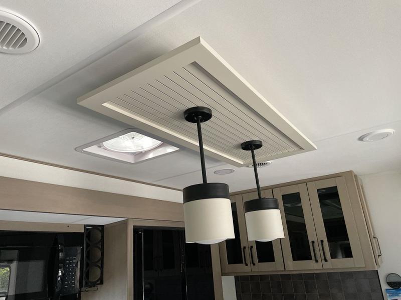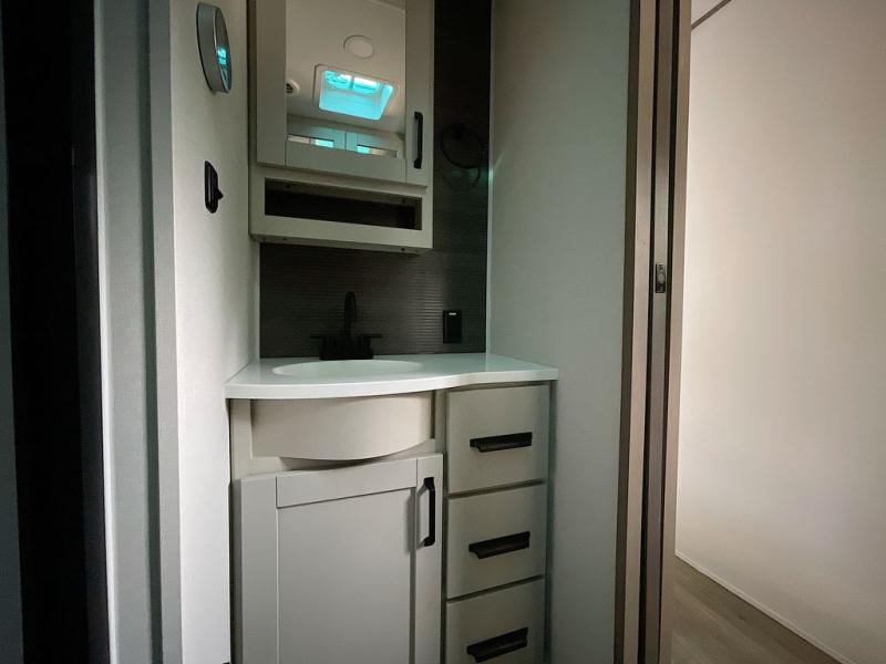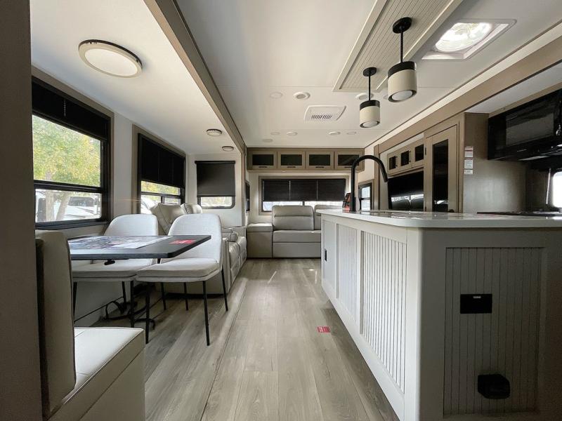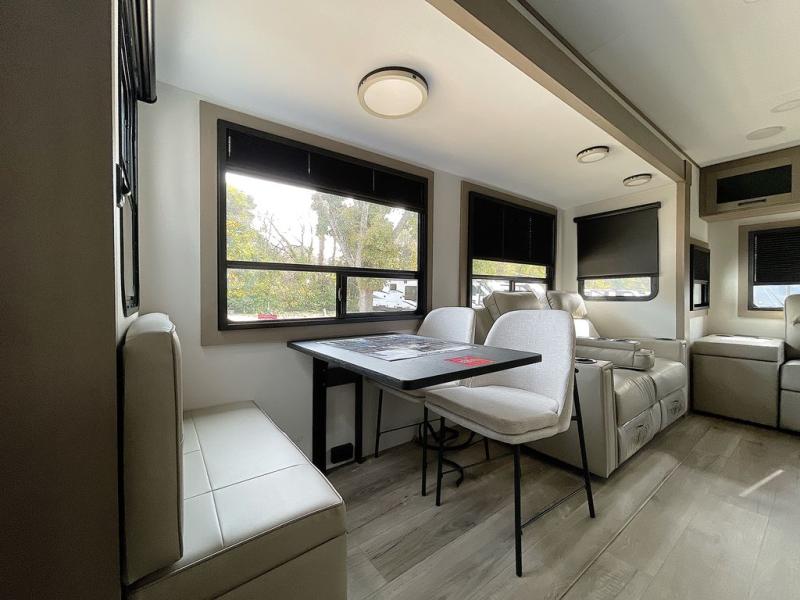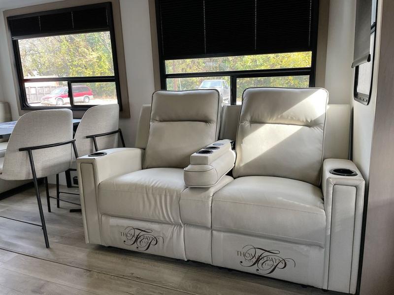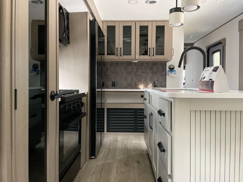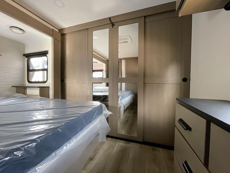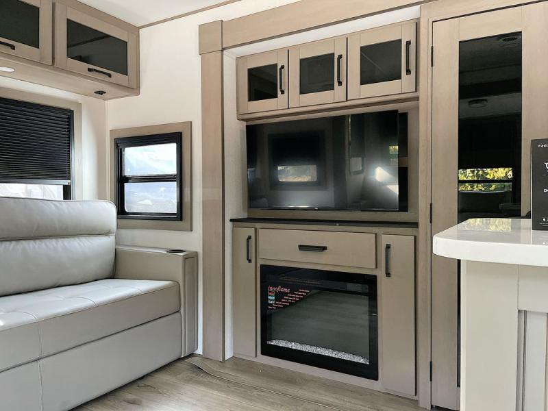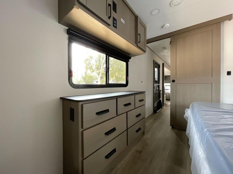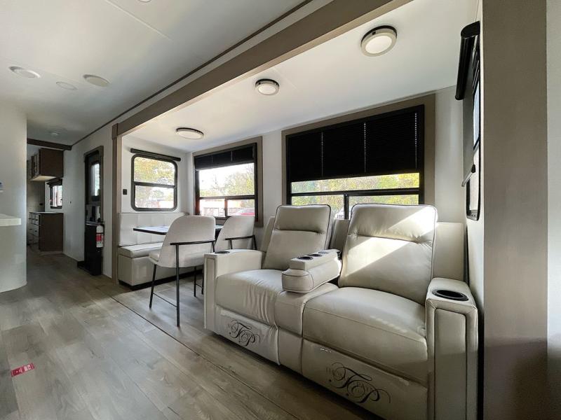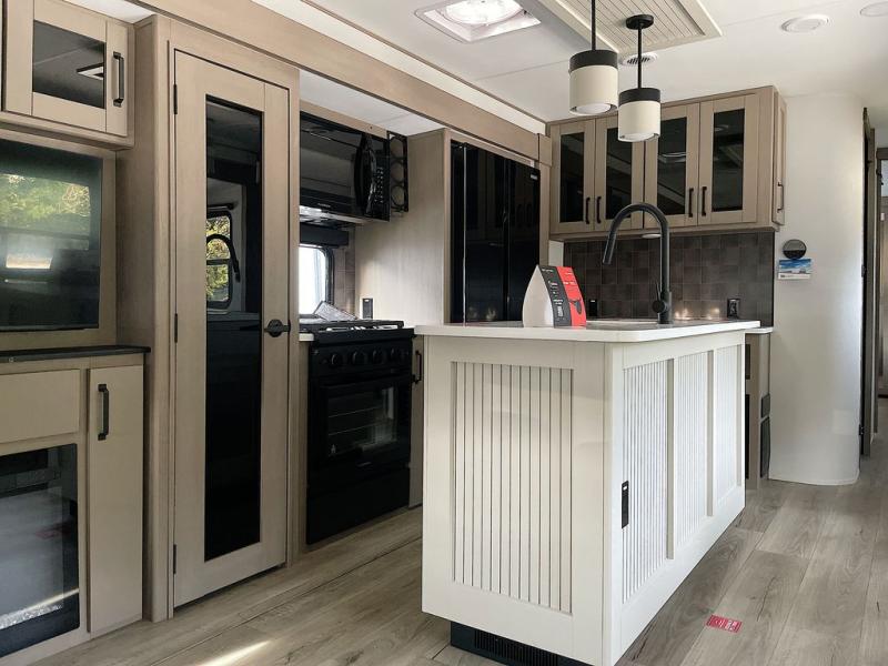 This rear living travel trailer will be perfect for extended stays at the campground or quick weekend trips to the lake! Once you've unloaded your gear from the pass-thru storage, head inside to relax on the rear tri-fold sofa with an adjustable headrest or on the theater seating across from the 40" TV and fireplace. There is also a booth dinette where you can dine together, or you can choose the optional swivel dinette. The spacious kitchen island will make meal time easier than ever, plus there is a pantry and 16 cu. ft. 12V refrigerator for food storage. The full bath is right next to the front private bedroom for easy nighttime use, and speaking of nighttime, you're sure to sleep soundly on the queen bed slide. There is also a large front closet, TV prep, plus washer and dryer prep if you choose to add these appliances.