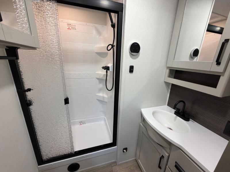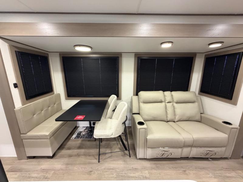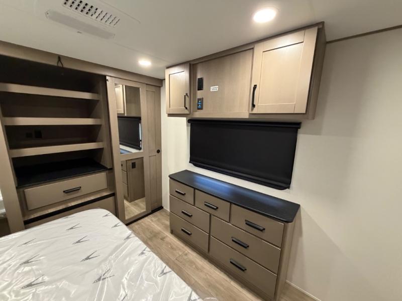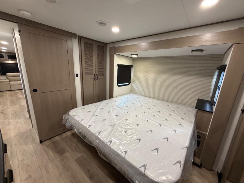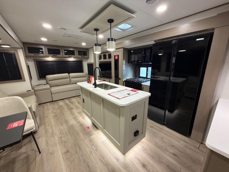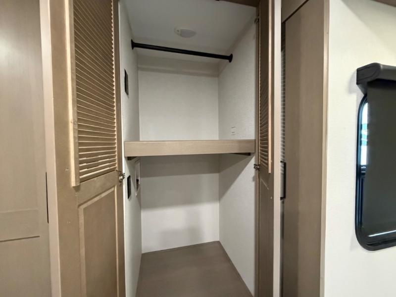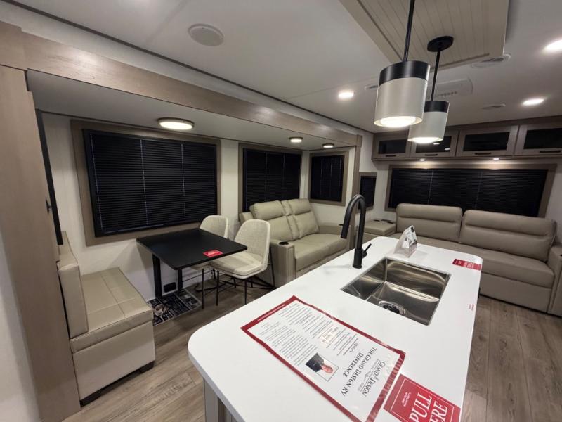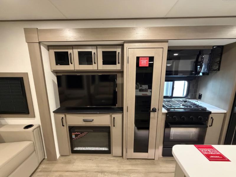This rear living travel trailer will be perfect for extended stays at the campground or quick weekend trips to the lake! Once you've unloaded your gear from the pass-thru storage, head inside to relax on the rear tri-fold sofa with an adjustable headrest or on the theater seating across from the 40" TV and fireplace. There is also a booth dinette where you can dine together, or you can choose the optional swivel dinette. The spacious kitchen island will make meal time easier than ever, plus there is a pantry and 16 cu. ft. 12V refrigerator for food storage. The full bath is right next to the front private bedroom for easy nighttime use, and speaking of nighttime, you're sure to sleep soundly on the queen bed slide. There is also a large front closet, TV prep, plus washer and dryer prep if you choose to add these appliances.