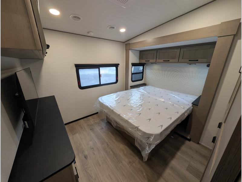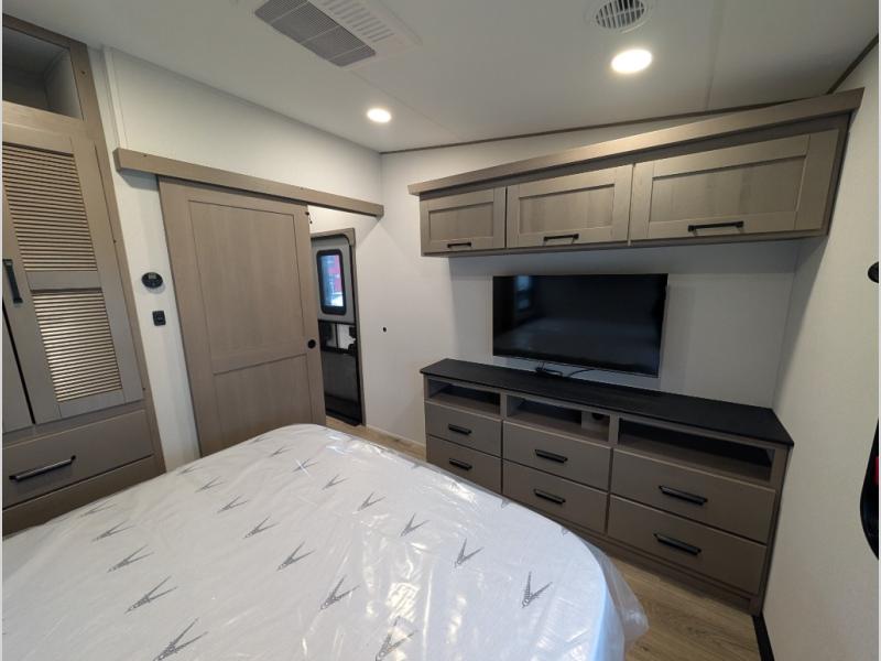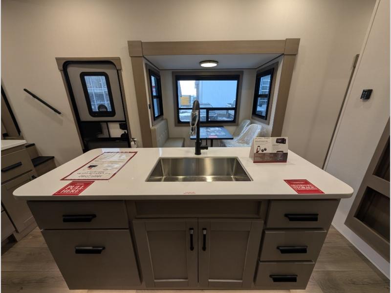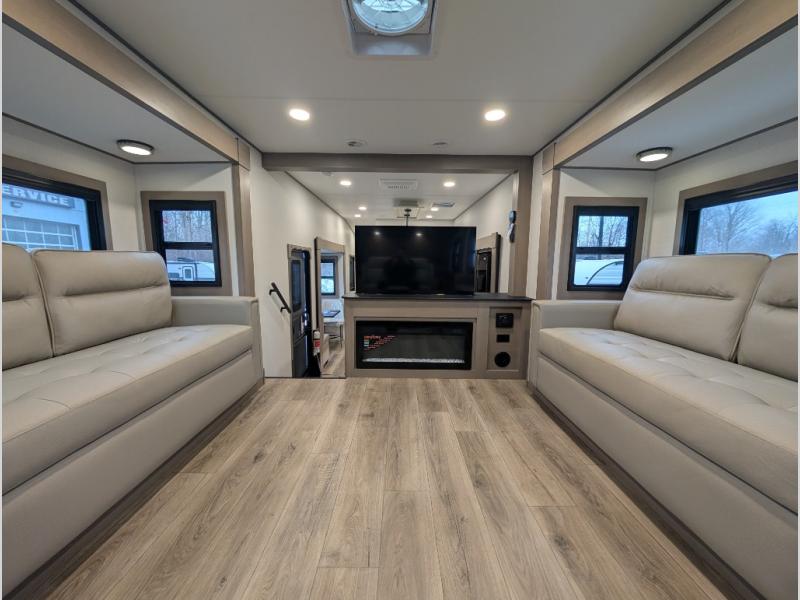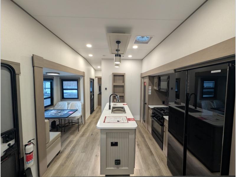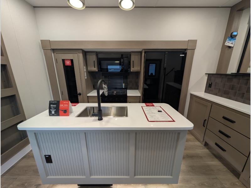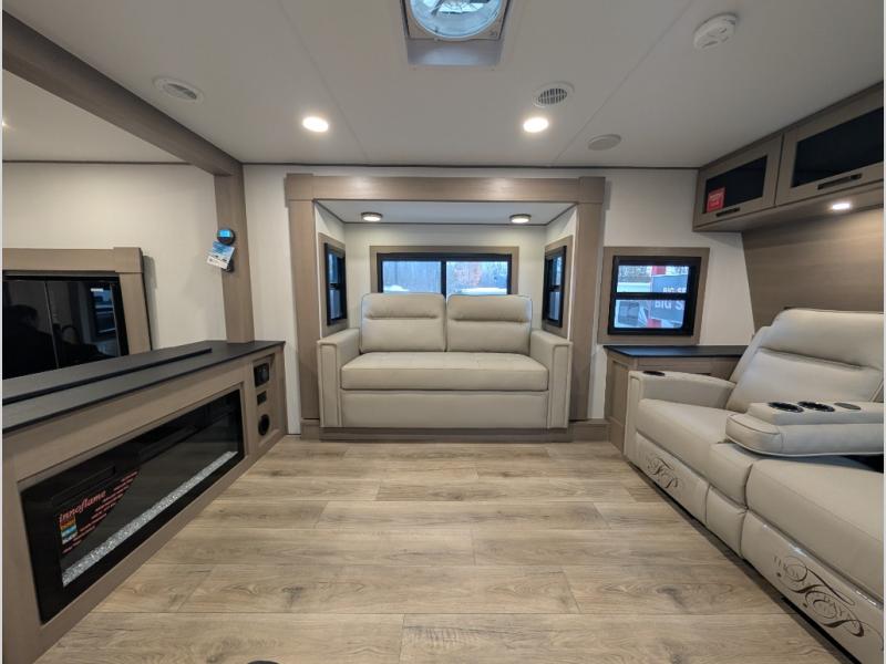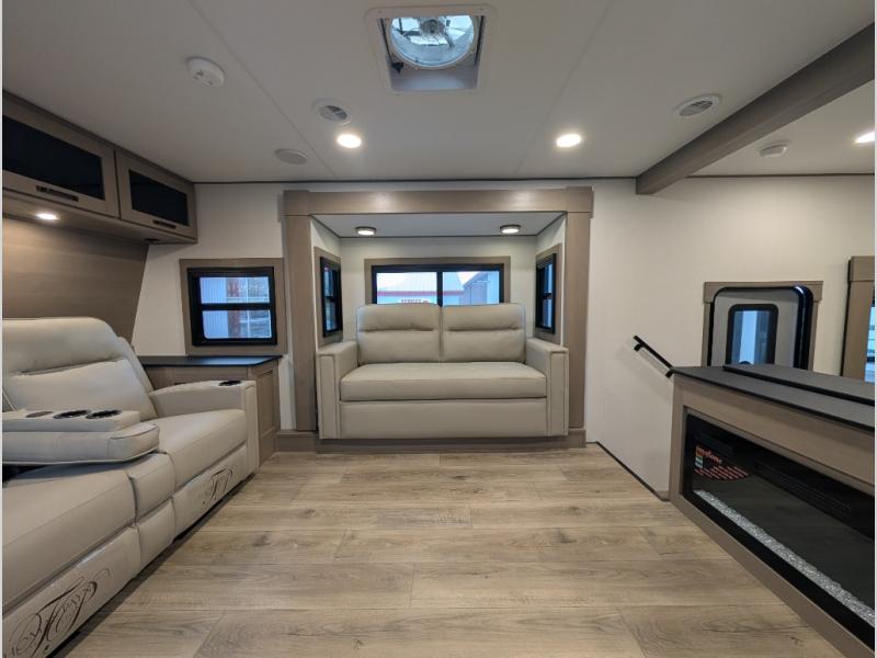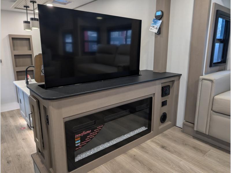 This fifth wheel might be your perfect retreat! The private rear bedroom comes with a standard queen bed, or upgrade to a king for even more room to relax. Up front you'll find a living room perfect for entertaining, with dual tri-fold sofas plus a pair of theater seats. The focal point is the entertainment center which is equipped with a 50" TV on a lift. The central kitchen is well-equipped for cooking, with a 16 cu. ft. refrigerator and a center island. A booth dinette provides great seating, or opt for the swivel dinette.