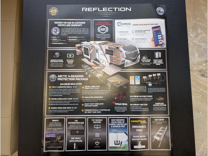 With any Reflection fifth wheel by Grand Design, you will have a solar panel for off-grid camping and a 60 amp charge controller and inverter prep, a Universal All-In-One docking station, unobstructed pass-through storage, and Goodyear Endurance tires. Each is constructed of gel coat exterior sidewalls, residential 5" truss rafters, walk-on roof decking, a fiberglass and radiant foil roof and front cap insulation plus laminated aluminum framed side walls, roof and end walls in slide rooms. Head inside to enjoy residential hardwood cabinet doors, premium Congoleum flooring, a spacious shower with a glass door, and many more comforts!