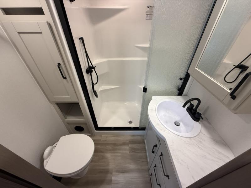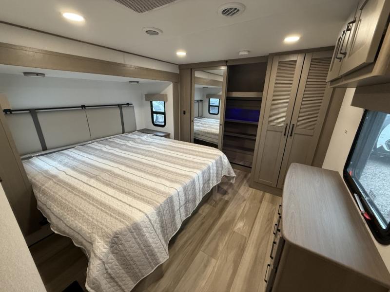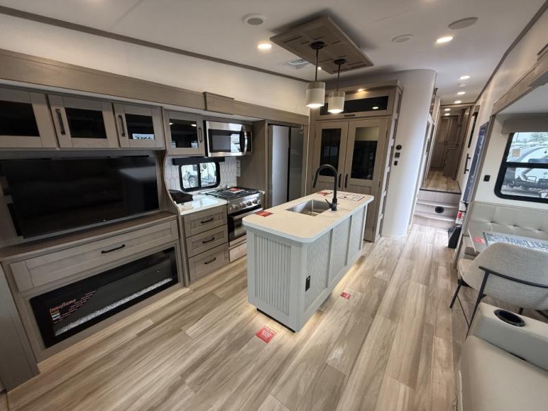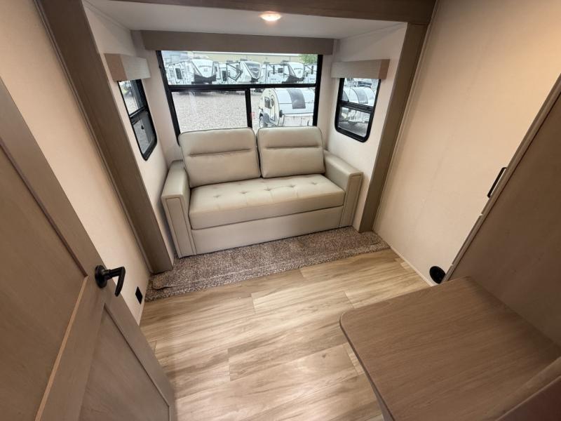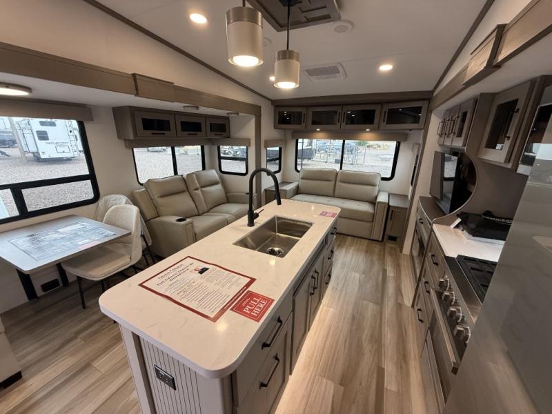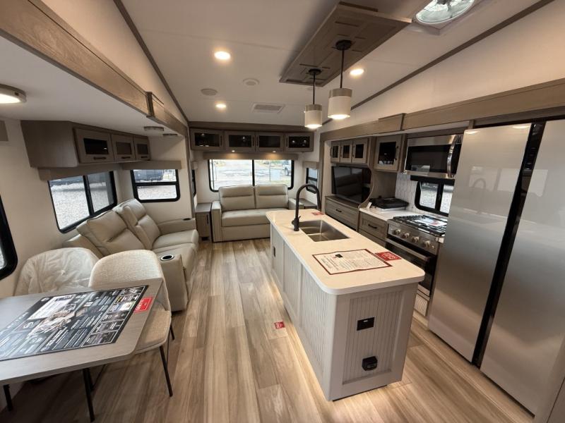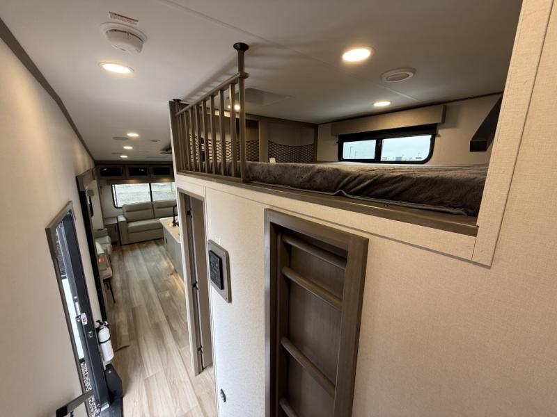 Travel to see new state parks, RV resorts or your family in other states as you tow this fifth wheel to each destination! You will enjoy comfort and convenience, plus a place to work, and be able to offer extra sleeping space for friends and family when they visit. The middle extra room provides a tri-fold sofa slide, a desk, a wardrobe, plus a 64" x 88" upper bed loft area with access from the hallway. The full bathroom will keep everyone refreshed, and the front bedroom allows you to sleep on a queen bed slide or choose the king option. And you will love the front wardrobe, the dresser, and the option to add a washer/dryer. The main living and kitchen area provides plenty of seating from the rear tri-fold sofa, the booth dinette or swivel dinette option, and the theater seats with cupholders. And the kitchen island, appliances, and large pantry allow you to take everything you need with you.