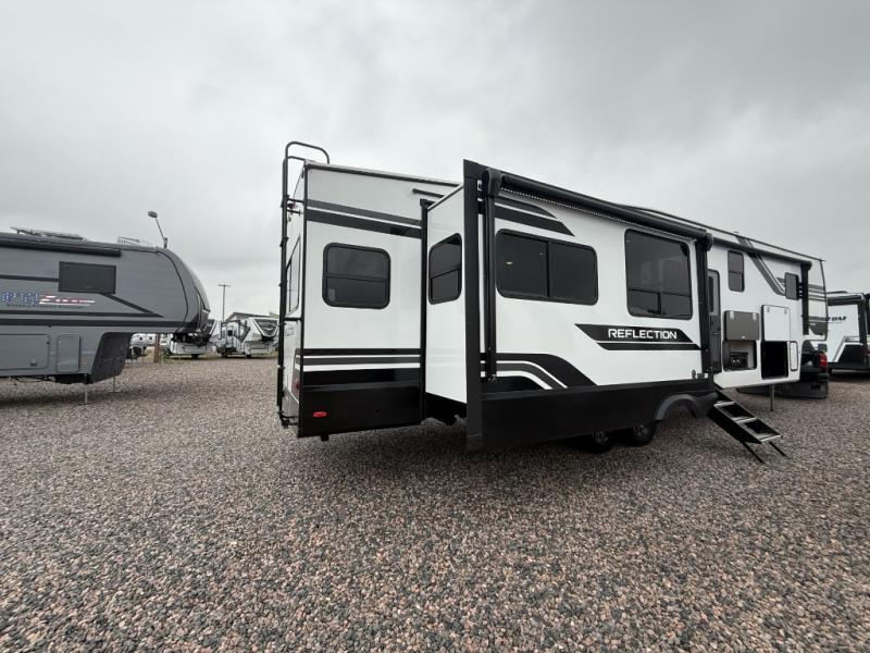 With any Reflection fifth wheel by Grand Design, you will have a solar panel for off-grid camping and a 60 amp charge controller and inverter prep, a Universal All-In-One docking station, unobstructed pass-through storage, and Goodyear Endurance tires. Each is constructed of gel coat exterior sidewalls, residential 5" truss rafters, walk-on roof decking, a fiberglass and radiant foil roof and front cap insulation plus laminated aluminum framed side walls, roof and end walls in slide rooms. Head inside to enjoy residential hardwood cabinet doors, premium Congoleum flooring, a spacious shower with a glass door, and many more comforts!