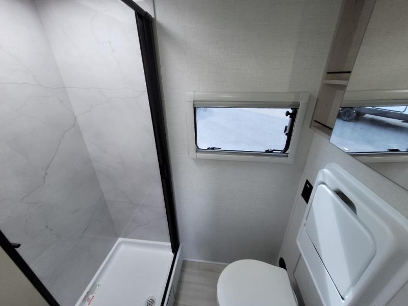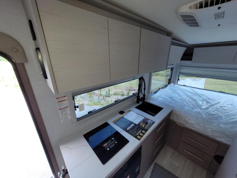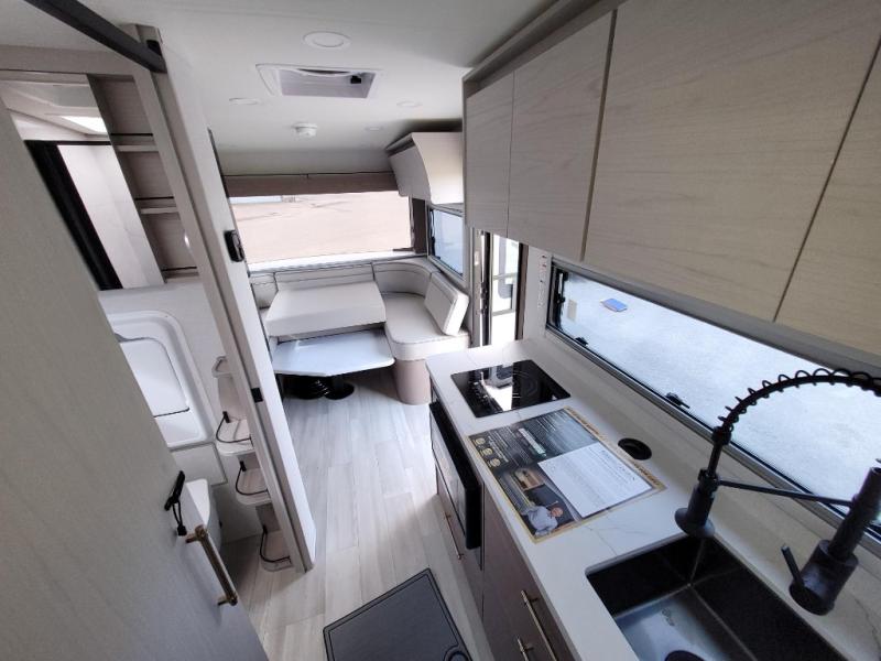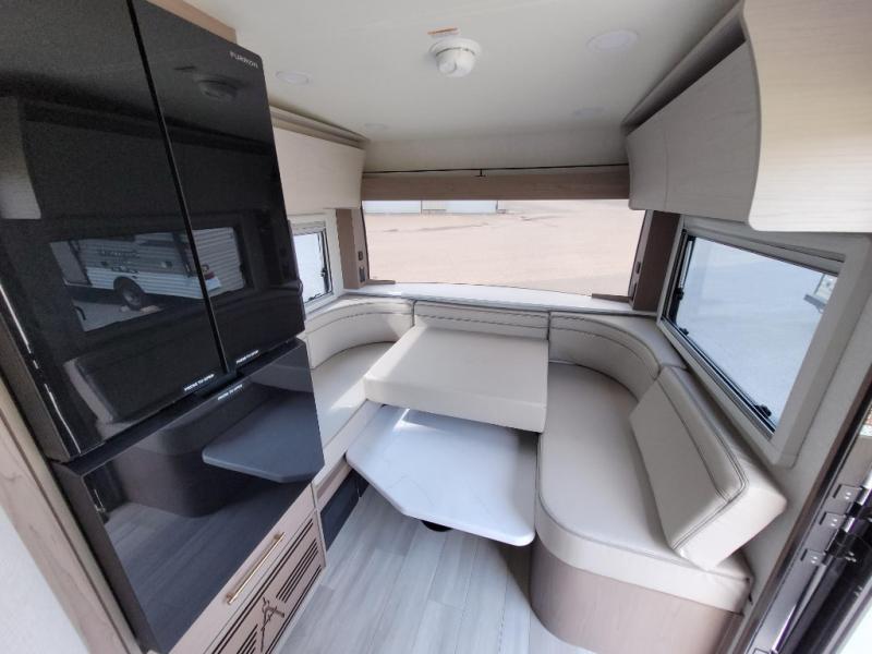 Trips to the lake are made complete in this cozy travel trailer for four. Once you arrive at the campground, you can unload the exterior storage, then start lunch on the induction cooktop and convection microwave. There is a front U-shaped sleeper dinette that will provide dining space and additional sleeping space for guests. This unit includes a private full bath with a shower, toilet, and flip-up bath sink plus some convenient storage for your necessities. You're sure to enjoy sleeping on the rear queen bed that includes wraparound overhead storage for your things!