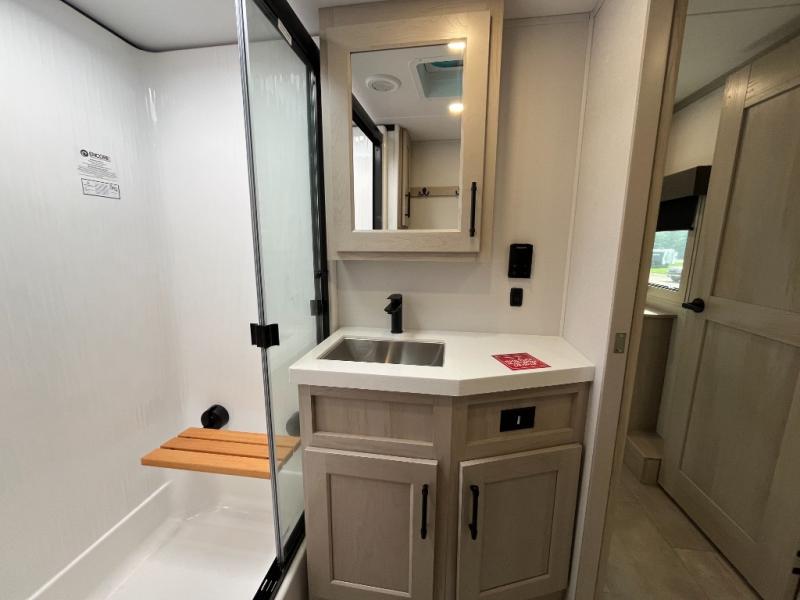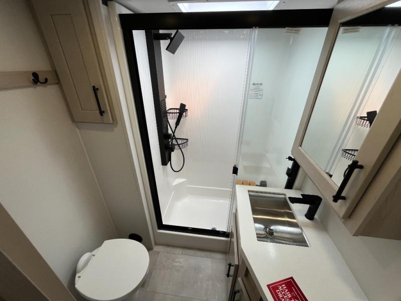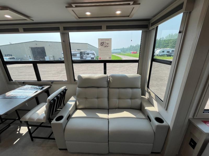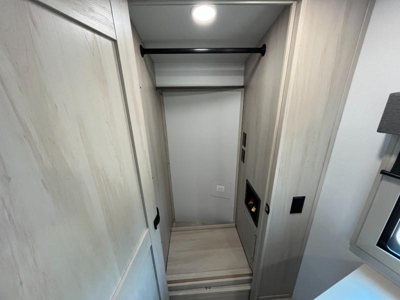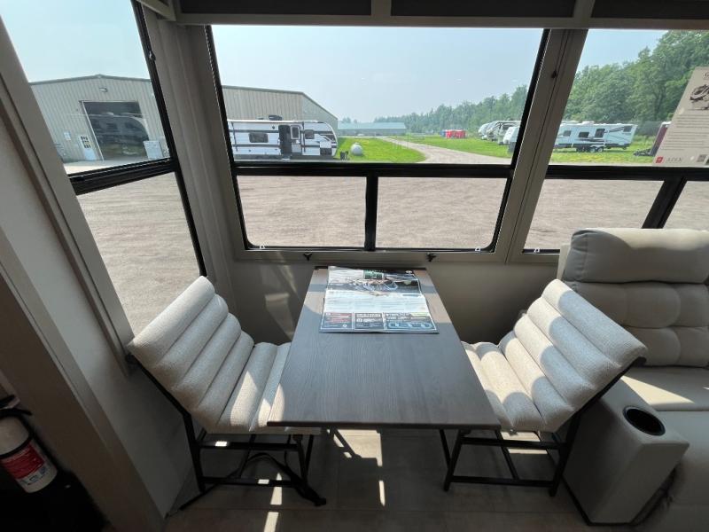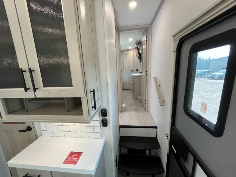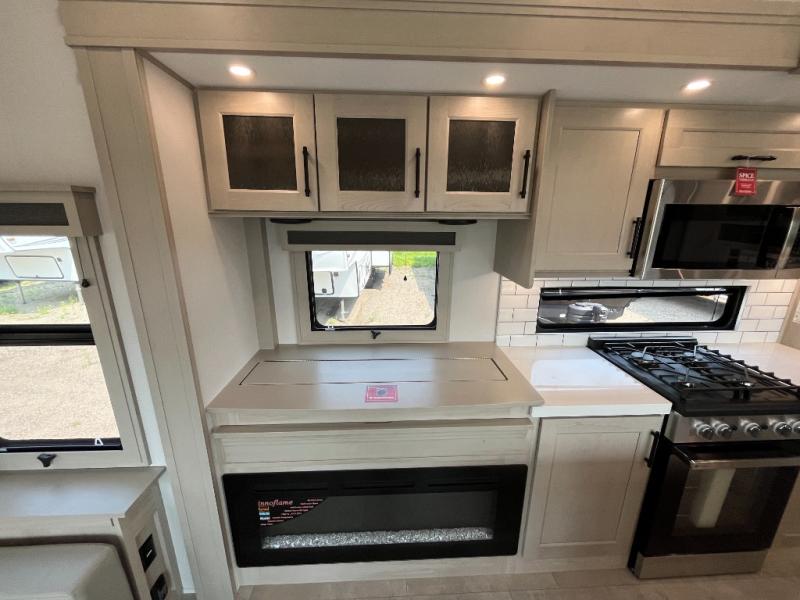 Traveling for long periods at a time is made easy with this gourmet kitchen that can feed your entire group a holiday meal! The professional-grade stainless steel cooktop with a built-in oven, microwave, 12V 20 cu. ft. refrigerator, and a kitchen island offers everything you will need to enjoy cooking for your family and guests. There is abundant storage throughout multiple overhead cabinets, a kitchen pantry and hutch, a bath linen cabinet for your towels, and in the front master bedroom which features a large closet. In the bedroom there is also a queen bed slide for added space to sleep comfortable at night, or you may choose an optional king bed if you enjoy more space. You will also find a closet with washer/dryer prep, large wardrobe, a clothes hamper plus a slide top dresser. Two nice awnings will provide outdoor living space keeping you protected from the sun and rain, and you can add an optional pull-out kitchen to enjoy convenient cooking outdoors as well.