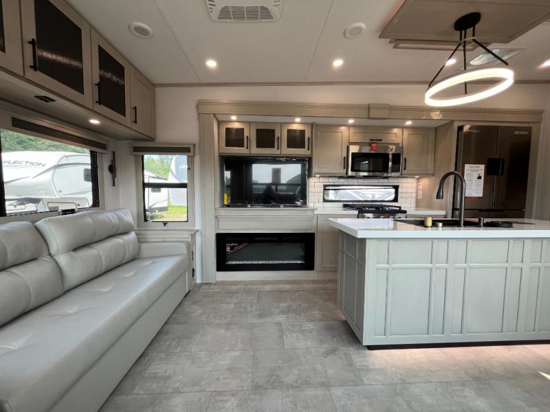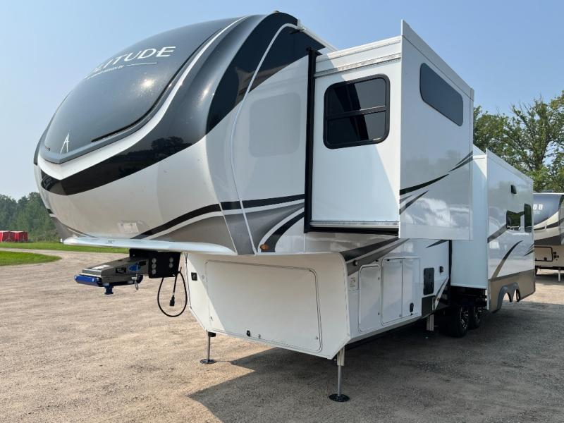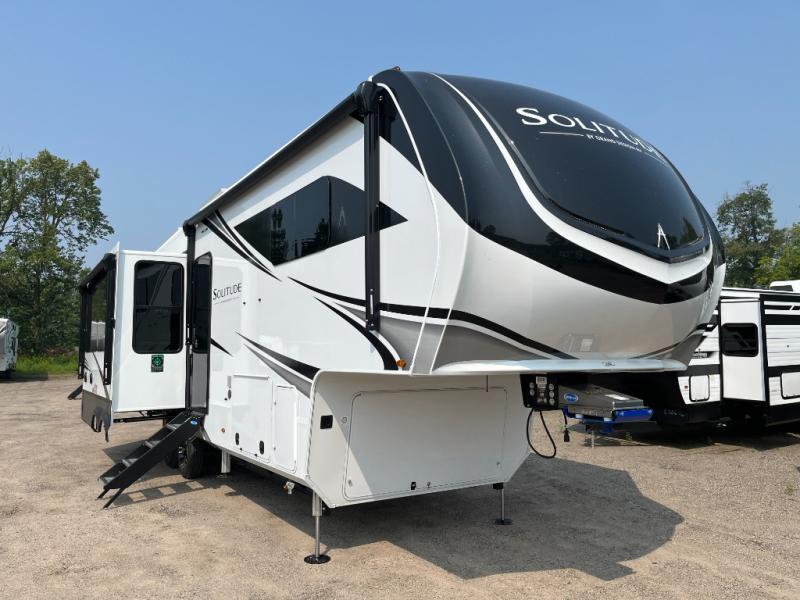 Each Solitude fifth wheel by Grand Design features a 101" wide-body construction, heavy duty 8,000 lb. axles, frameless tinted windows, and high-gloss gel coat sidewalls. You can camp year around thanks to the Weather-Tek Package that includes a 35K BTU high-capacity furnace, an all-in-one enclosed and heated utility center, and a fully enclosed underbelly with heated tanks and storage. Inside, you'll love the premium roller shades, hardwood cabinet doors, solid surface countertops, plus residential finishes throughout to make you truly feel at home. Each model also includes a MORryde CRE3000 suspension system, self adjusting brakes, and a MORryde pin box that will provide smooth towing from home to campground. Affordable luxury is possible with the Solitude fifth wheels; choose yours today!
