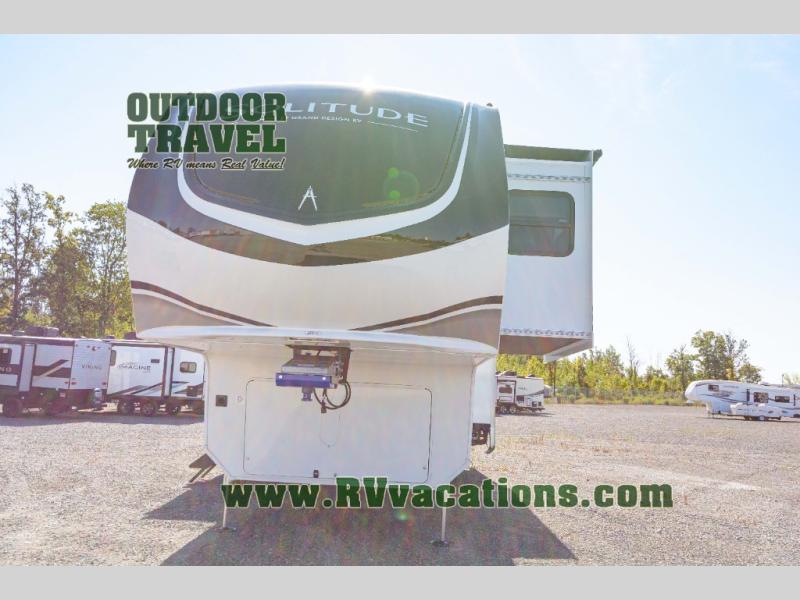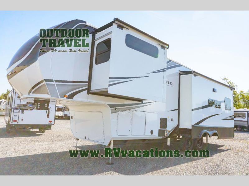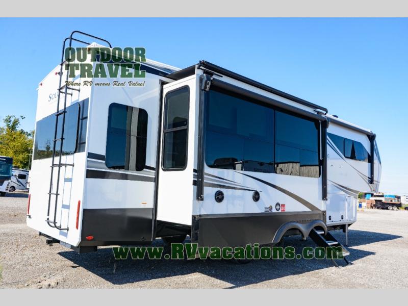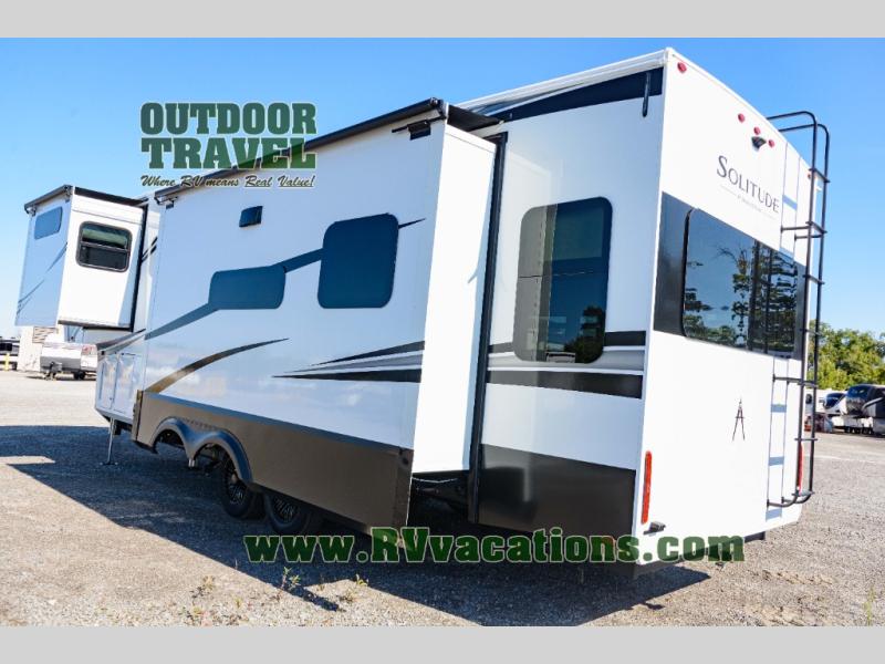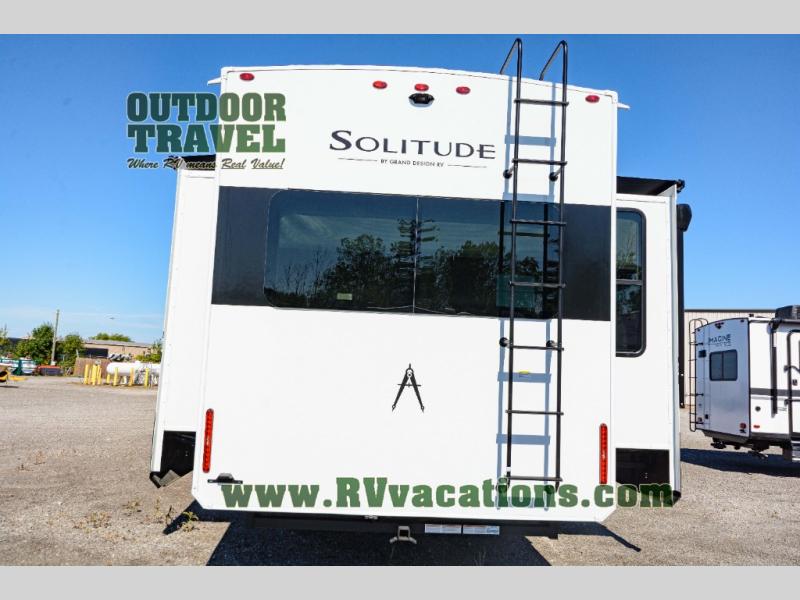 Each Solitude fifth wheel by Grand Design features a 101" wide-body construction, heavy duty 8,000 lb. axles, frameless tinted windows, and high-gloss gel coat sidewalls. You can camp year around thanks to the Weather-Tek Package that includes a 35K BTU high-capacity furnace, an all-in-one enclosed and heated utility center, and a fully enclosed underbelly with heated tanks and storage. Inside, you'll love the premium roller shades, hardwood cabinet doors, solid surface countertops, plus residential finishes throughout to make you truly feel at home. Each model also includes a MORryde CRE3000 suspension system, self adjusting brakes, and a MORryde pin box that will provide smooth towing from home to campground. Affordable luxury is possible with the Solitude fifth wheels; choose yours today!
