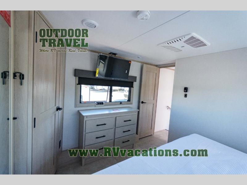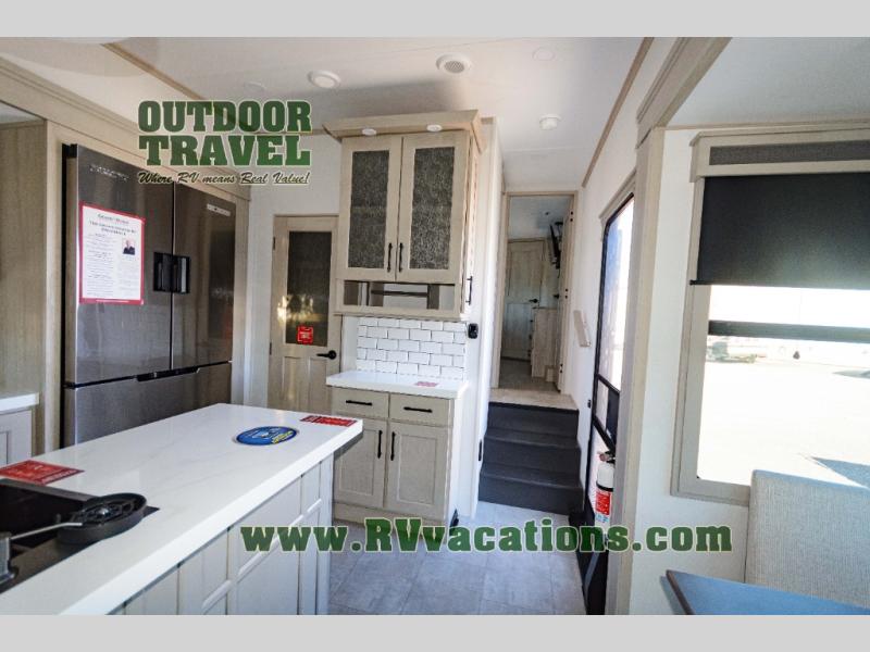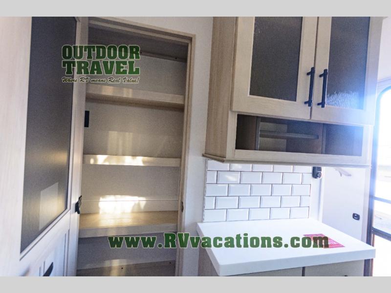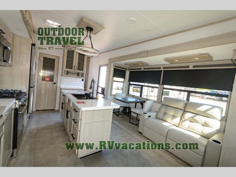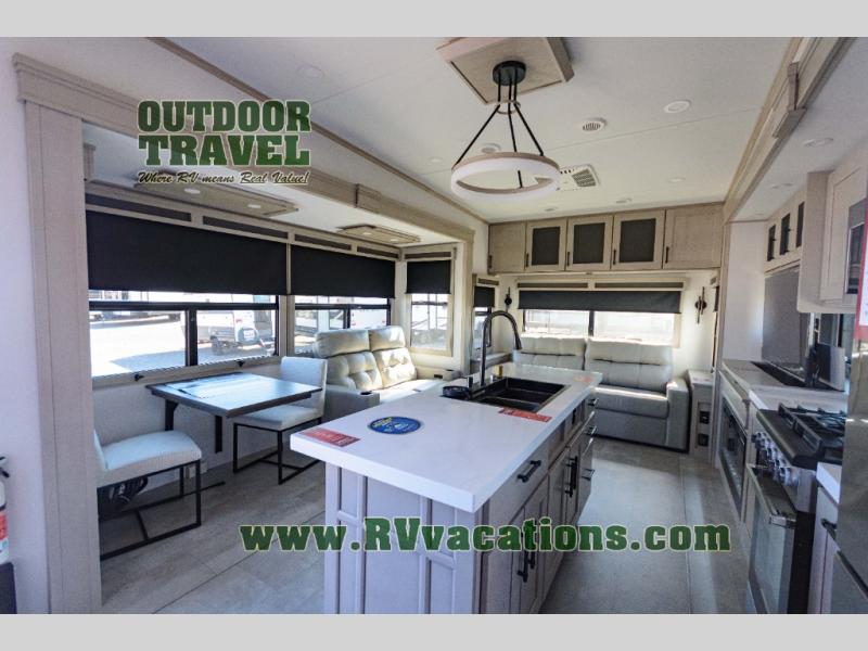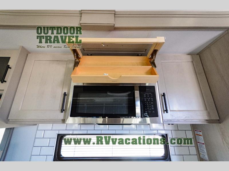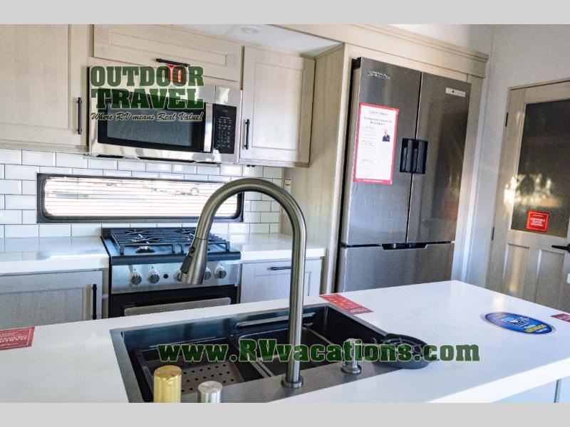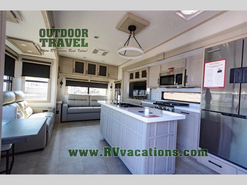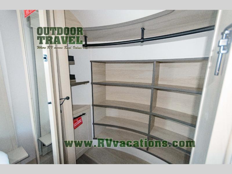 Traveling for long periods at a time is made easy with this gourmet kitchen that can feed your entire group a holiday meal! The professional-grade stainless steel cooktop with a built-in oven, microwave, 12V 20 cu. ft. refrigerator, and a kitchen island offers everything you will need to enjoy cooking for your family and guests. There is abundant storage throughout multiple overhead cabinets, a kitchen pantry and hutch, a bath linen cabinet for your towels, and in the front master bedroom which features a large closet. In the bedroom there is also a queen bed slide for added space to sleep comfortable at night, or you may choose an optional king bed if you enjoy more space. You will also find a closet with washer/dryer prep, large wardrobe, a clothes hamper plus a slide top dresser. Two nice awnings will provide outdoor living space keeping you protected from the sun and rain, and you can add an optional pull-out kitchen to enjoy convenient cooking outdoors as well.