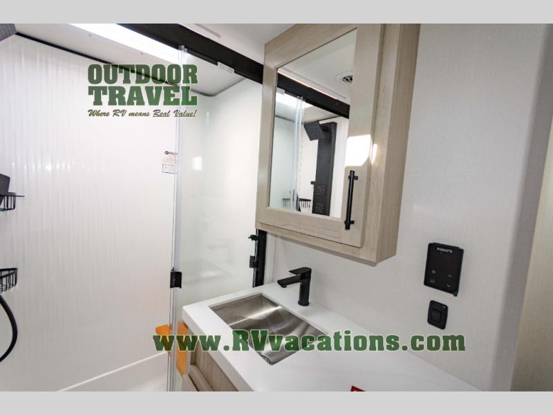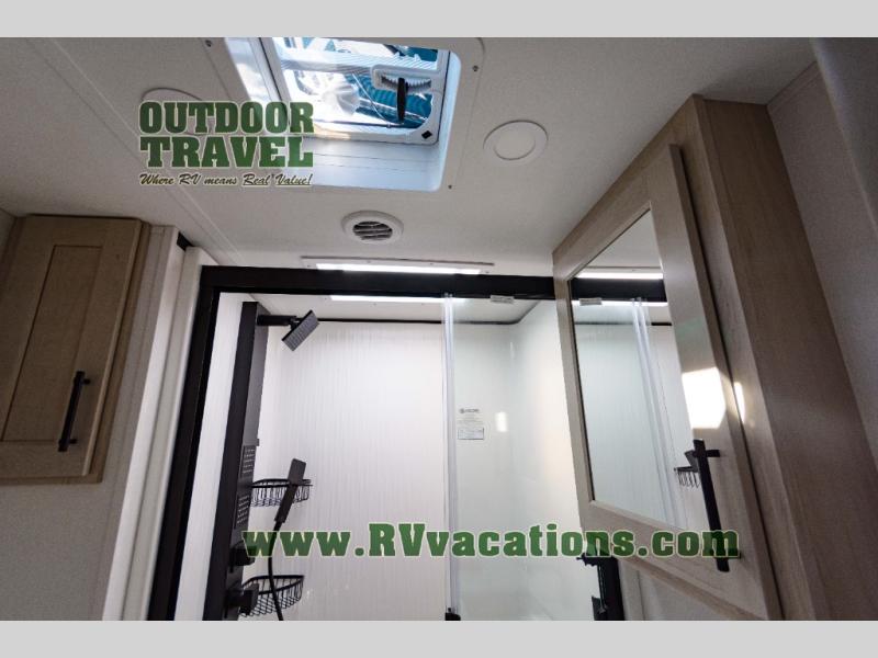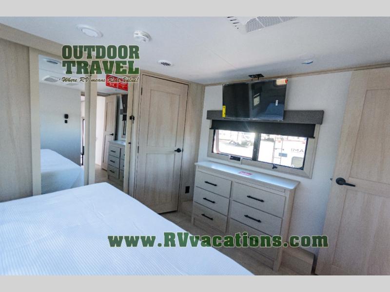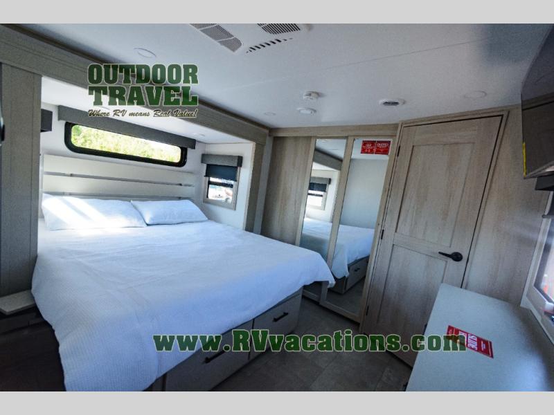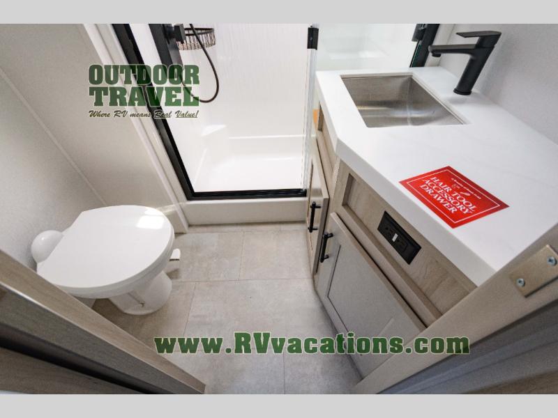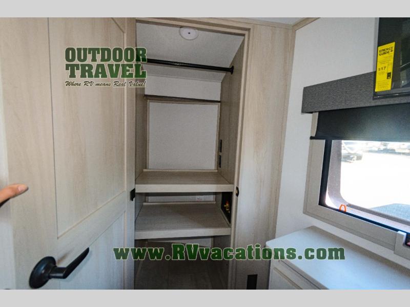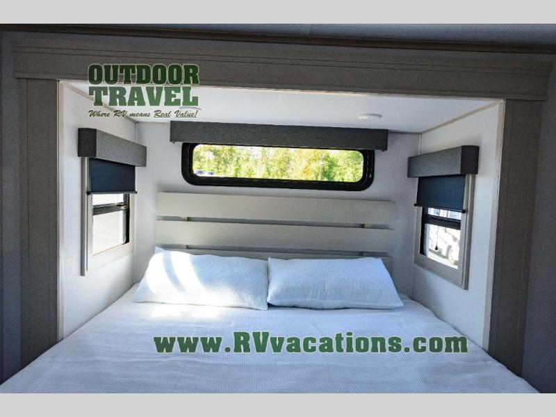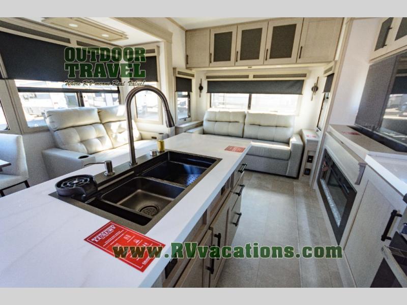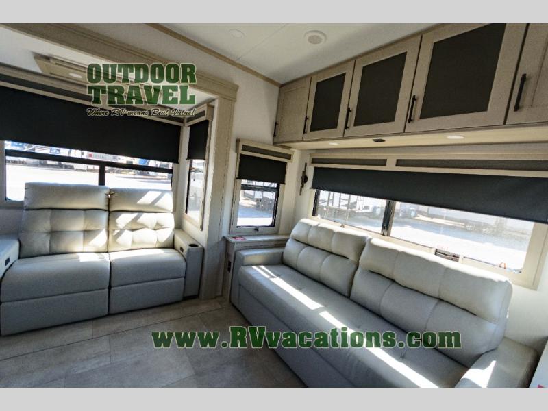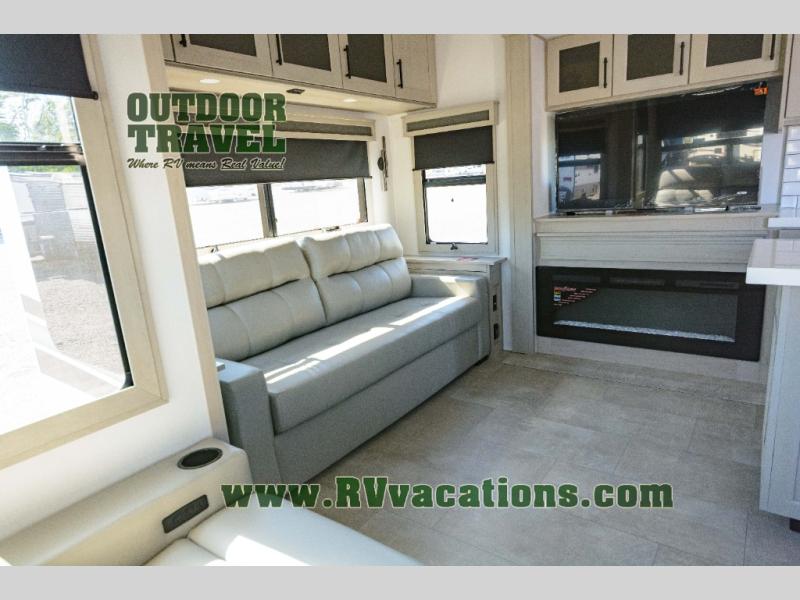 Traveling for long periods at a time is made easy with this gourmet kitchen that can feed your entire group a holiday meal! The professional-grade stainless steel cooktop with a built-in oven, microwave, 12V 20 cu. ft. refrigerator, and a kitchen island offers everything you will need to enjoy cooking for your family and guests. There is abundant storage throughout multiple overhead cabinets, a kitchen pantry and hutch, a bath linen cabinet for your towels, and in the front master bedroom which features a large closet. In the bedroom there is also a queen bed slide for added space to sleep comfortable at night, or you may choose an optional king bed if you enjoy more space. You will also find a closet with washer/dryer prep, large wardrobe, a clothes hamper plus a slide top dresser. Two nice awnings will provide outdoor living space keeping you protected from the sun and rain, and you can add an optional pull-out kitchen to enjoy convenient cooking outdoors as well.