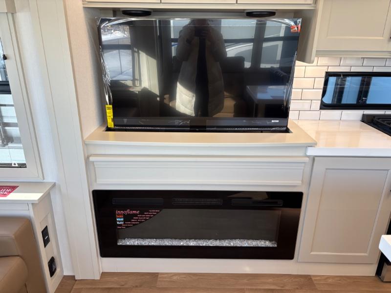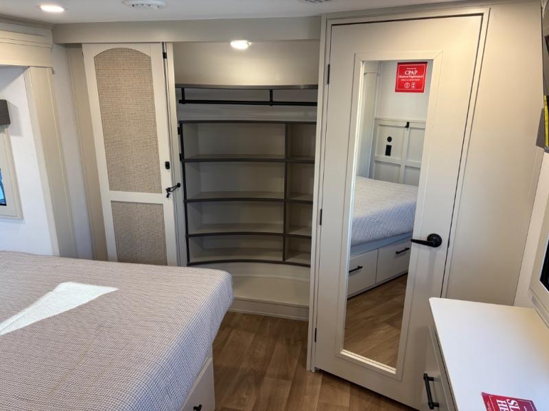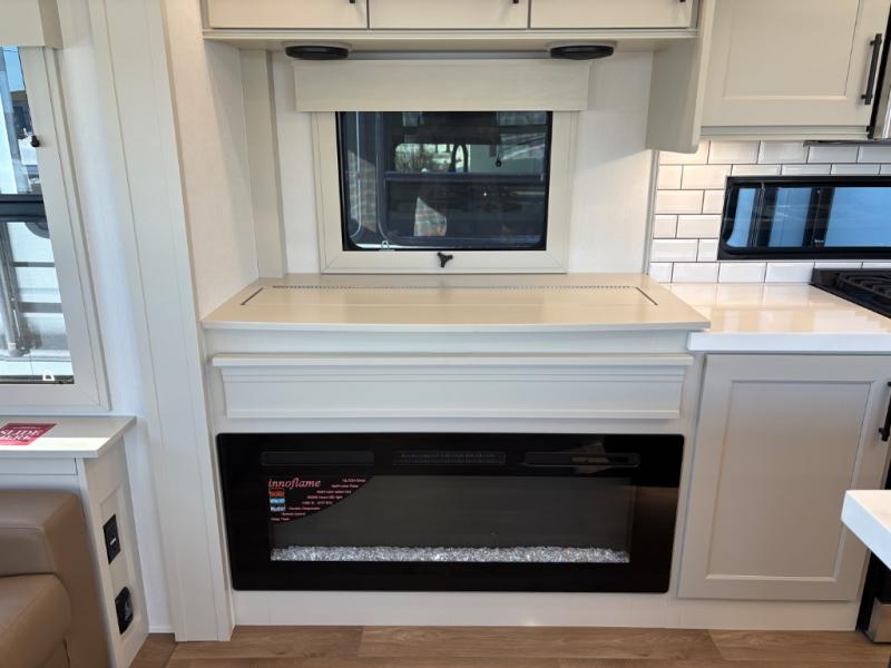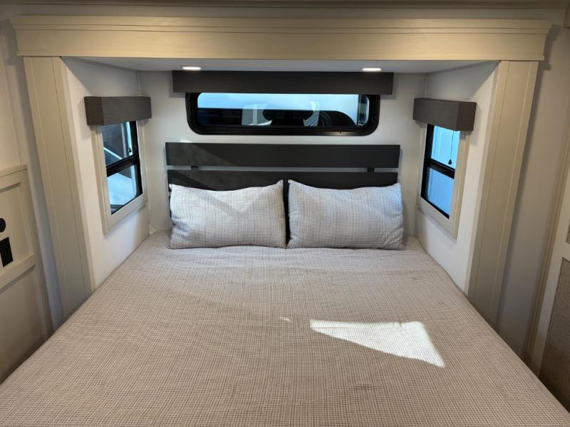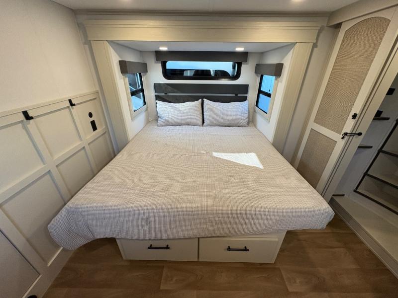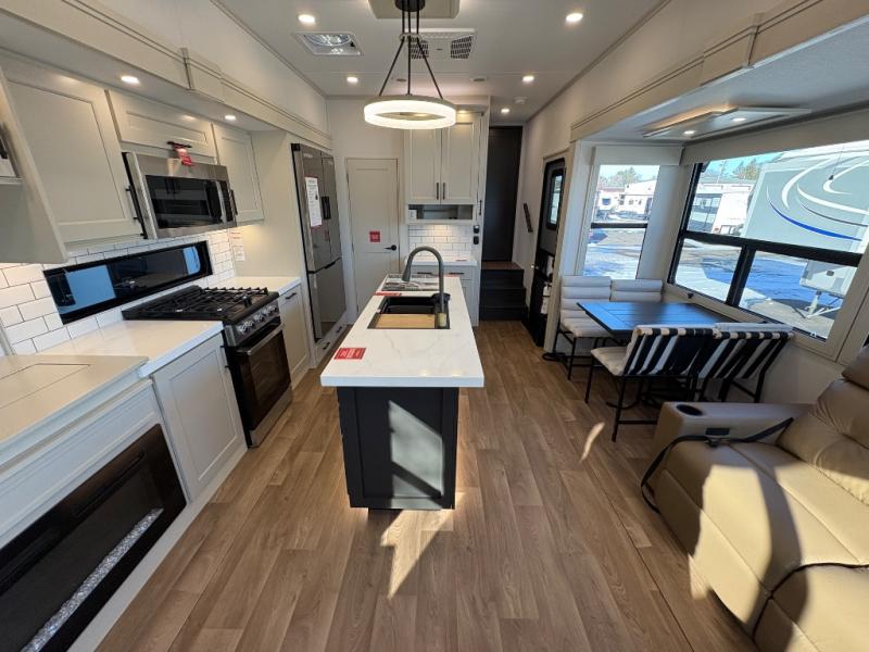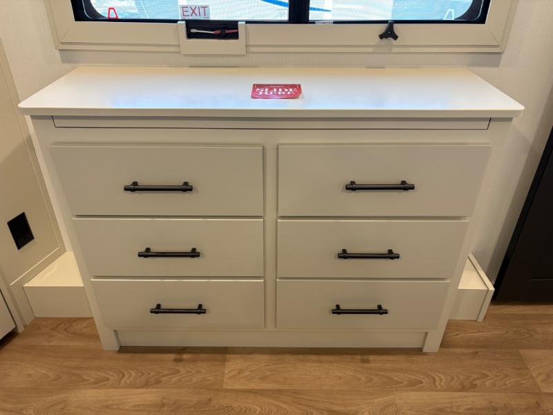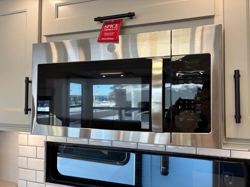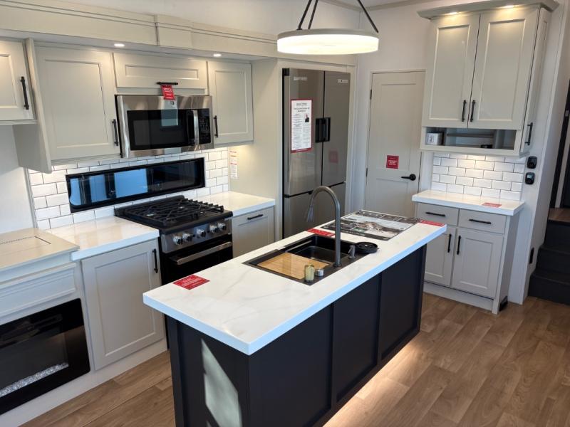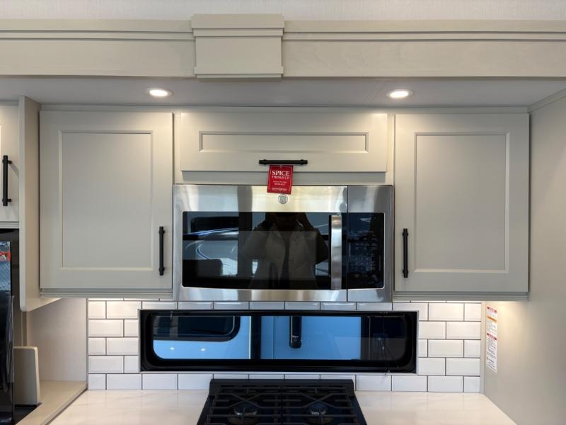 Traveling for long periods at a time is made easy with this gourmet kitchen that can feed your entire group a holiday meal! The professional-grade stainless steel cooktop with a built-in oven, microwave, 12V 20 cu. ft. refrigerator, and a kitchen island offers everything you will need to enjoy cooking for your family and guests. There is abundant storage throughout multiple overhead cabinets, a kitchen pantry and hutch, a bath linen cabinet for your towels, and in the front master bedroom which features a large closet. In the bedroom there is also a queen bed slide for added space to sleep comfortable at night, or you may choose an optional king bed if you enjoy more space. You will also find a closet with washer/dryer prep, large wardrobe, a clothes hamper plus a slide top dresser. Two nice awnings will provide outdoor living space keeping you protected from the sun and rain, and you can add an optional pull-out kitchen to enjoy convenient cooking outdoors as well.