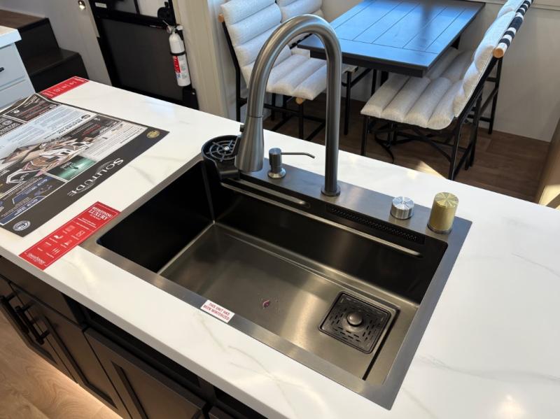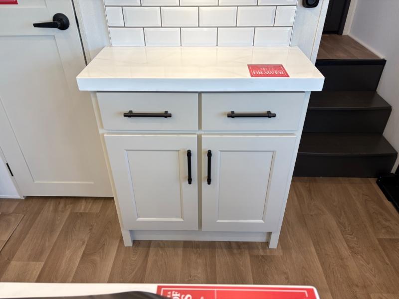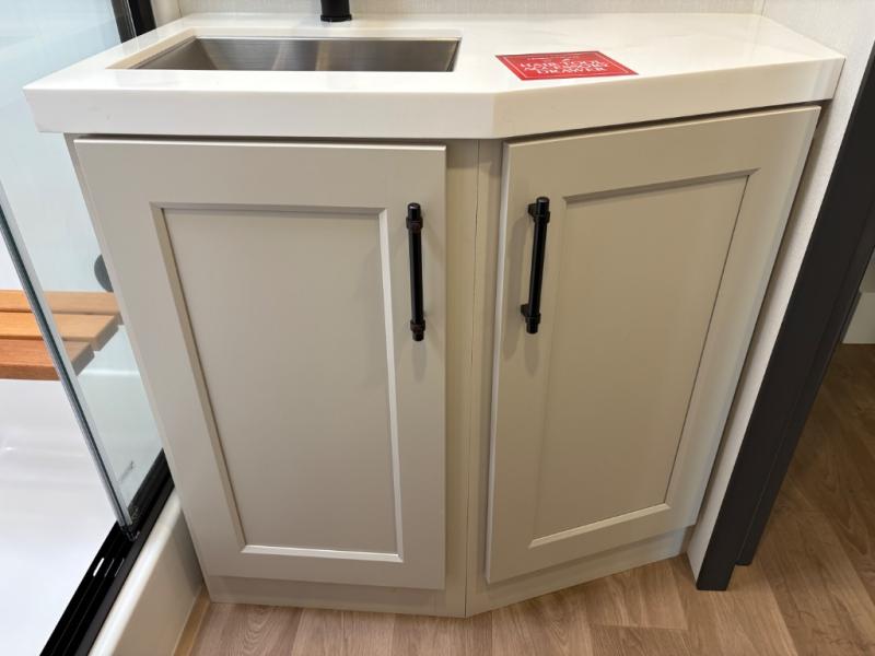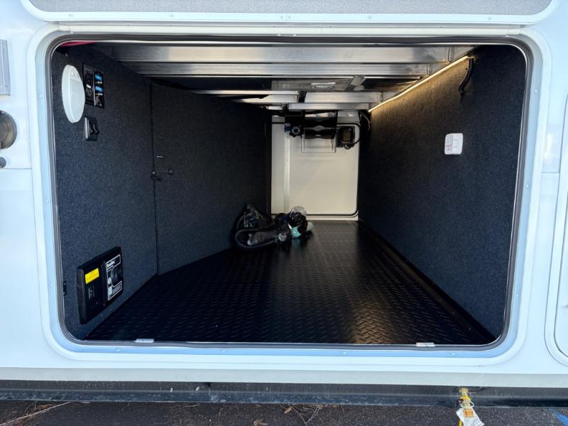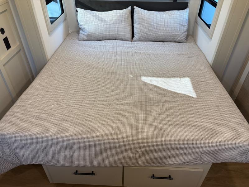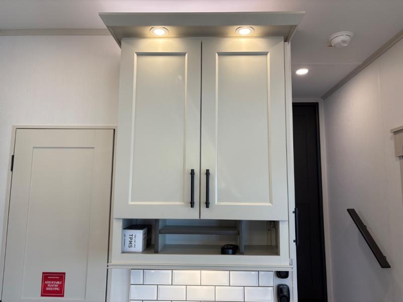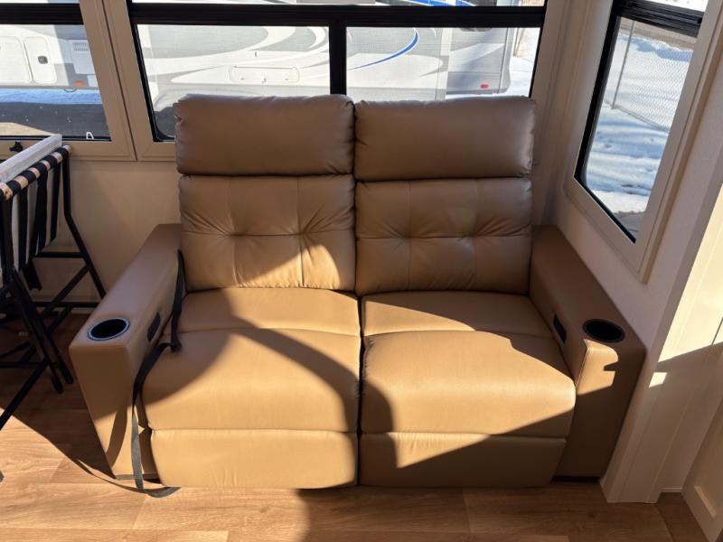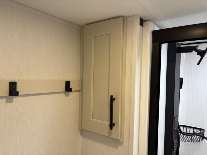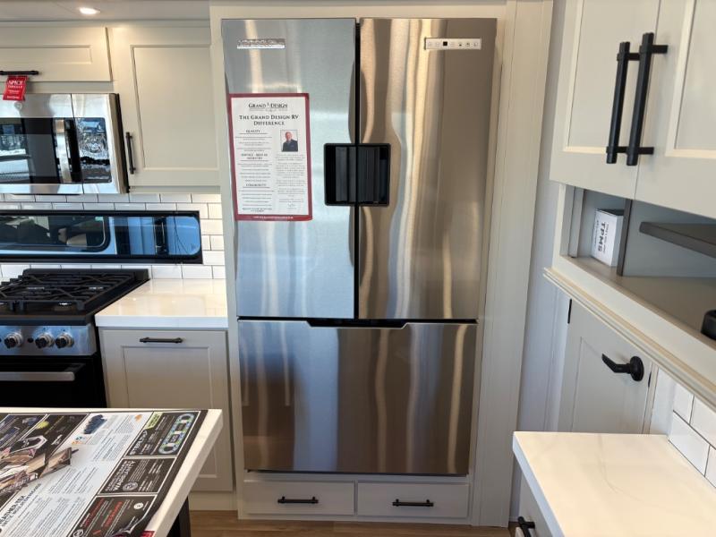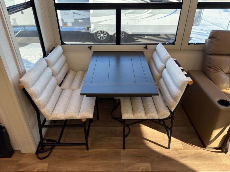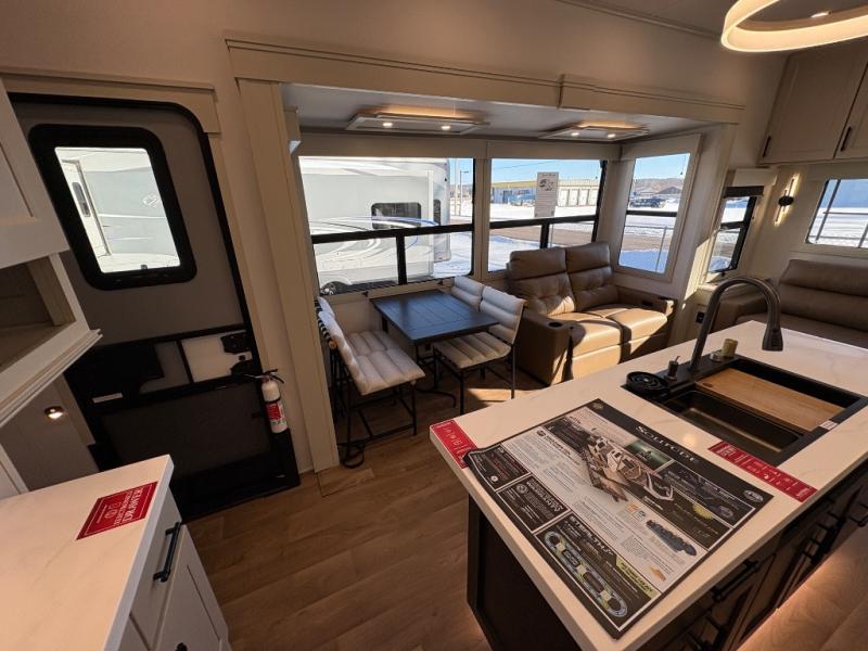 Traveling for long periods at a time is made easy with this gourmet kitchen that can feed your entire group a holiday meal! The professional-grade stainless steel cooktop with a built-in oven, microwave, 12V 20 cu. ft. refrigerator, and a kitchen island offers everything you will need to enjoy cooking for your family and guests. There is abundant storage throughout multiple overhead cabinets, a kitchen pantry and hutch, a bath linen cabinet for your towels, and in the front master bedroom which features a large closet. In the bedroom there is also a queen bed slide for added space to sleep comfortable at night, or you may choose an optional king bed if you enjoy more space. You will also find a closet with washer/dryer prep, large wardrobe, a clothes hamper plus a slide top dresser. Two nice awnings will provide outdoor living space keeping you protected from the sun and rain, and you can add an optional pull-out kitchen to enjoy convenient cooking outdoors as well.