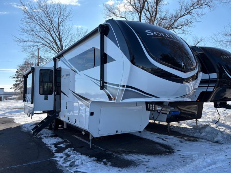 Each Solitude fifth wheel by Grand Design features a 101" wide-body construction, heavy duty 8,000 lb. axles, frameless tinted windows, and high-gloss gel coat sidewalls. You can camp year around thanks to the Weather-Tek Package that includes a 35K BTU high-capacity furnace, an all-in-one enclosed and heated utility center, and a fully enclosed underbelly with heated tanks and storage. Inside, you'll love the premium roller shades, hardwood cabinet doors, solid surface countertops, plus residential finishes throughout to make you truly feel at home. Each model also includes a MORryde CRE3000 suspension system, self adjusting brakes, and a MORryde pin box that will provide smooth towing from home to campground. Affordable luxury is possible with the Solitude fifth wheels; choose yours today!