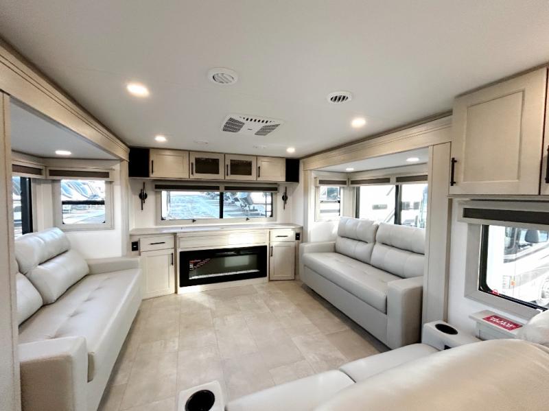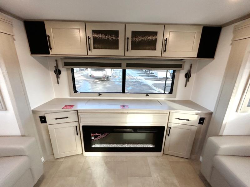 Each minute spent in this spacious fifth wheel will feel just like home! The rear living area includes a rear entertainment center with an LED Smart TV and a fireplace, overhead cabinets, theater seating, plus two tri-fold sofas for your guests to sleep on. You will have the front private bedroom all to yourselves with a queen bed slide out that can be switched out for an optional king bed, and the front closet provides all the space you need to store your belongings. This model includes a spacious full bath plus dual bath sinks for ultimate convenience. The chef of your group will love the middle kitchen with its convenient island including double sinks, a residential cooktop and built-in oven, 20 cu. ft. refrigerator, and free-standing dinette. Head outdoors to find a 16' power awning with LED lights and middle pass through along with rear storage including a sliding tray, and you might want to add the optional pull-out kitchen.