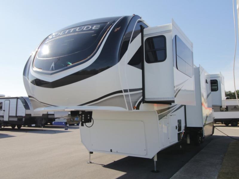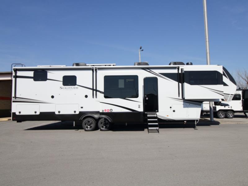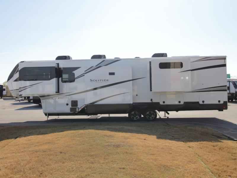 Experience residential-style luxury on the road with the Grand Design Solitude 380FL fifth wheel, a premium RV built for extended travel, full-time living, and destination camping comfort. With five slide-outs and a spacious 101" wide-body design, this model delivers exceptional interior space, upscale finishes, and smart storage from front to rear.