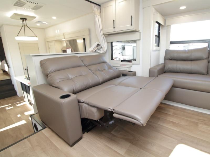 Enjoy spacious luxury with the Grand Design Solitude 380FL, featuring a private front living room and a rear full bath with dual-sink vanity for ultimate comfort on the road.