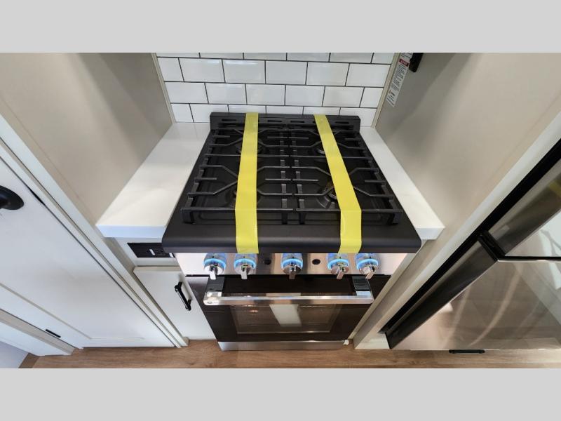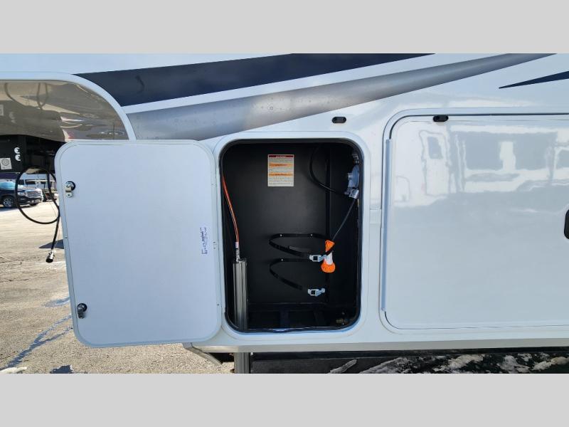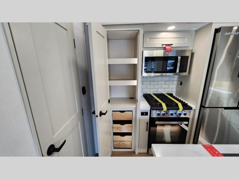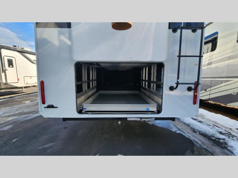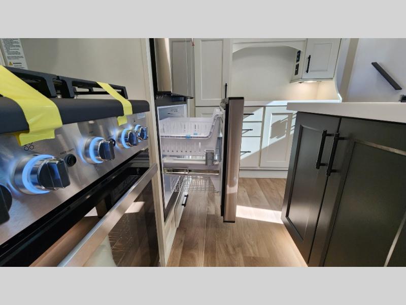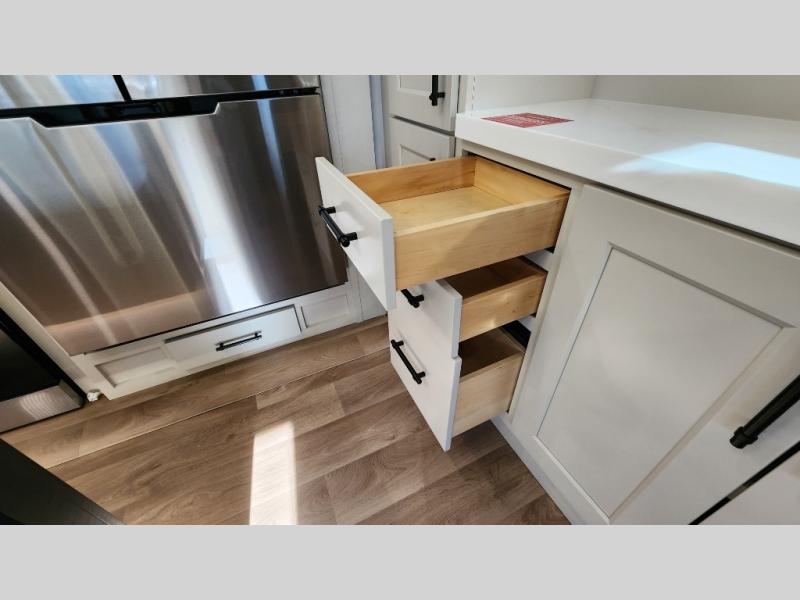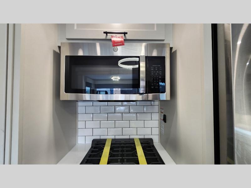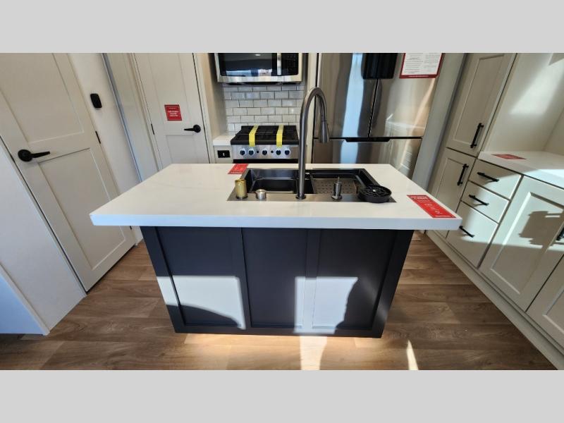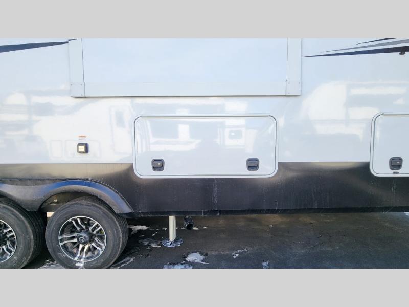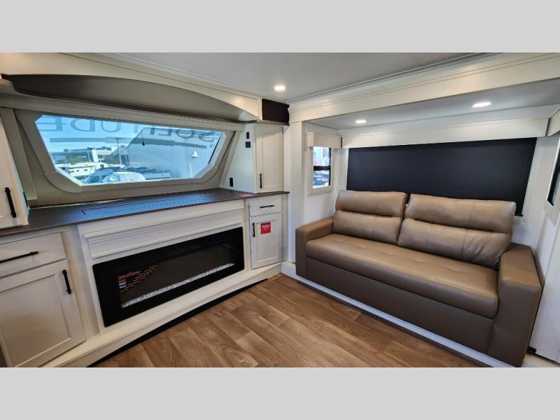 The standout front living layout offers a private, spacious area ideal for relaxing or entertaining. With multiple slide-outs and a wide-body design, this fifth wheel feels open and inviting from the moment you step inside.
