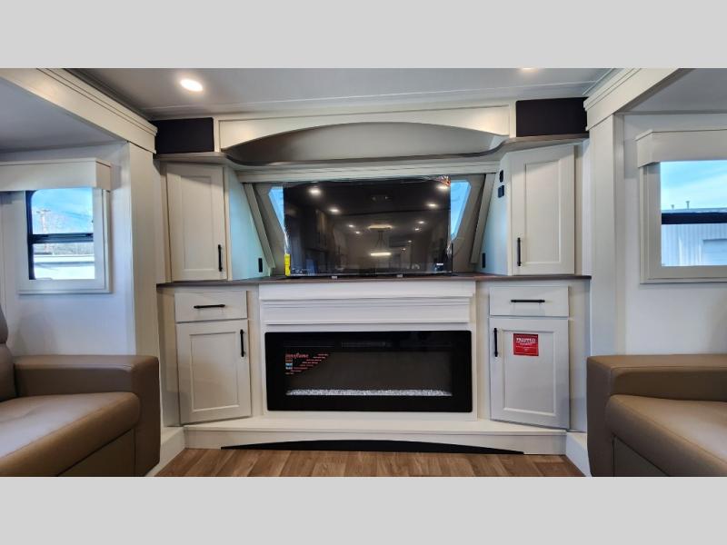 This Unit Includes $39,070 in Options Featuring a Kitchen Island; Pantry; Hutch; Stainless Steel Appliances; Fireplace; Dual Tri-Fold Sofas; Full AND Half Bath; Heated Pass-Through Storage with Sliding Tray; MORryde Suspension System and More!
