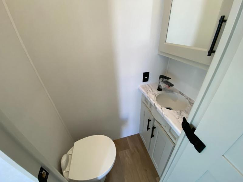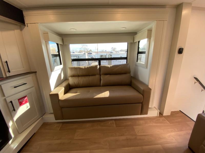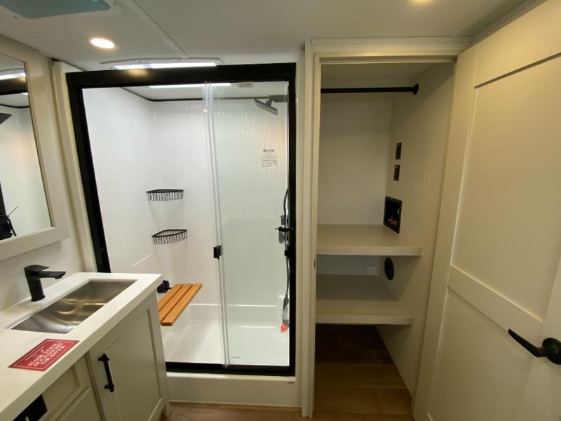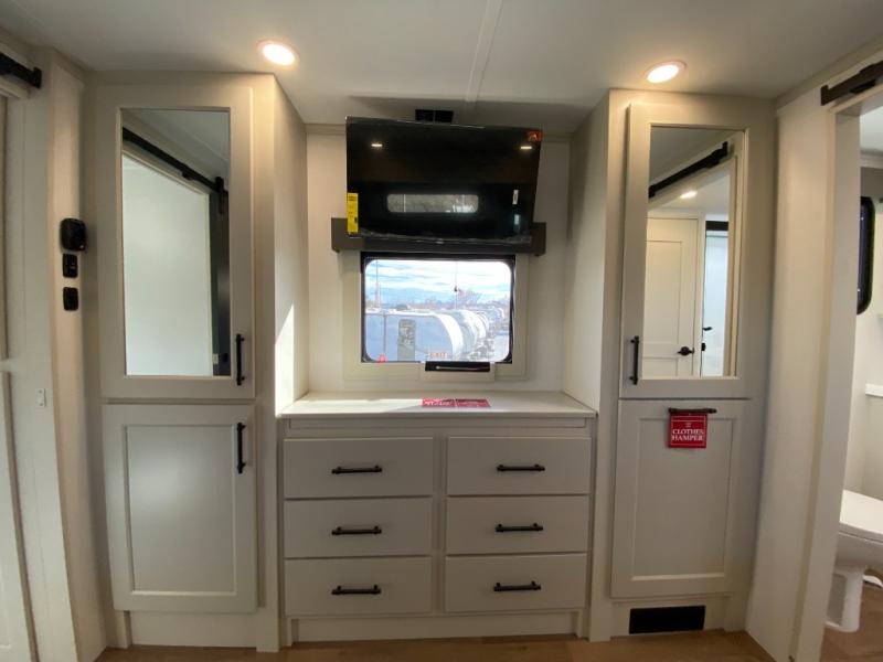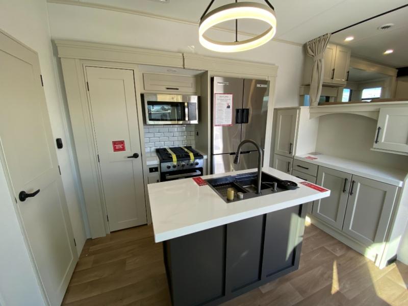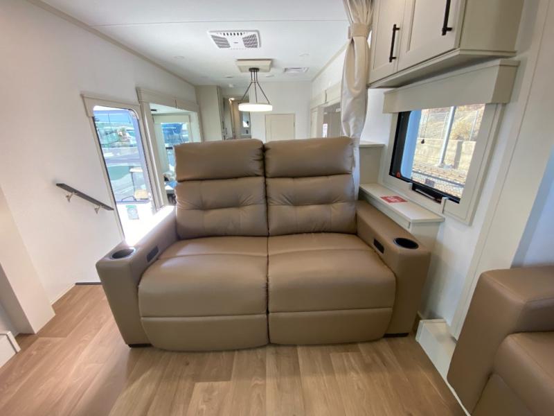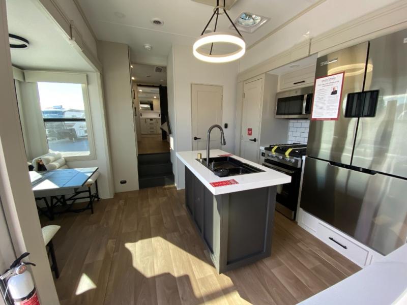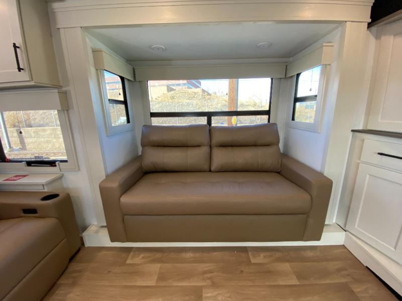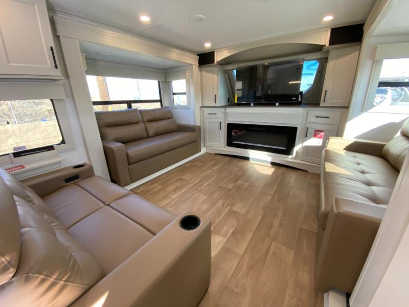 Five slide outs, a full bathroom with dual sinks, a half bath off of the kitchen, and a separate front living room and entertainment area are a few reasons you will enjoy your time spent in this fifth wheel! The separate kitchen is a dream with stainless steel appliances including a built-in oven, a pantry and hutch with counter space, a kitchen island plus a free-standing dinette slide with windows for great views. The entertainment center offers an LED Smart TV with a fireplace below and storage, and the dual opposing tri-fold sofas provide added sleeping space at night. The master bedroom includes a queen bed plus space savings sliding doors that lead you to the rear full bathroom with dual sinks, linen storage, and washer/dryer prep. The exterior has several storage choices as well including a pass-through storage compartment for fishing poles and such, plus the unique sliding tray in the rear allows you to bring along larger items such as camping tables, portable grills, golf clubs, totes and more.