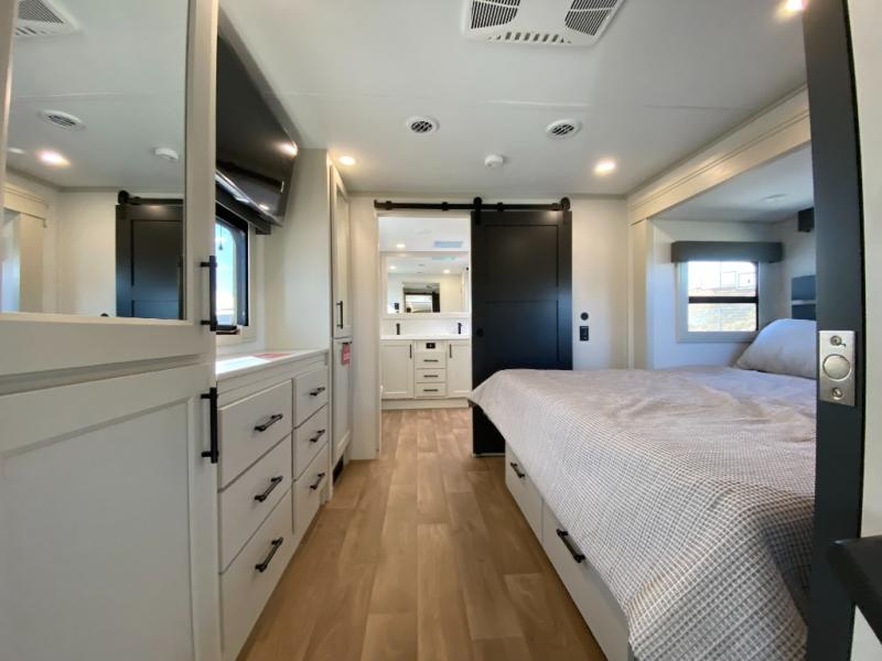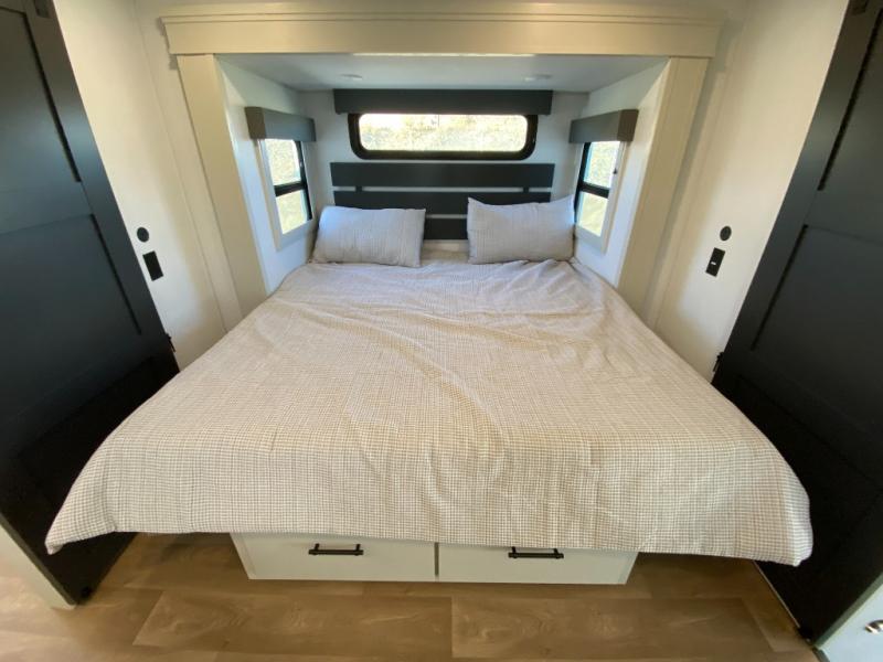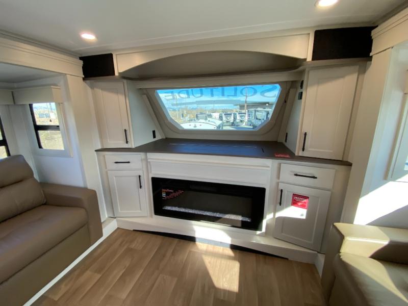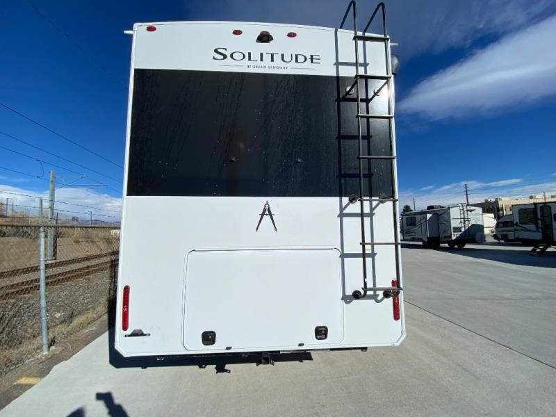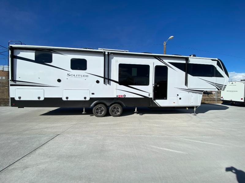 Each Solitude fifth wheel by Grand Design features a 101" wide-body construction, heavy duty 8,000 lb. axles, frameless tinted windows, and high-gloss gel coat sidewalls. You can camp during harsh weather thanks to the Weather-Tek Package that includes a 35K BTU high-capacity furnace, an all-in-one enclosed and heated utility center, and a fully enclosed underbelly with heated tanks and storage. Inside, you'll love the premium roller shades, hardwood cabinet doors, solid surface countertops, plus residential finishes throughout to make you truly feel at home. Each model also includes a MORryde CRE3000 suspension system, and a MORryde pin box that will provide smooth towing from home to campground. Affordable luxury is possible with the Solitude fifth wheels; choose yours today!