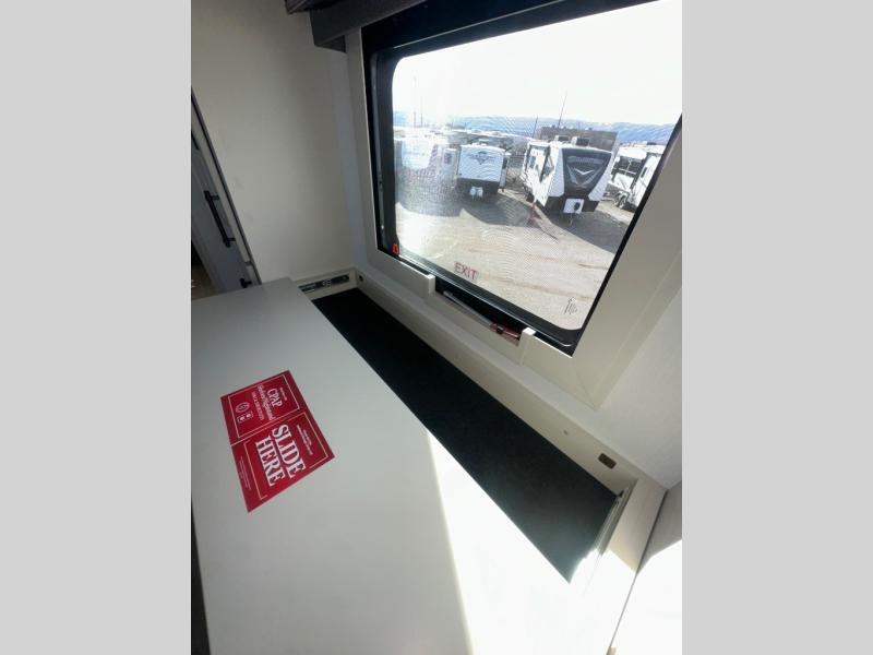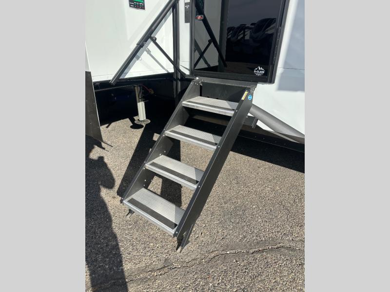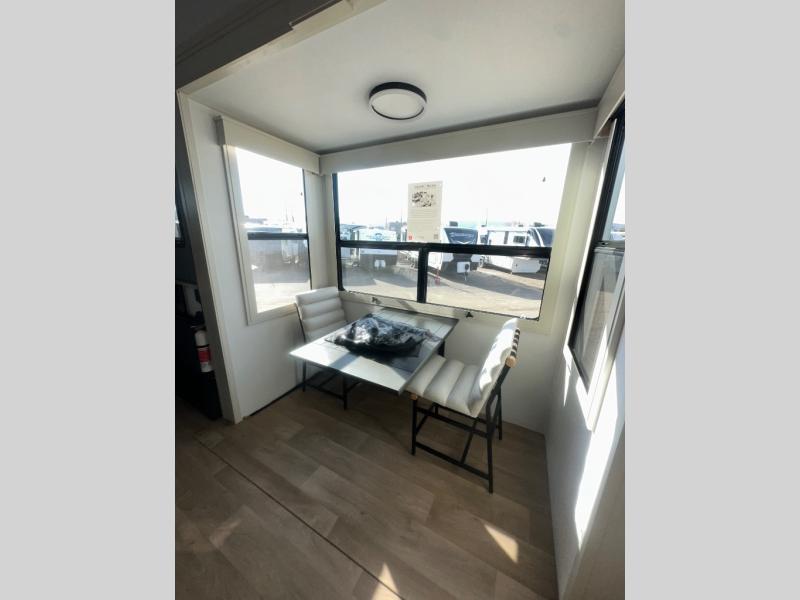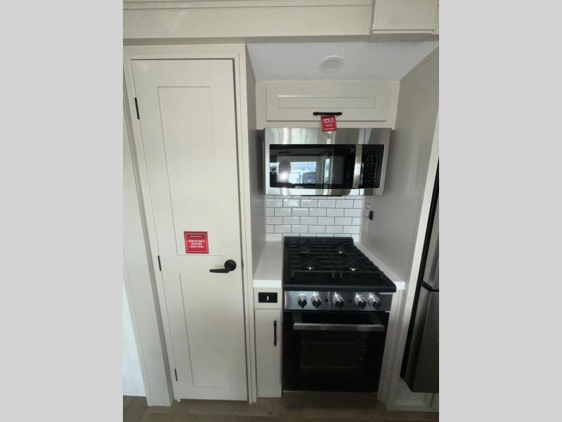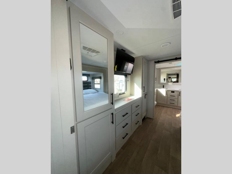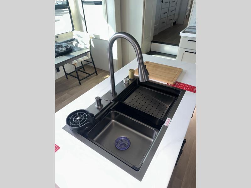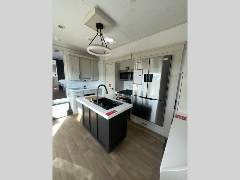 If you enjoy entertaining while camping, you will love this setup with a wet bar including a beverage cooler, a kitchen island to set snacks on, and a hutch for storing dishes. And, the gourmet kitchen appliances with a built-in oven along with a 20 cu. ft. refrigerator allow you to cook any meal for your family and friends. The separate front living room is spacious with dual opposing tri-fold sofa slides and theater seating, and a front wall with an LED telescoping TV and fireplace below plus storage for entertaining. You will have your own master bedroom with a queen bed slide, wardrobes, plus sliding doors that lead into the private master bath. Here you will find dual sinks, a shower with a seat, plus washer/dryer prep which is great for when you plan to stay awhile.