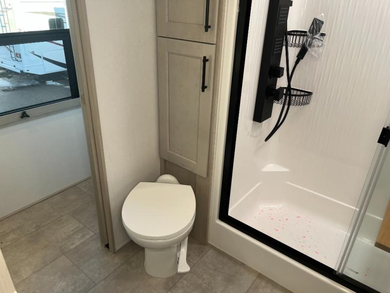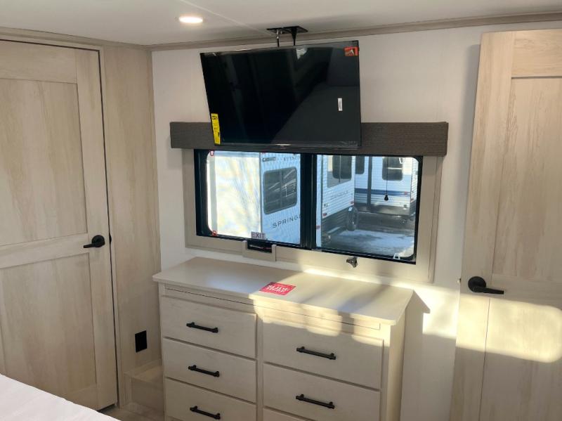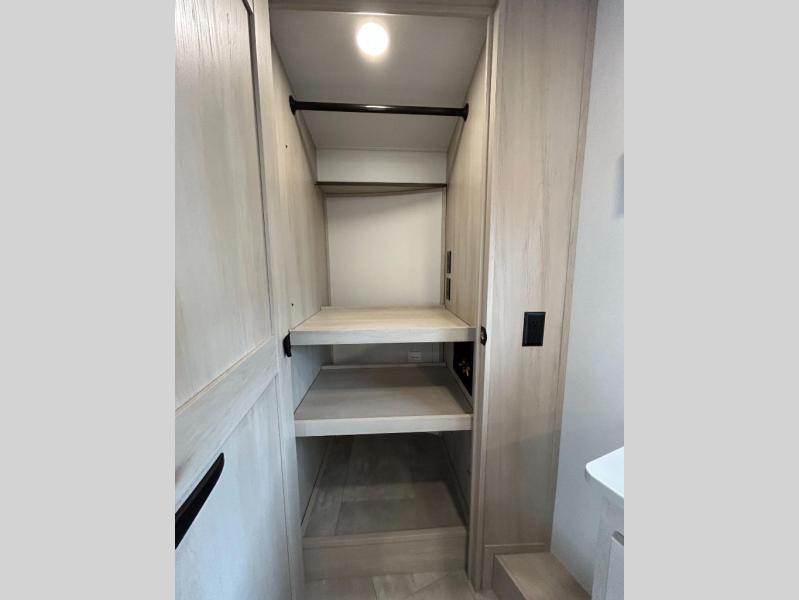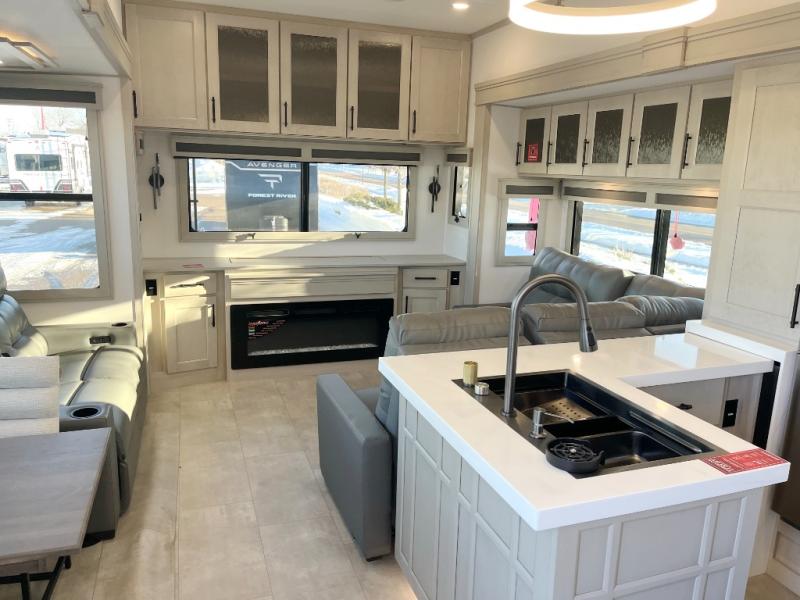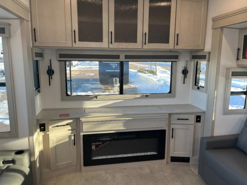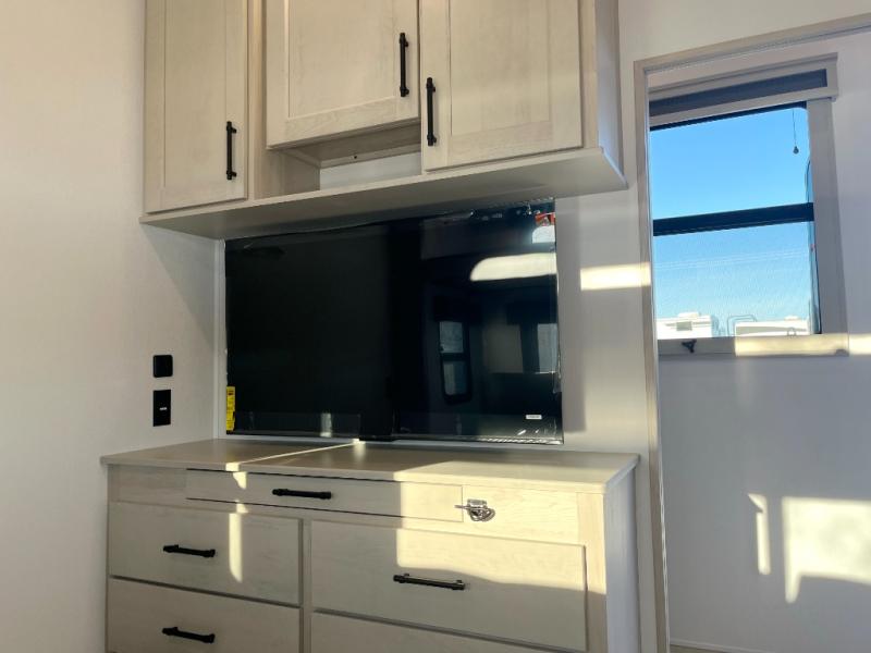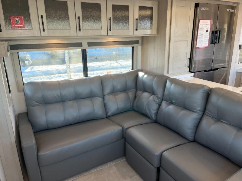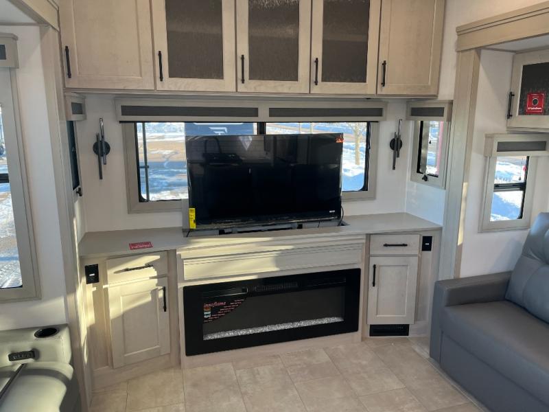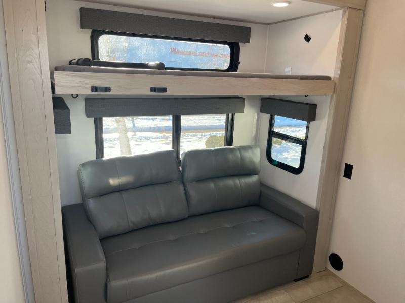 The whole gang will love camping in this spacious fifth wheel for five to six! You'll have your own bedroom up front with a queen bed slide out, a large front closet with a hamper and washer and dryer prep, plus a private entry door into the dual entry bath. Your guest can take the middle bedroom that includes a tri-fold sofa with a bunk above, a dresser/desk, plus a 50" TV for entertainment. A full kitchen includes an L-shaped counter, a 20 cu. ft. refrigerator, pull-out trash cans plus many more convenient features. And don't overlook the rear living area with its L-shaped sofa, theater seating, and free-standing dinette. There is also an entertainment center with a telescoping TV and a fireplace plus an electronics drawer to charge your phone or laptop.