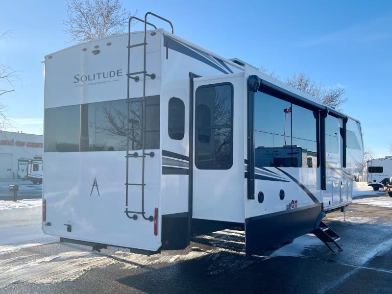 Each Solitude fifth wheel by Grand Design features a 101" wide-body construction, heavy duty 8,000 lb. axles, frameless tinted windows, and high-gloss gel coat sidewalls. You can camp year around thanks to the Weather-Tek Package that includes a 35K BTU high-capacity furnace, an all-in-one enclosed and heated utility center, and a fully enclosed underbelly with heated tanks and storage. Inside, you'll love the premium roller shades, hardwood cabinet doors, solid surface countertops, plus residential finishes throughout to make you truly feel at home. Each model also includes a MORryde CRE3000 suspension system, self adjusting brakes, and a MORryde pin box that will provide smooth towing from home to campground. Affordable luxury is possible with the Solitude fifth wheels; choose yours today!