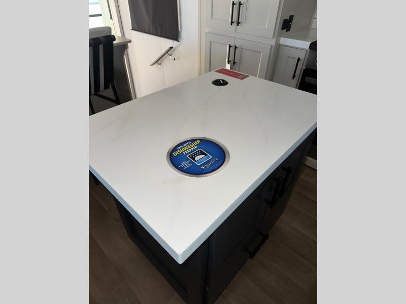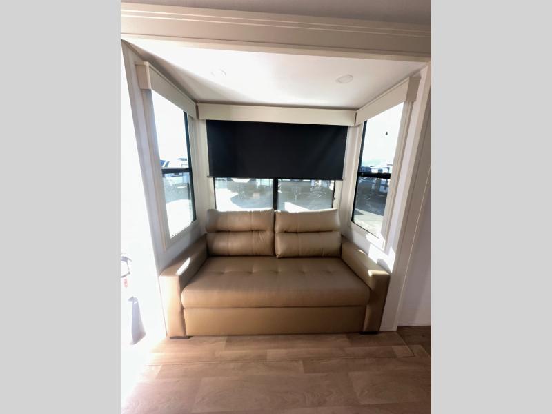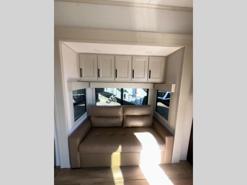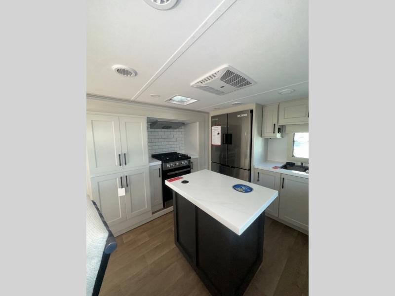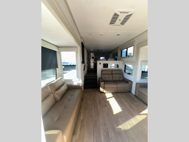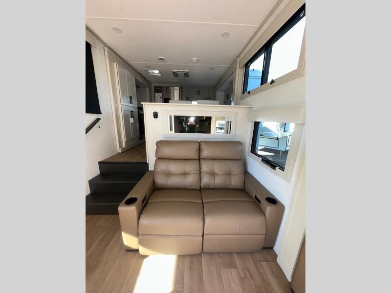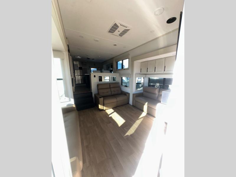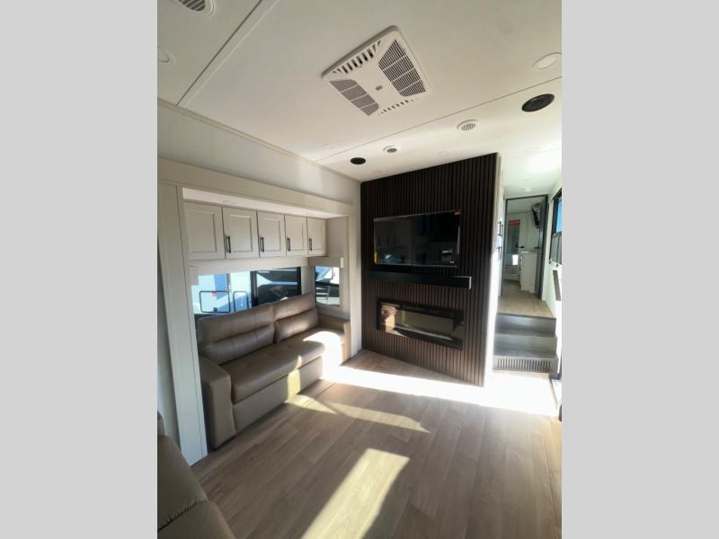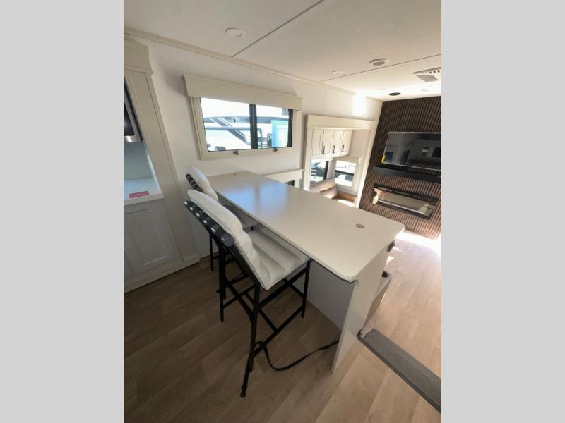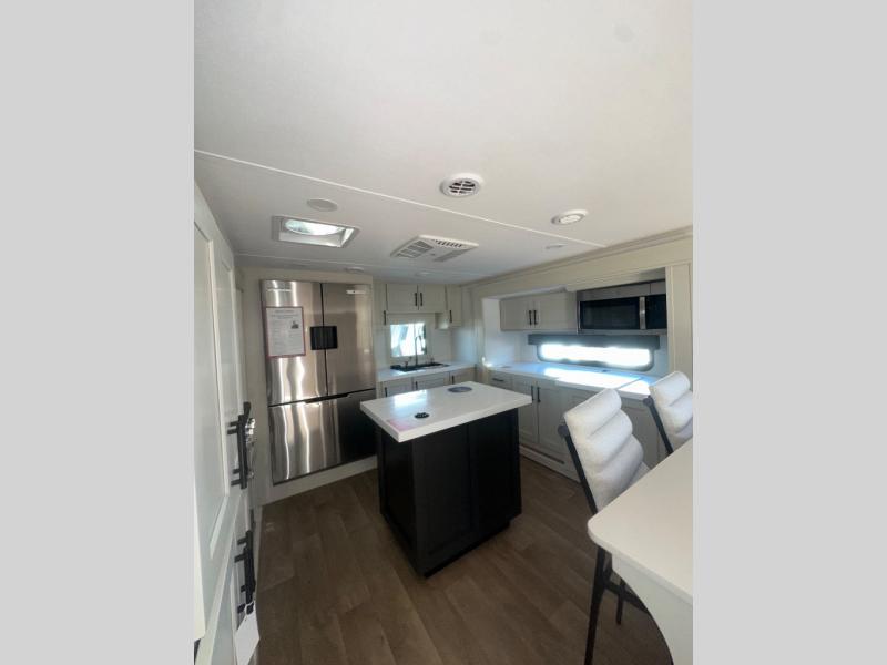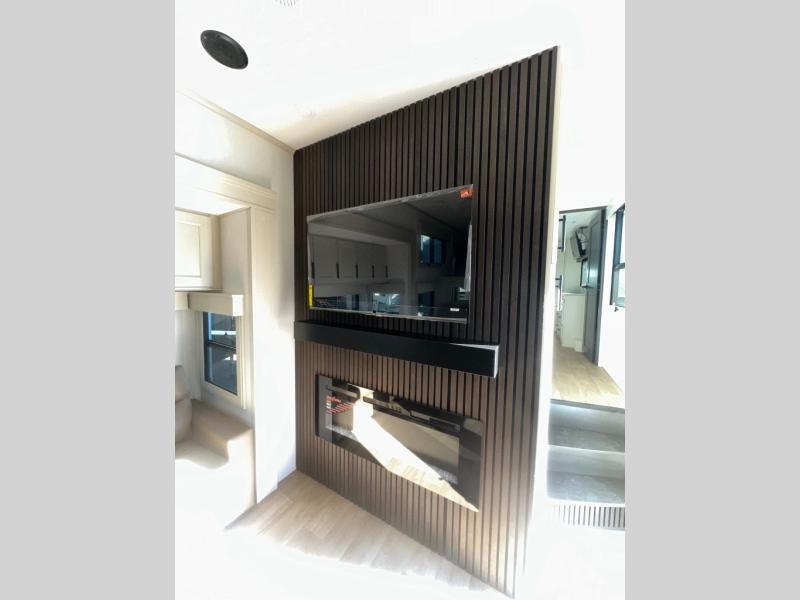 Enjoy each and every vacation, month-long trips, or even extended stays at an RV park in this spacious fifth wheel! The raised rear kitchen gives the cook plenty of room to whip up any type of meal using the stainless steel appliances including a built-in oven, an oversized pantry, and the raised bar top will provide you even more counter space on top of dining with two chairs that overlook the middle living area. Relaxing is made easy thanks to two tri-fold sofas and theatre seating while watching the big game on the LED Smart TV and enjoying the fireplace below. At night, retire to your own queen bed which slides out to provide more floor space, and you can store your clothes in the slide top dresser and front closet with washer and dryer prep.