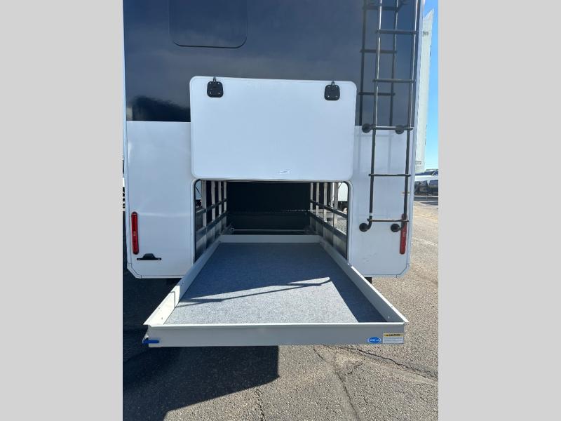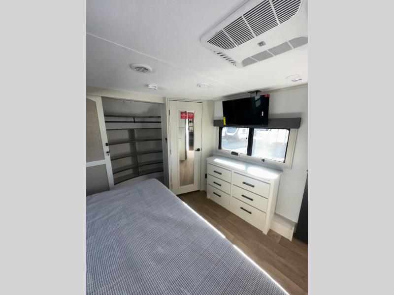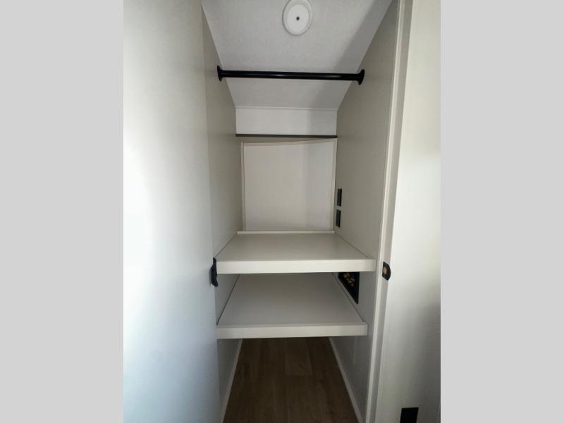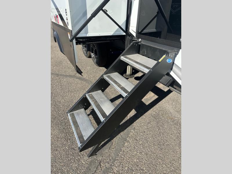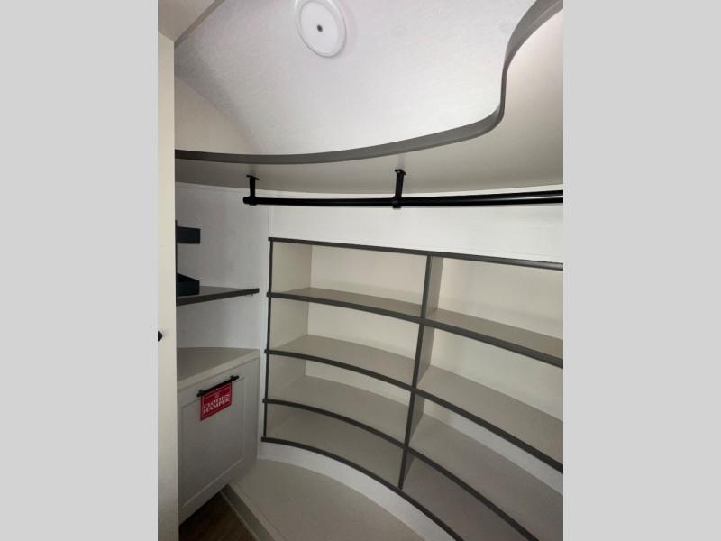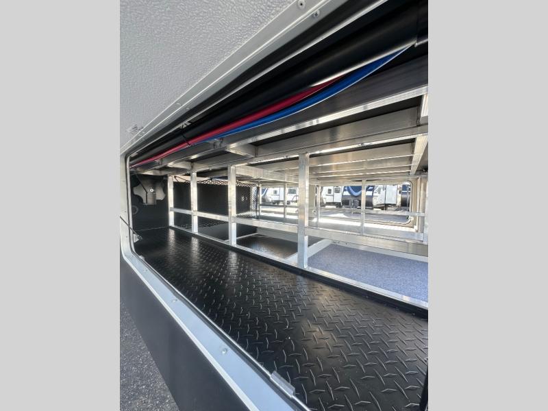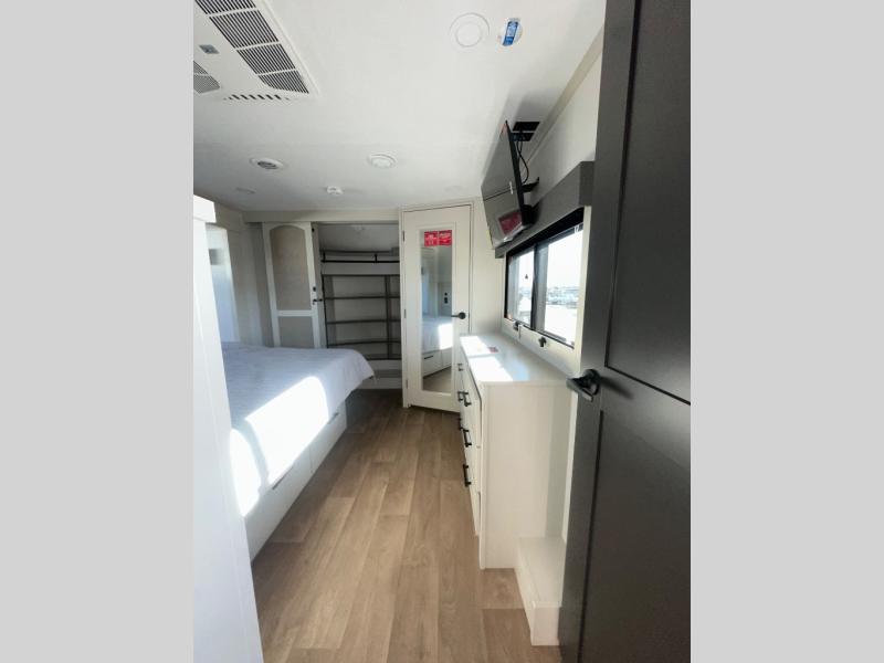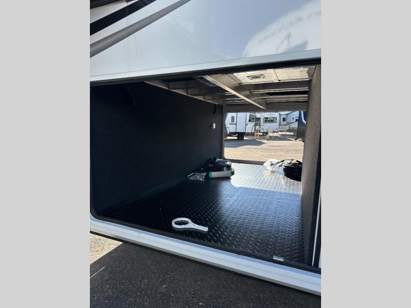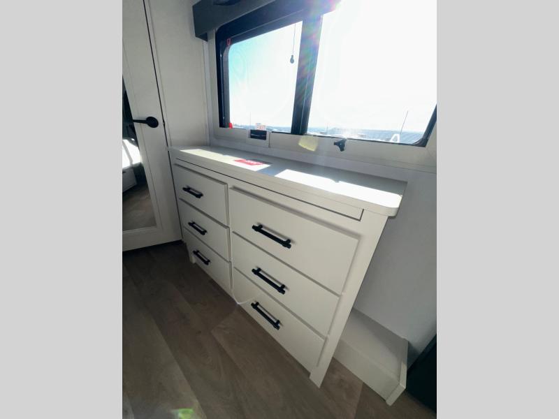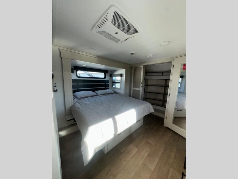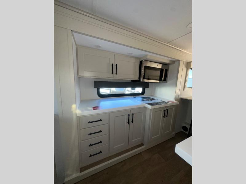 Enjoy each and every vacation, month-long trips, or even extended stays at an RV park in this spacious fifth wheel! The raised rear kitchen gives the cook plenty of room to whip up any type of meal using the stainless steel appliances including a built-in oven, an oversized pantry, and the raised bar top will provide you even more counter space on top of dining with two chairs that overlook the middle living area. Relaxing is made easy thanks to two tri-fold sofas and theatre seating while watching the big game on the LED Smart TV and enjoying the fireplace below. At night, retire to your own queen bed which slides out to provide more floor space, and you can store your clothes in the slide top dresser and front closet with washer and dryer prep.