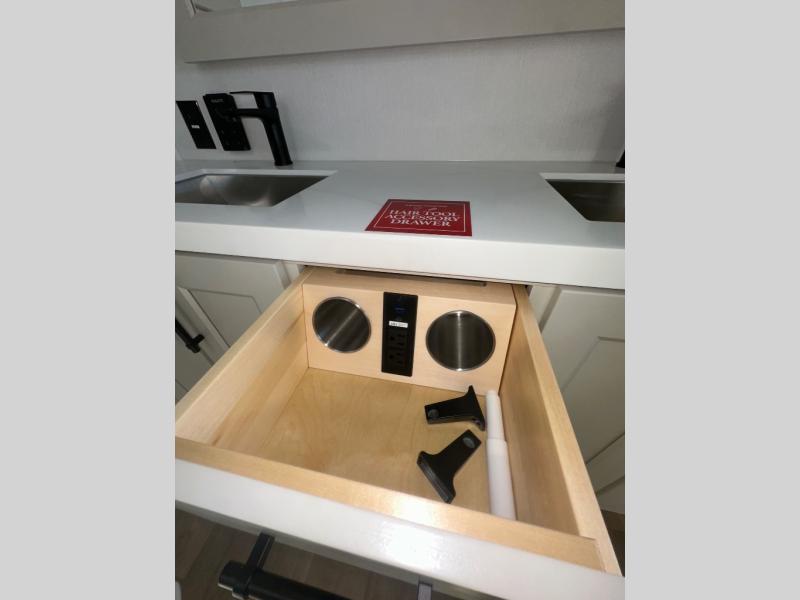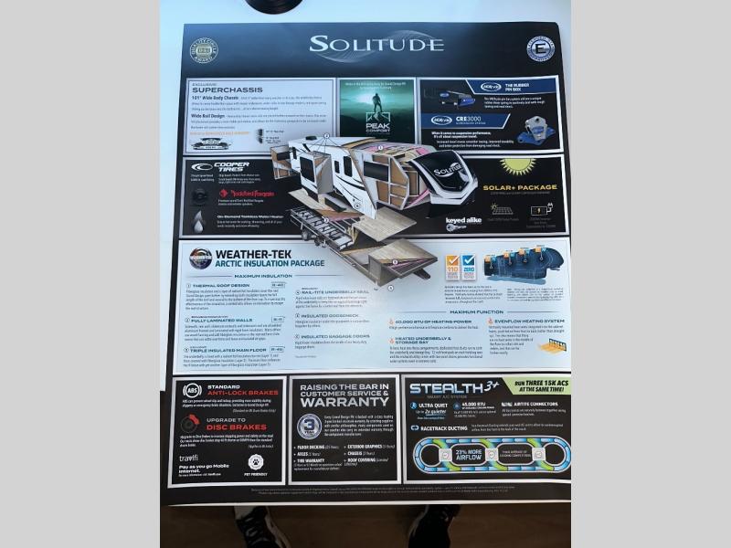 Each Solitude fifth wheel by Grand Design features a 101" wide-body construction, heavy duty 8,000 lb. axles, frameless tinted windows, and high-gloss gel coat sidewalls. You can camp year around thanks to the Weather-Tek Package that includes a 35K BTU high-capacity furnace, an all-in-one enclosed and heated utility center, and a fully enclosed underbelly with heated tanks and storage. Inside, you'll love the premium roller shades, hardwood cabinet doors, solid surface countertops, plus residential finishes throughout to make you truly feel at home. Each model also includes a MORryde CRE3000 suspension system, self adjusting brakes, and a MORryde pin box that will provide smooth towing from home to campground. Affordable luxury is possible with the Solitude fifth wheels; choose yours today!