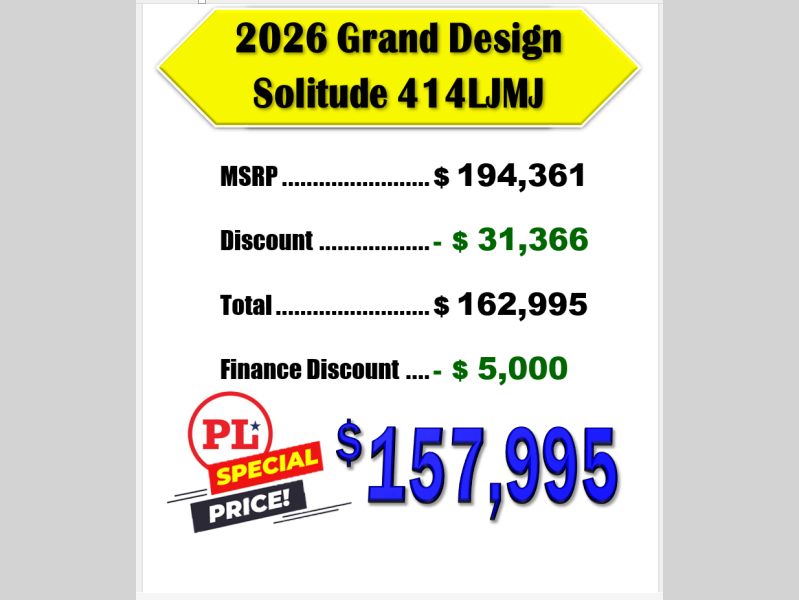 New 2026 Grand Design Solitude 414LJMJ Fifth Wheel
