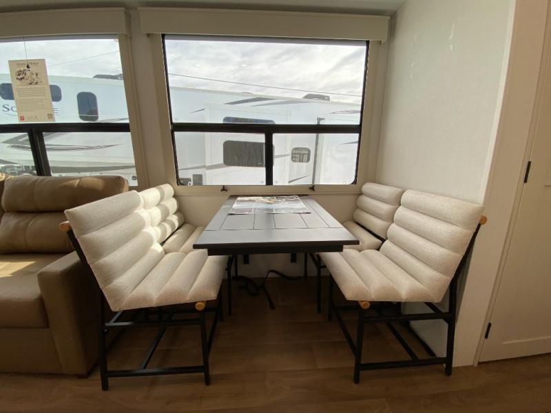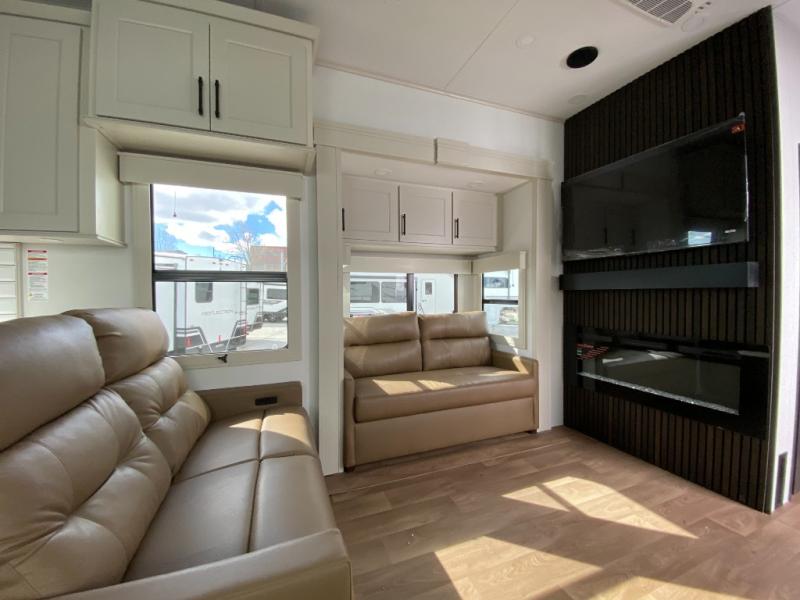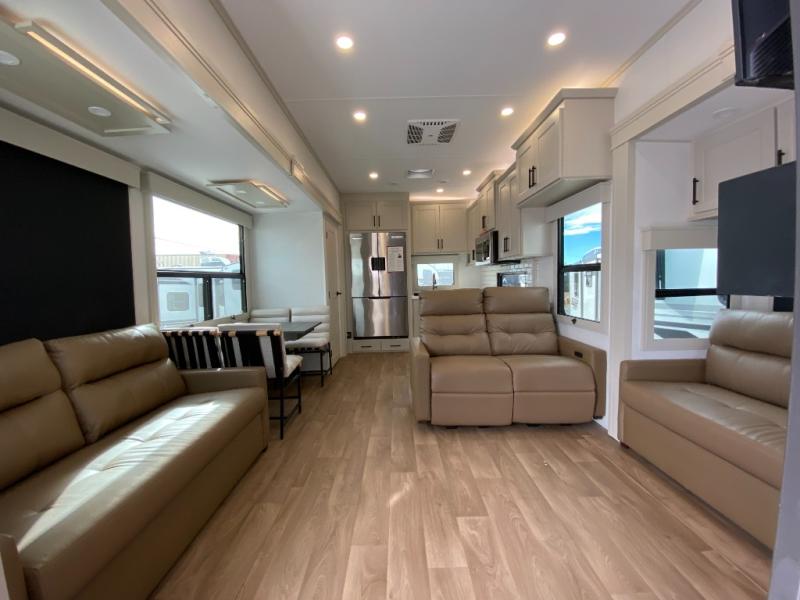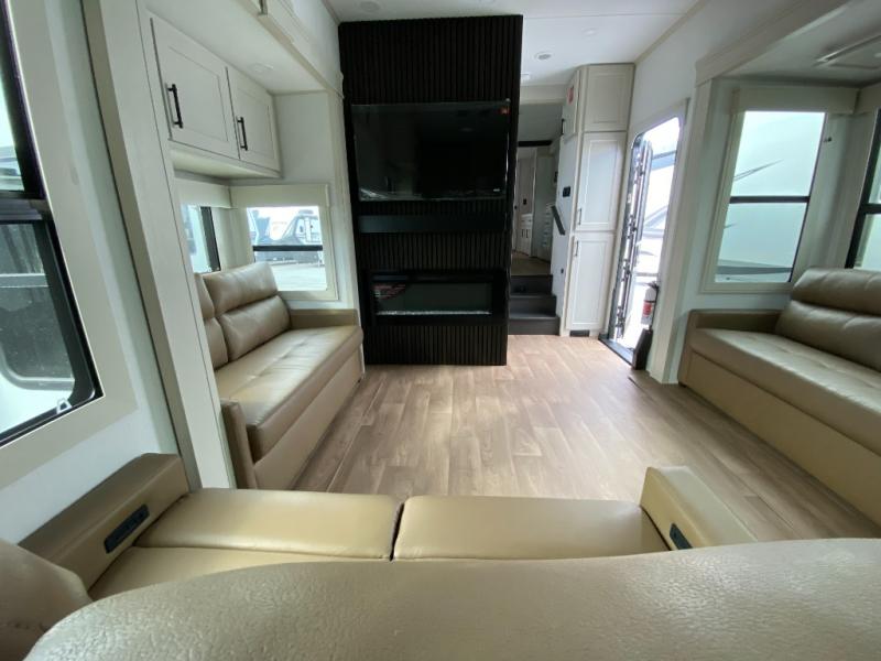 Comfort will come easy in this four slide out fifth wheel! You will feel right at home with a master bedroom that includes a queen bed slide out with a king bed option, dual dressers with a seat in between, plus a large front bath with tons of space. The convenient half bath is right as you enter the unit for convenience. Your crew can get cozy on the dual tri-fold sofas within dual opposing slides, or on the theater seating across from the LED TV and fireplace. One feature you will love about this fifth wheel is the rear kitchen with wrap-around counter space, a built-in oven, plus a 20 cu. ft. 12V refrigerator and a large pantry to keep food fresh.