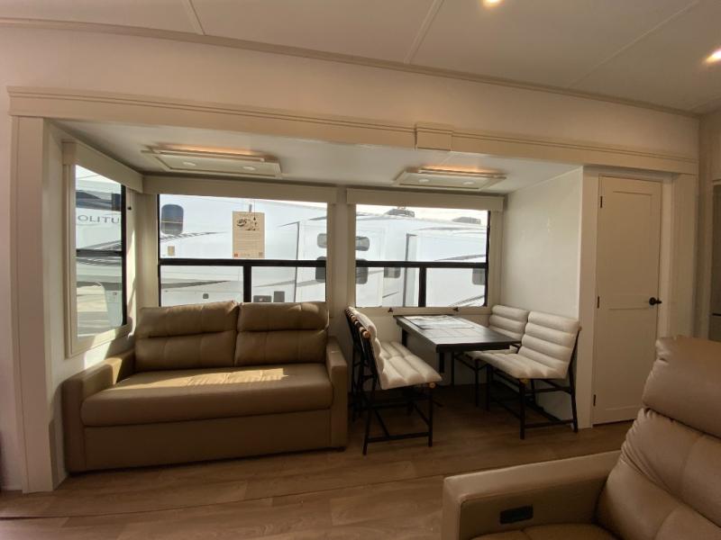 Each Solitude fifth wheel by Grand Design features a 101" wide-body construction, heavy duty 8,000 lb. axles, frameless tinted windows, and high-gloss gel coat sidewalls. You can camp year around thanks to the Weather-Tek Package that includes a 35K BTU high-capacity furnace, an all-in-one enclosed and heated utility center, and a fully enclosed underbelly with heated tanks and storage. Inside, you'll love the premium roller shades, hardwood cabinet doors, solid surface countertops, plus residential finishes throughout to make you truly feel at home. Each model also includes a MORryde CRE3000 suspension system, self adjusting brakes, and a MORryde pin box that will provide smooth towing from home to campground. Affordable luxury is possible with the Solitude fifth wheels; choose yours today!