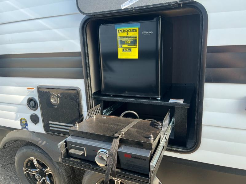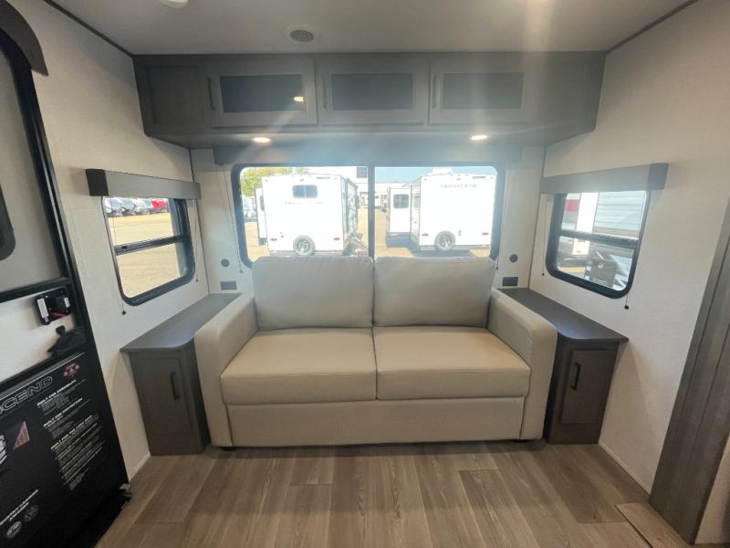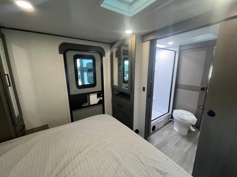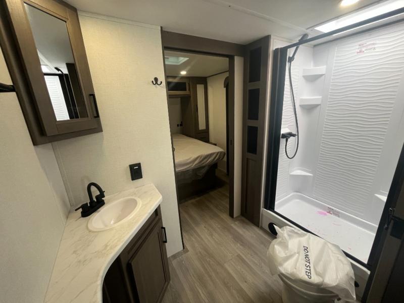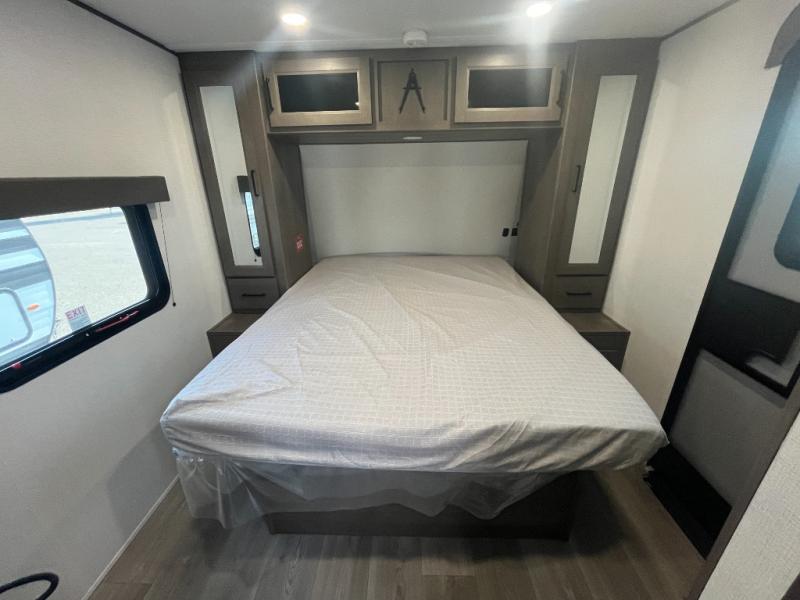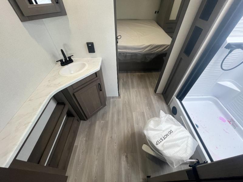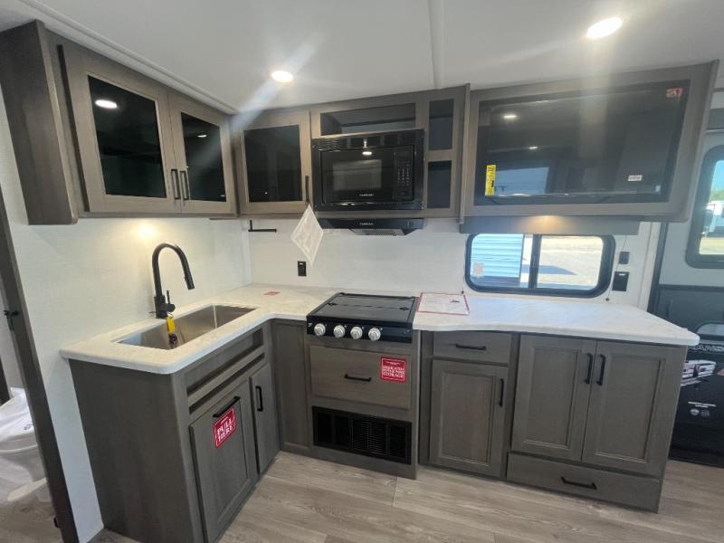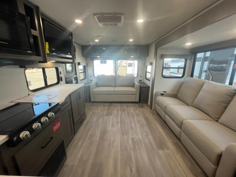 the amount of interior space you have in the living area thanks to the theater seats. The rear 70" sleeper sofa will be perfect for guests to sleep on, and the 32" TV lets you enjoy movie nights. There is a three burner range and convection microwave/combo air fryer to cook meals inside, or you can cook on the exterior griddle with a 1.7 cu. ft. refrigerator. And the 17' power awning will provide much wanted shade as you visit with friends. Back inside, the walk-thru bath is both spacious and convenient since it can be accessed from the main living area and the front master bedroom. Here, you'll find a queen bed, storage space, plus TV prep if you want to add a television. You even have your own exterior entry door for convenience!