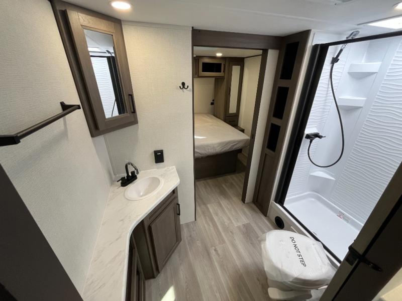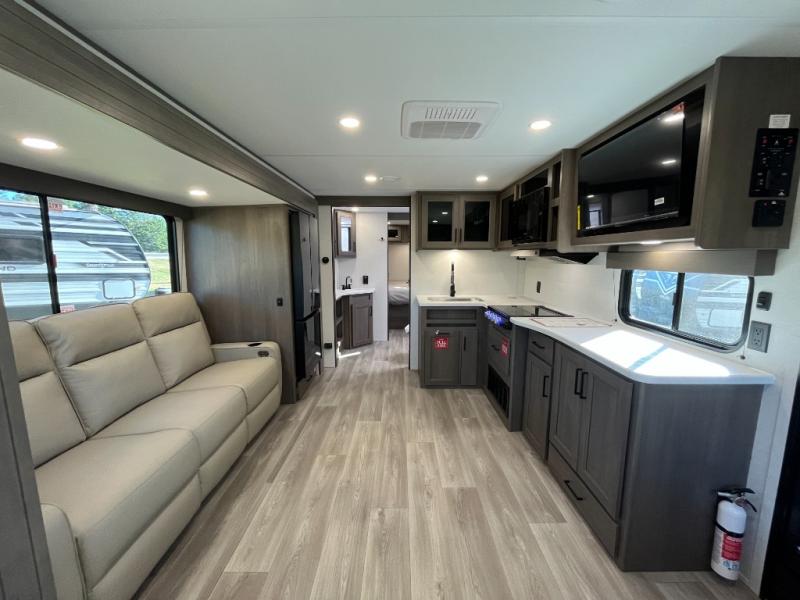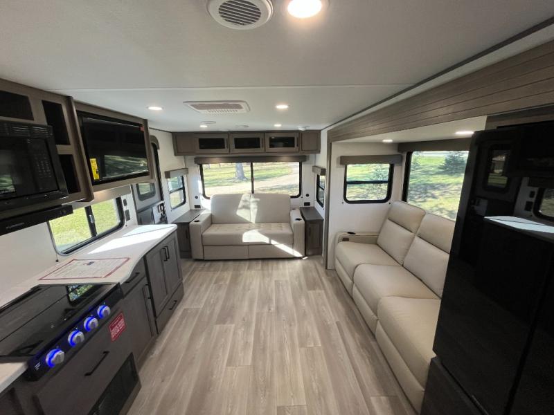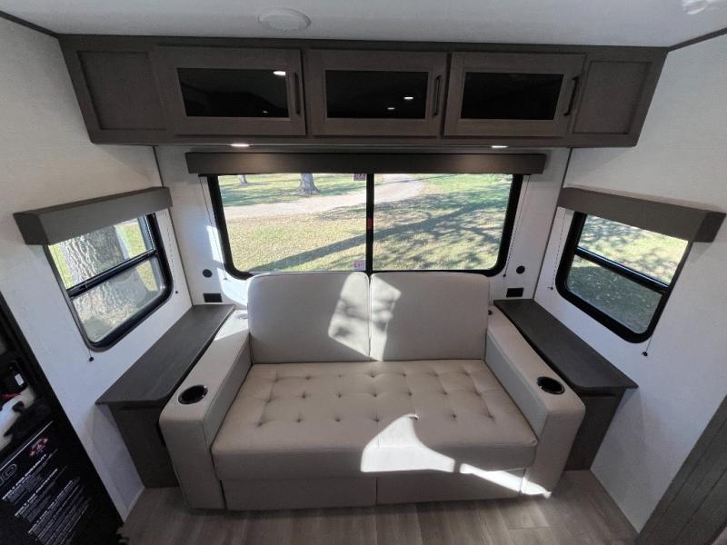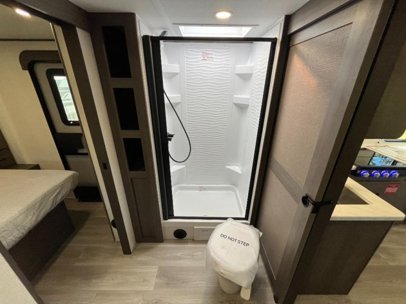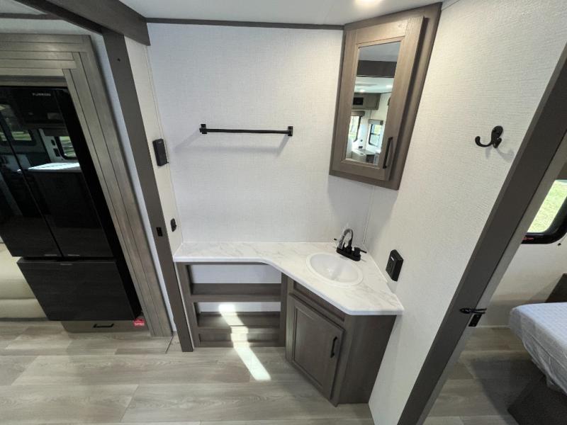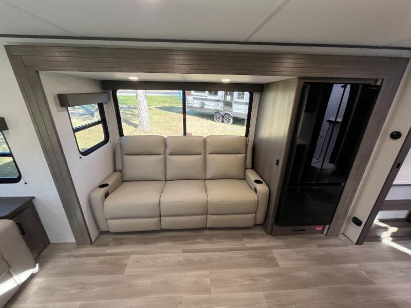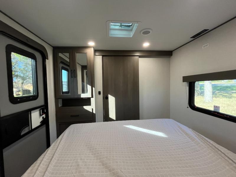 the amount of interior space you have in the living area thanks to the U-shaped dinette slide, which can be switched out for optional theater seats. The rear 70" sleeper sofa will be perfect for guests to sleep on, and the 32" TV lets you enjoy movie nights. There is a three burner range and convection microwave/combo air fryer to cook meals inside, or you can cook on the exterior griddle with a 1.7 cu. ft. refrigerator. And the 17' power awning will provide much wanted shade as you visit with friends. Back inside, the walk-thru bath is both spacious and convenient since it can be accessed from the main living area and the front master bedroom. Here, you'll find a queen bed, storage space, plus TV prep if you want to add a television. You even have your own exterior entry door for convenience!