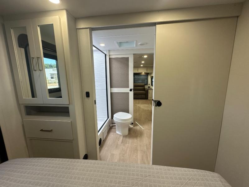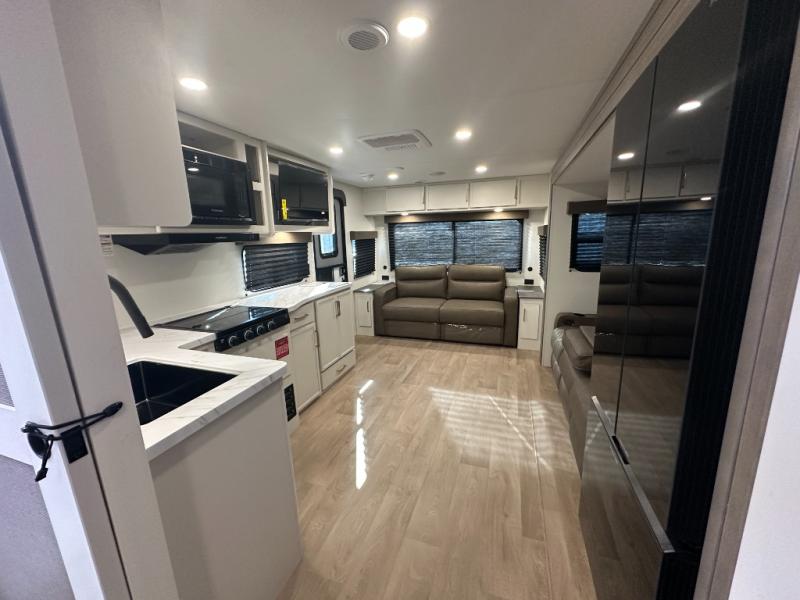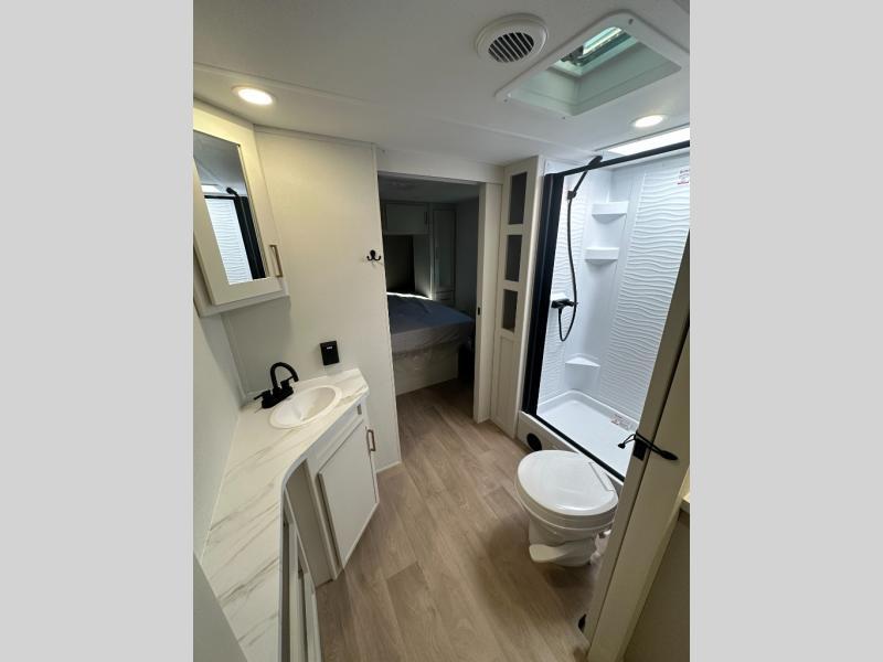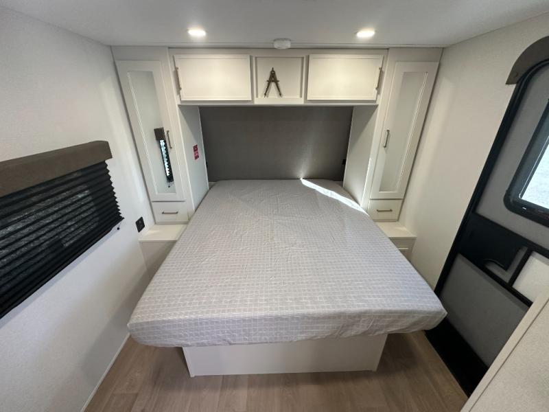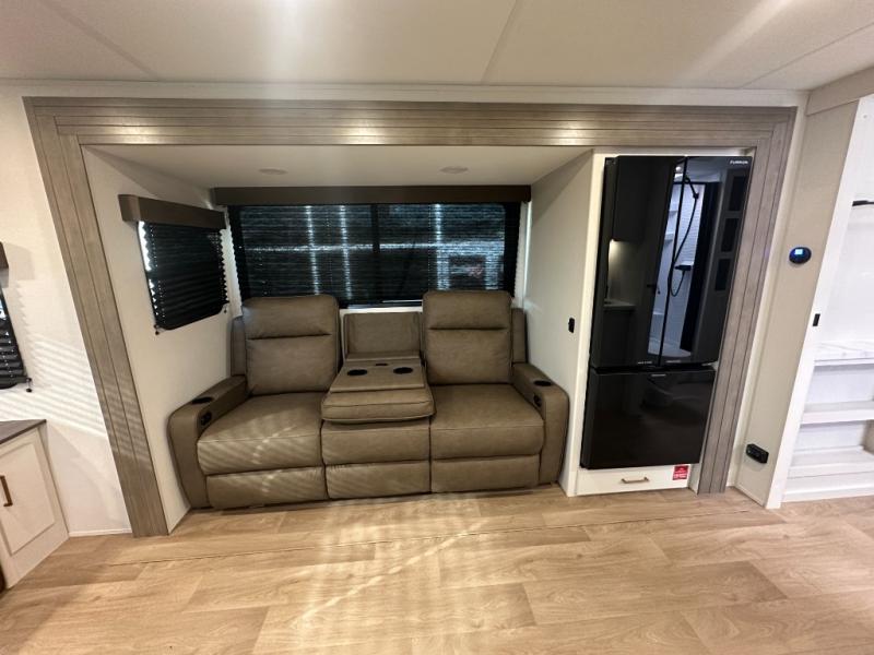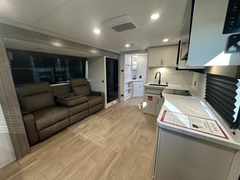 the amount of interior space you have in the living area thanks to the U-shaped dinette slide, which can be switched out for optional theater seats. The rear 70" sleeper sofa will be perfect for guests to sleep on, and the 32" TV lets you enjoy movie nights. There is a three burner range and convection microwave/combo air fryer to cook meals inside, or you can cook on the exterior griddle with a 1.7 cu. ft. refrigerator. And the 17' power awning will provide much wanted shade as you visit with friends. Back inside, the walk-thru bath is both spacious and convenient since it can be accessed from the main living area and the front master bedroom. Here, you'll find a queen bed, storage space, plus TV prep if you want to add a television. You even have your own exterior entry door for convenience!