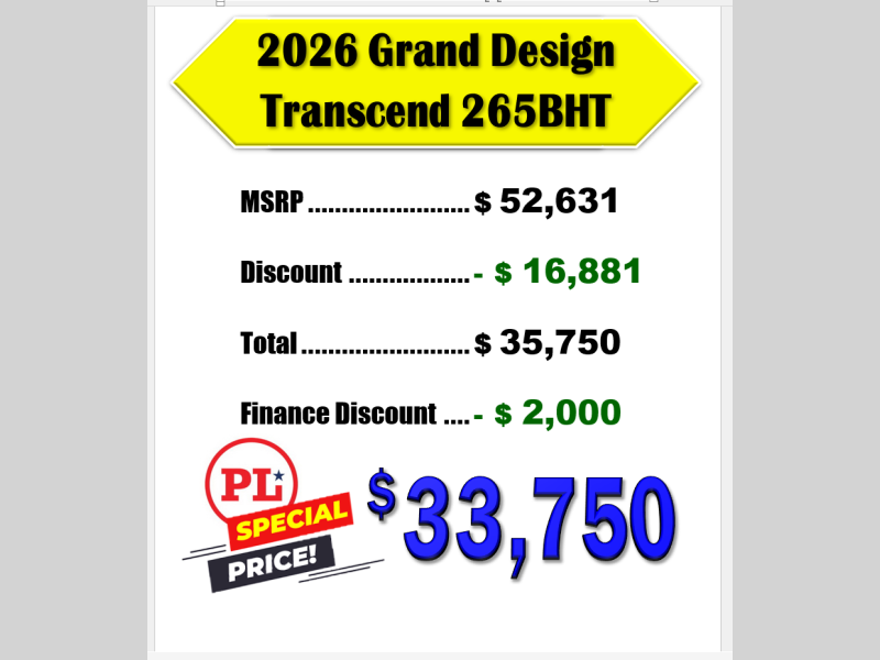 New 2026 Grand Design Transcend 265BHT Travel Trailer