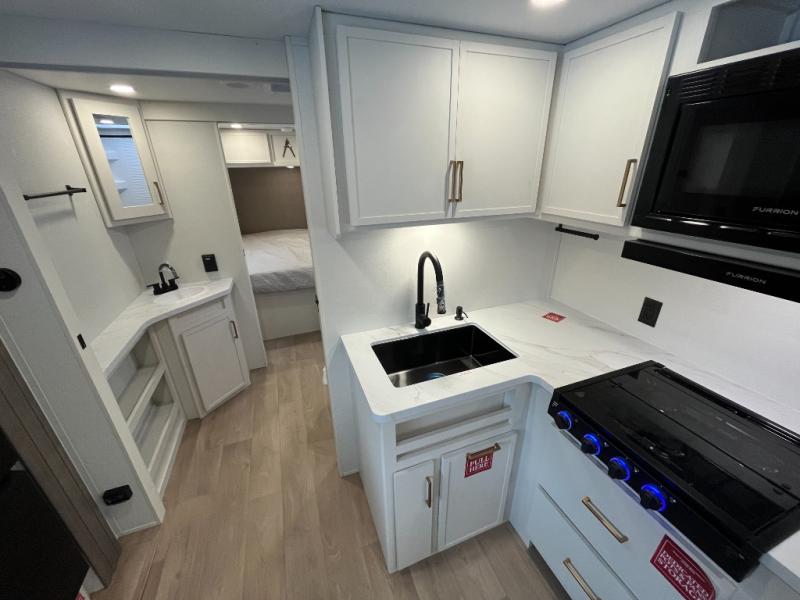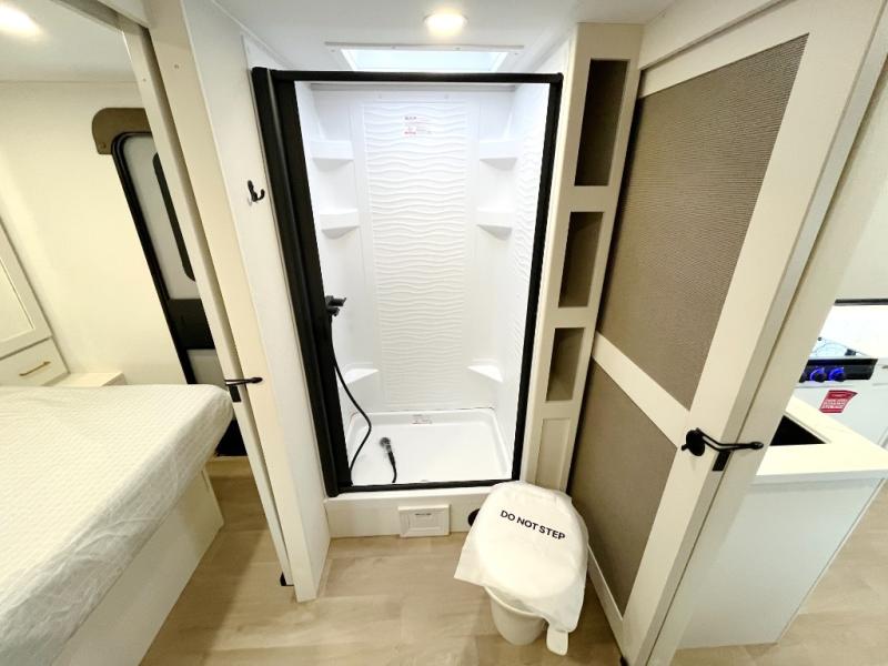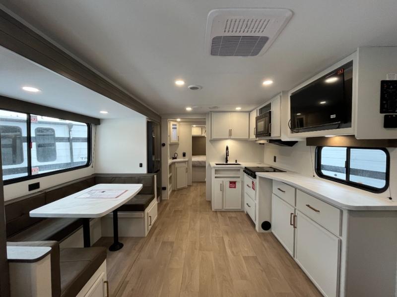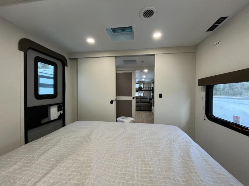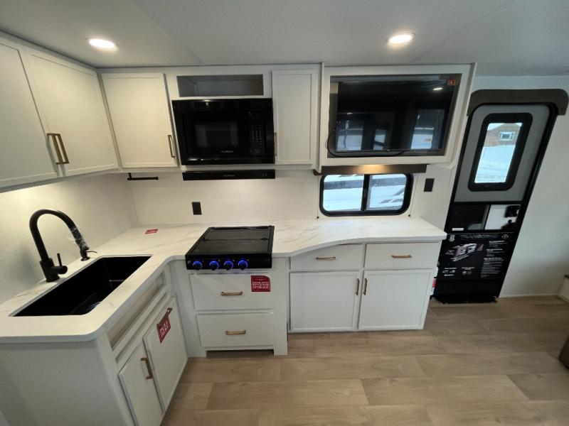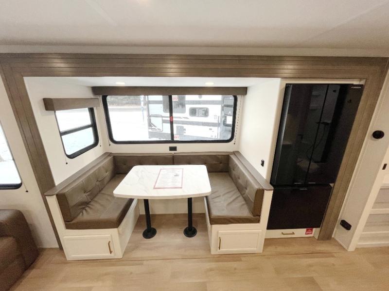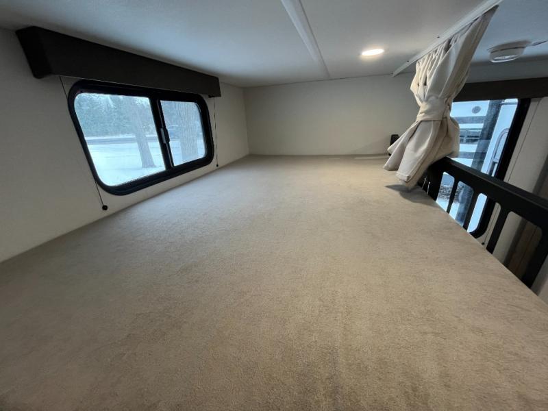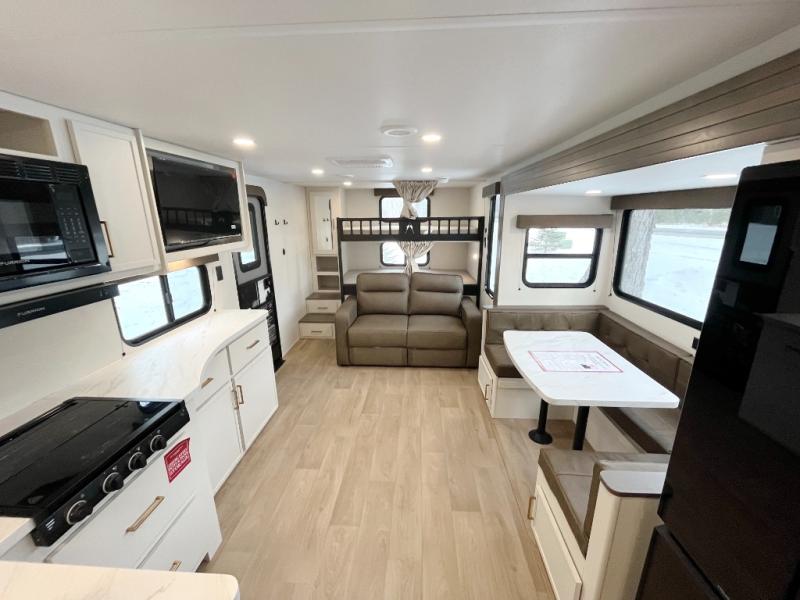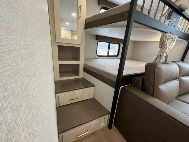 Your crew of eight will love camping in this spacious travel trailer! There are double-size bunks in the back with step storage and an added wardrobe for your guests' things plus exterior storage for camp gear galore. A walk-thru bath will create a front master bedroom you are sure to love, especially with its queen bed, wardrobe storage, and private exterior entry door! The main living area will be a favorite place to hang out with its U-shaped dinette, theater seating and 32" TV. If the weather is nice, you may just find yourselves outdoors since there is a rear exterior griddle and 1.7 cu. ft. refrigerator!