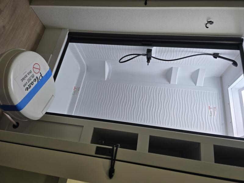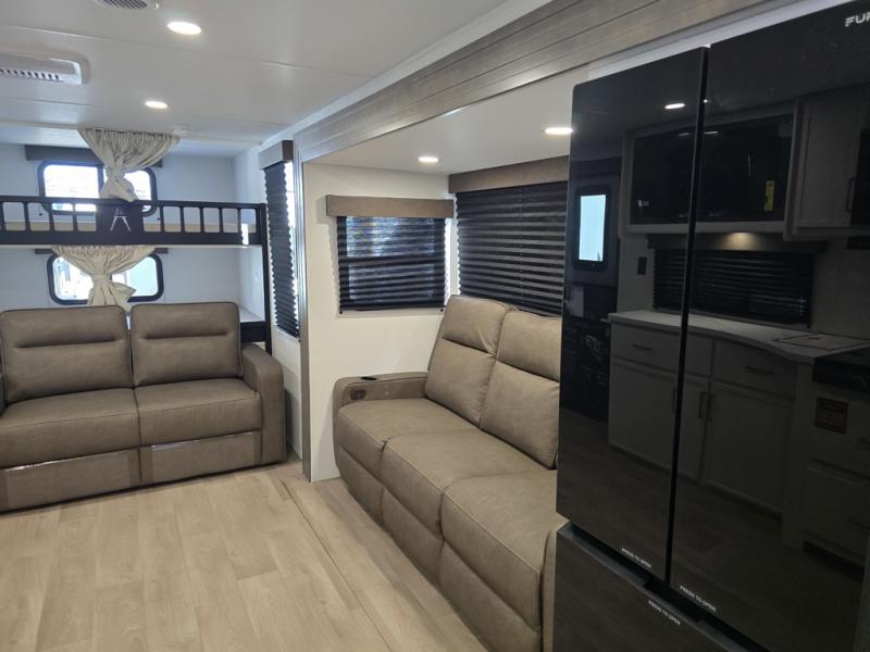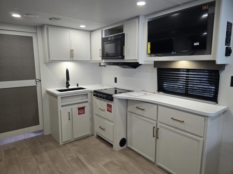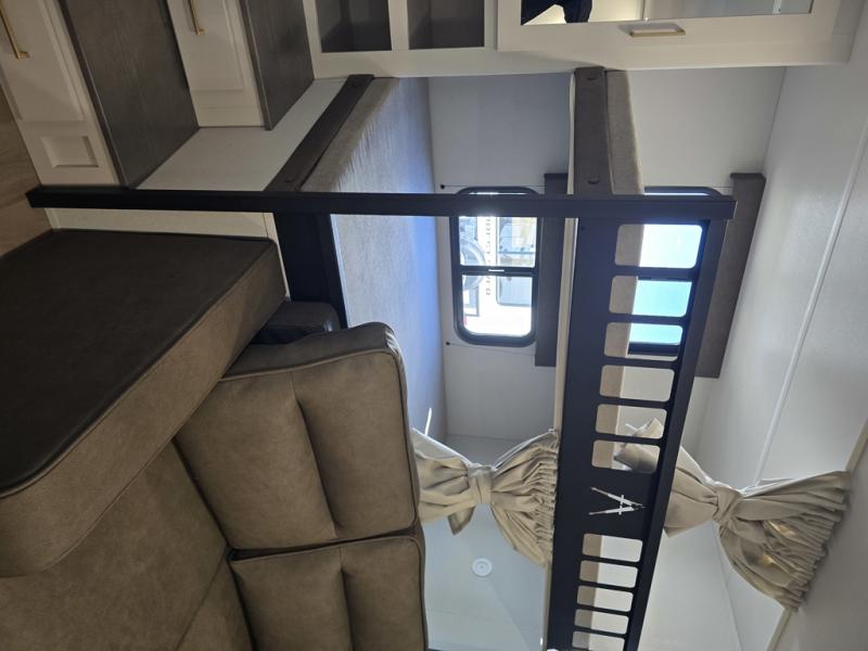 Your crew of eight will love camping in this spacious travel trailer! There are double-size bunks in the back with step storage and an added wardrobe for your guests' things plus exterior storage for camp gear galore. A walk-thru bath will create a front master bedroom you are sure to love, especially with its queen bed, wardrobe storage, and private exterior entry door! The main living area will be a favorite place to hang out with its U-shaped dinette, theater seating and 32" TV. If the weather is nice, you may just find yourselves outdoors since there is a rear exterior griddle and 1.7 cu. ft. refrigerator!