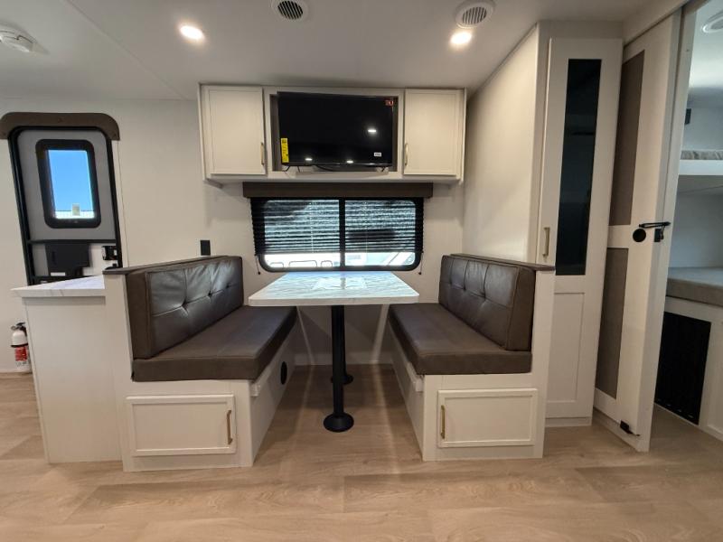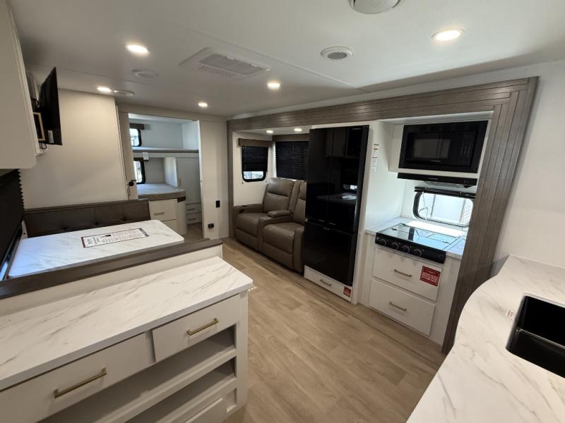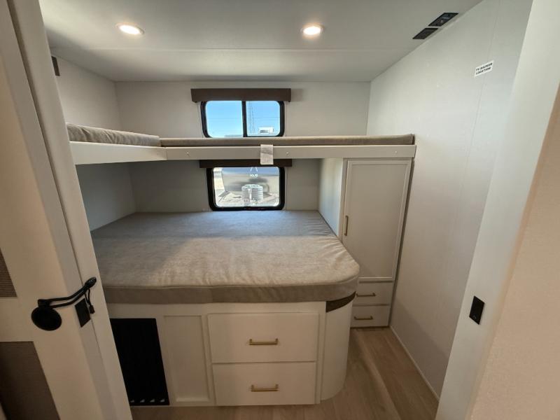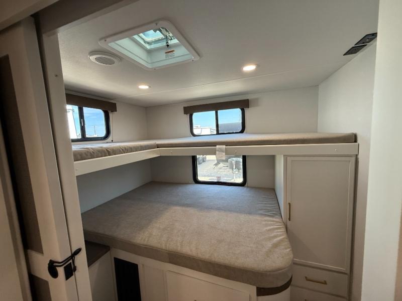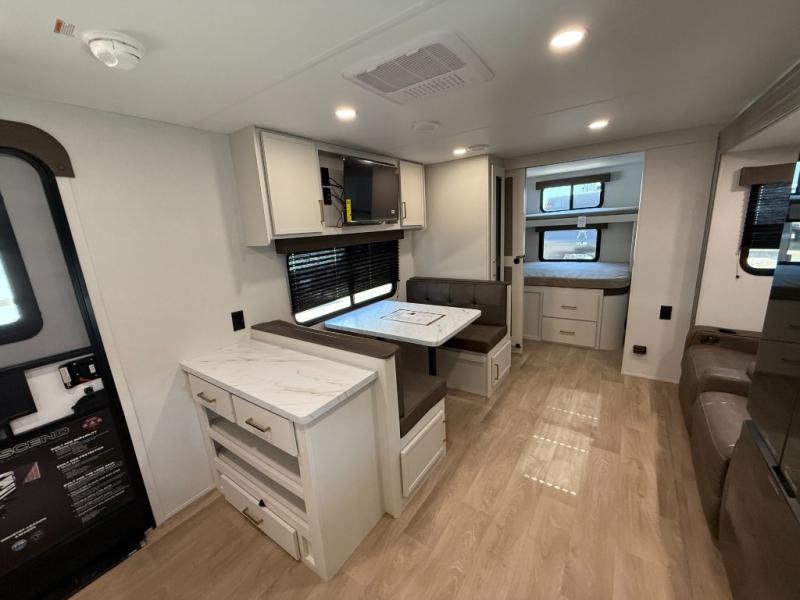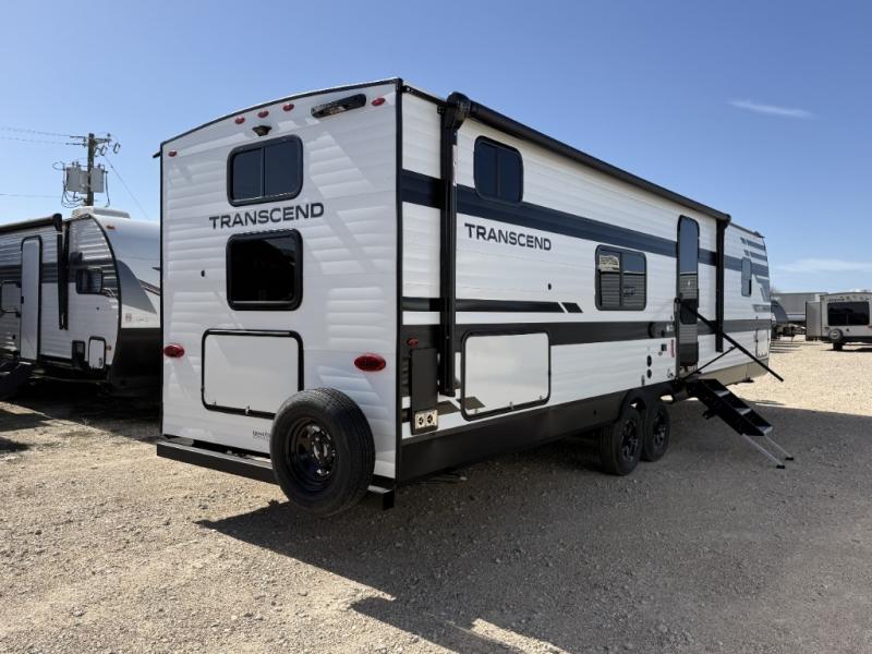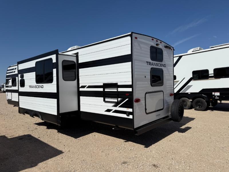 You're going to love every minute spent in this Transcend travel trailer! Your guests or the little ones will have the rear bunkhouse all to themselves that includes a residential full-size bed and two bunks, storage drawers, and TV prep if you want to add a television here. You'll enjoy your own space up front in the private bedroom with a queen bed, storage drawers, and TV prep here also. The combined kitchen and living area includes a sleeper sofa with an optional theater seating, a booth dinette where you can dine together, and a 32" TV for movie nights! The exterior is just as accommodating with its 20' awning, rear storage, plus exterior griddle and refrigerator!