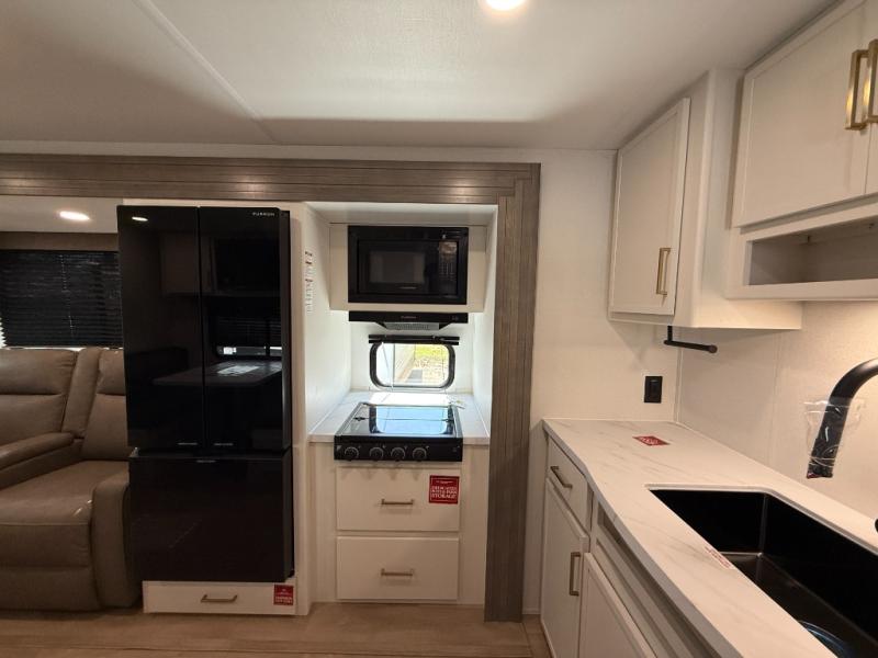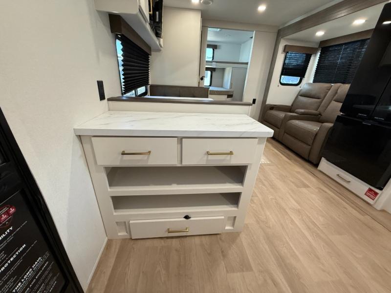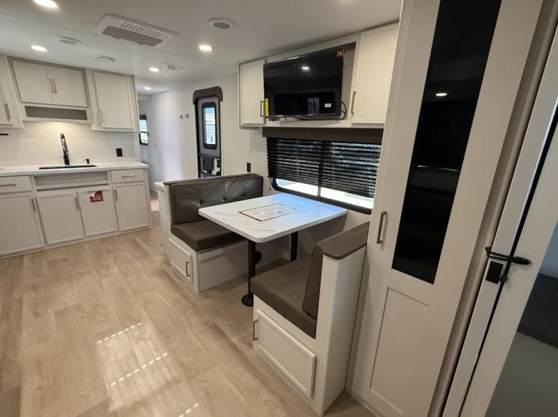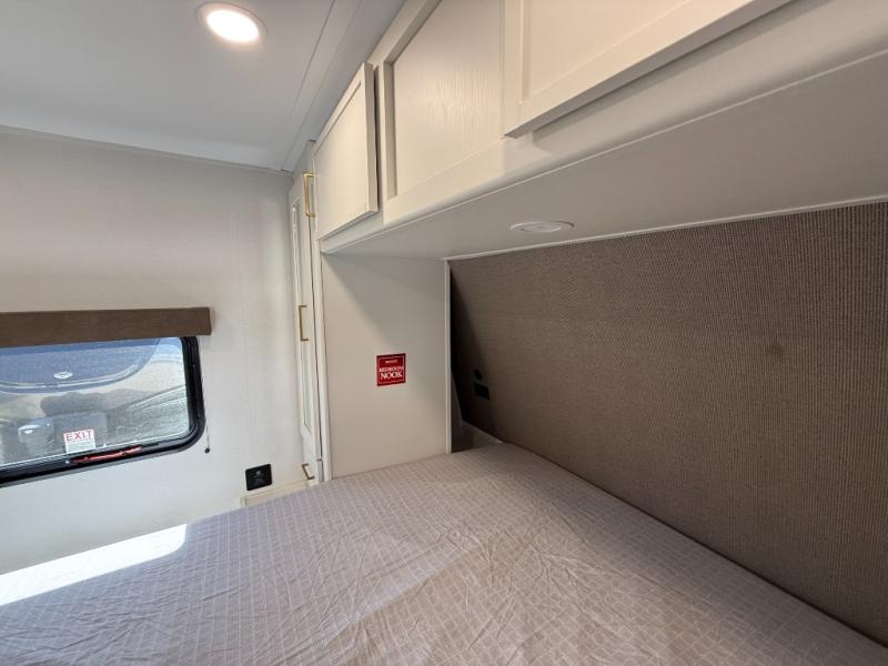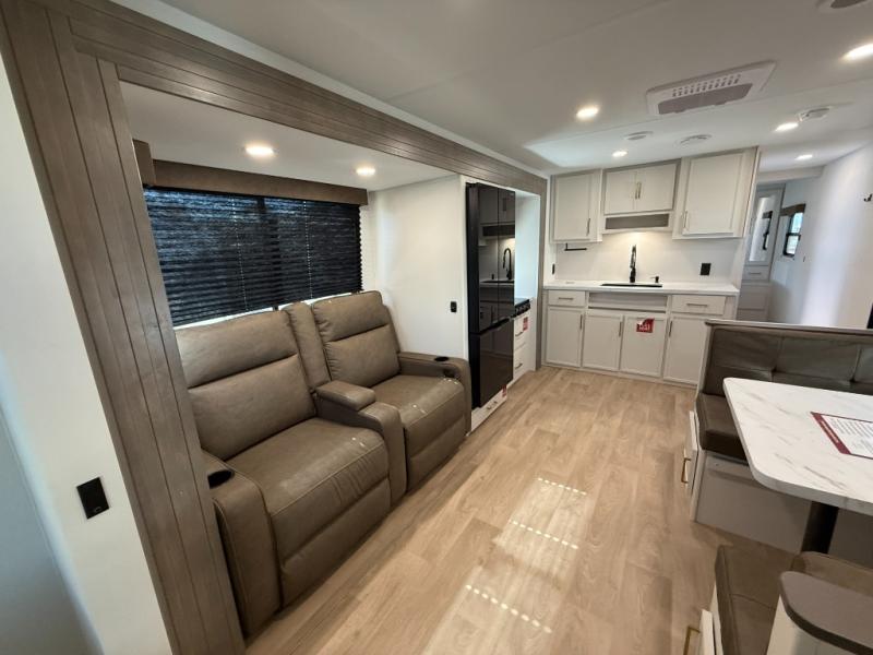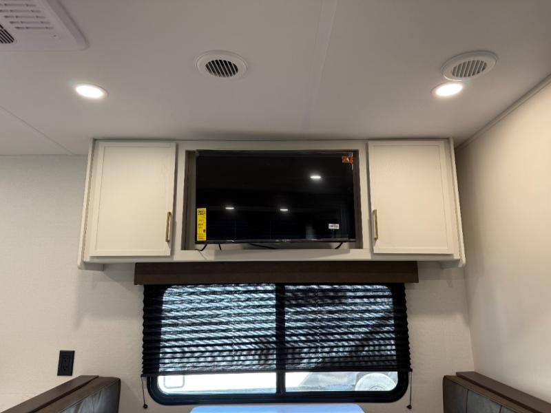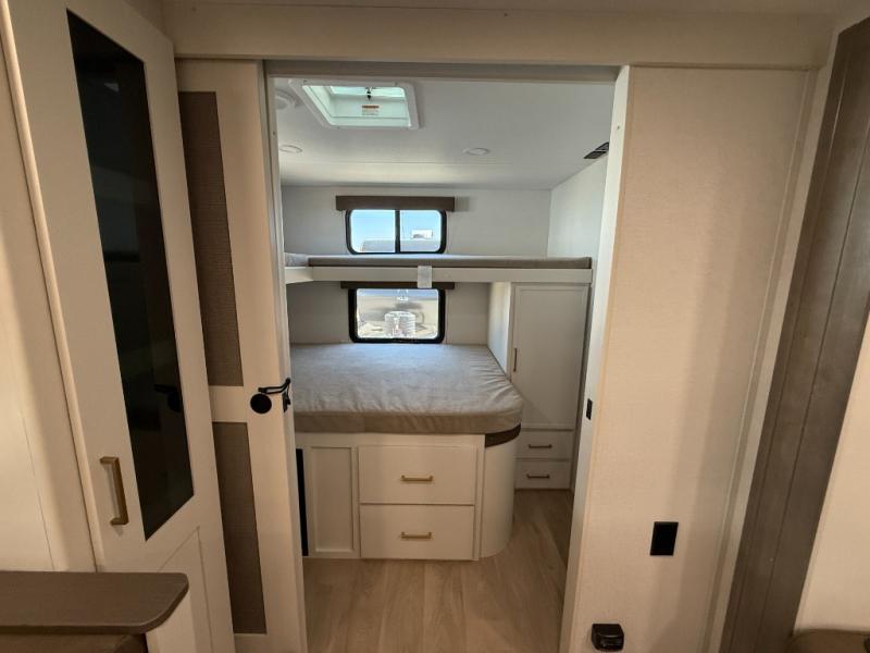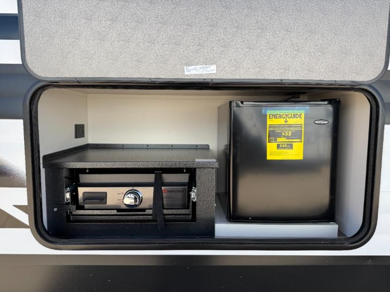 You're going to love every minute spent in this Transcend travel trailer! Your guests or the little ones will have the rear bunkhouse all to themselves that includes a residential full-size bed and two bunks, storage drawers, and TV prep if you want to add a television here. You'll enjoy your own space up front in the private bedroom with a queen bed, storage drawers, and TV prep here also. The combined kitchen and living area includes a sleeper sofa with an optional theater seating, a booth dinette where you can dine together, and a 32" TV for movie nights! The exterior is just as accommodating with its 20' awning, rear storage, plus exterior griddle and refrigerator!