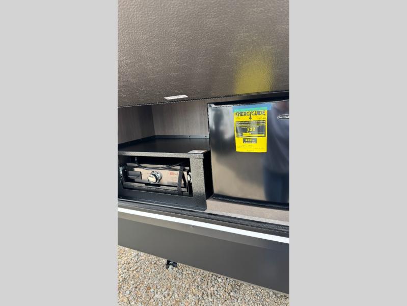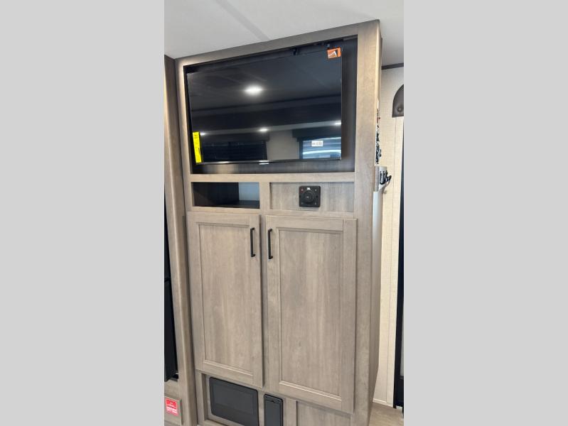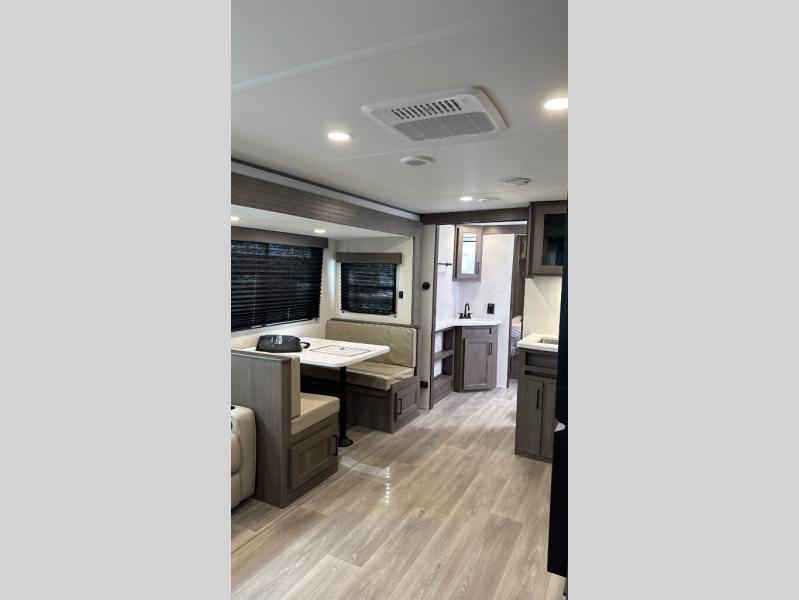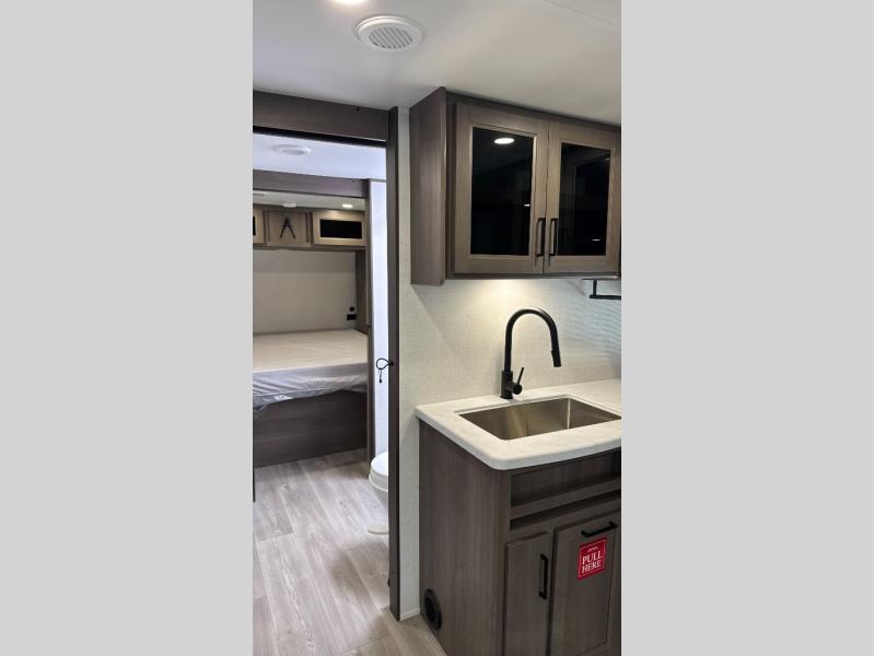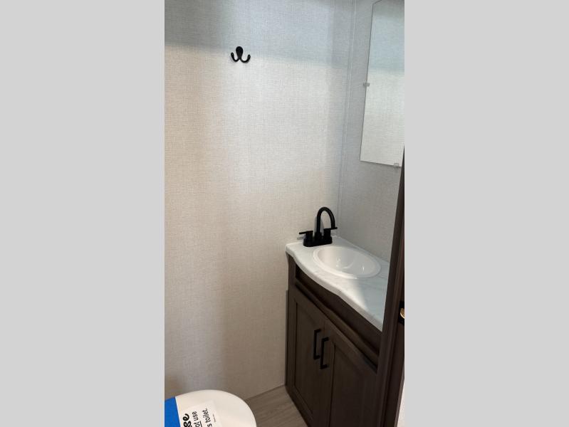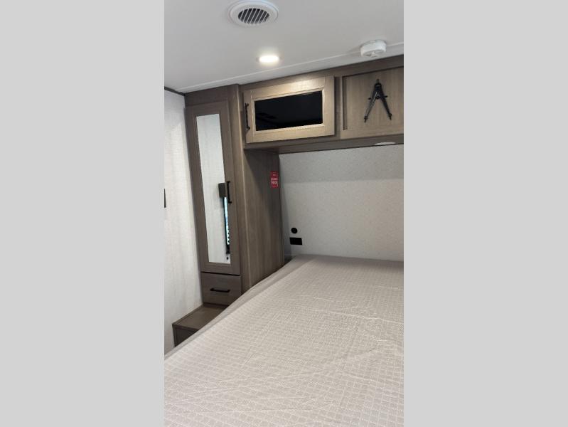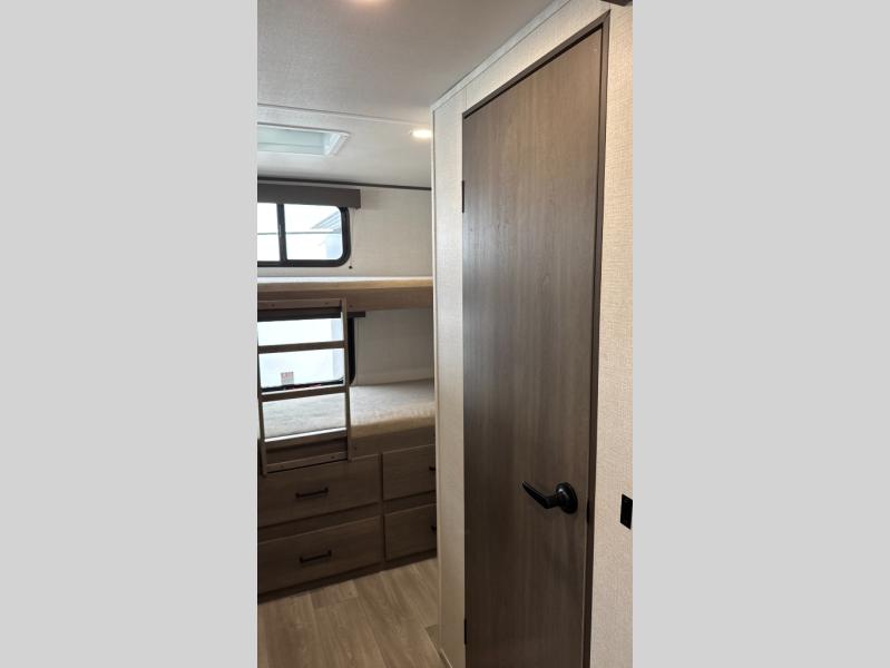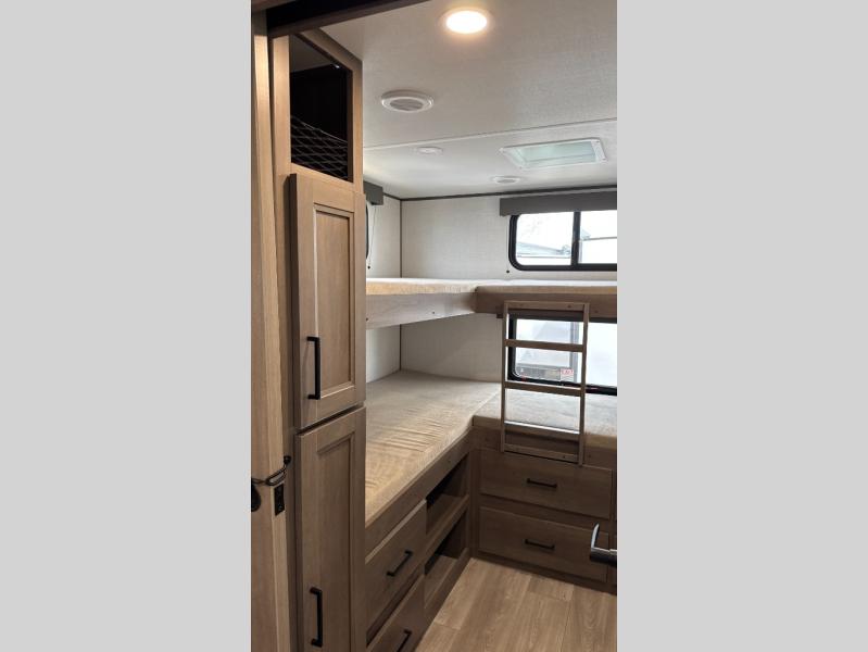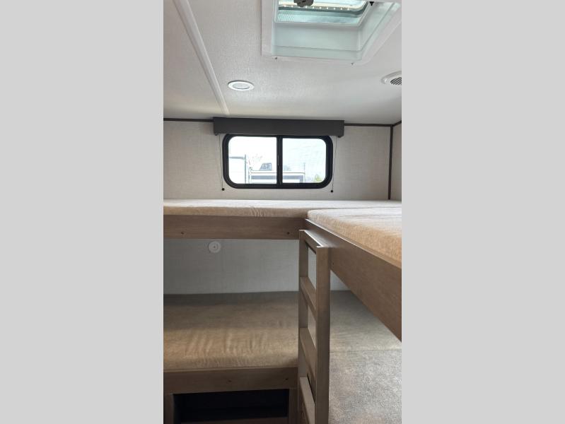 Your crew of nine will love camping in this spacious travel trailer! There are four bunks in the rear bunkhouse, along with storage drawers, and a convenient half bath! A full walk-thru bath will create a front master bedroom you are sure to love, especially with its queen bed, wardrobe storage, and private exterior entry door! The main living area will be a favorite place to hang out with its booth dinette, sleeper sofa and 32" TV. If the weather is nice, you may just find yourselves outdoors since there is an exterior griddle and 1.7 cu. ft. refrigerator!