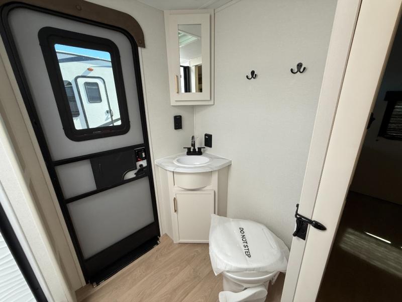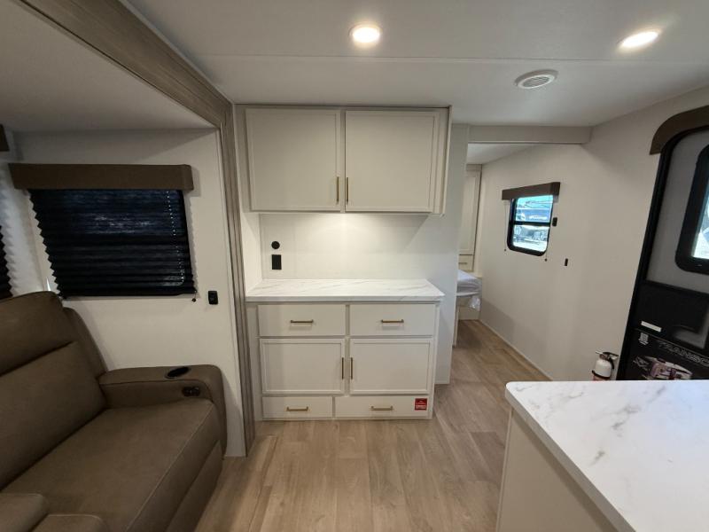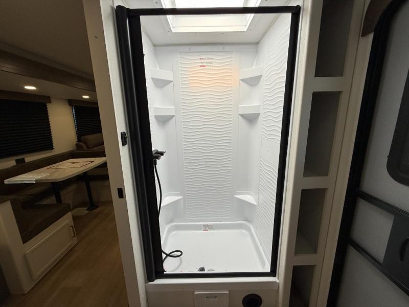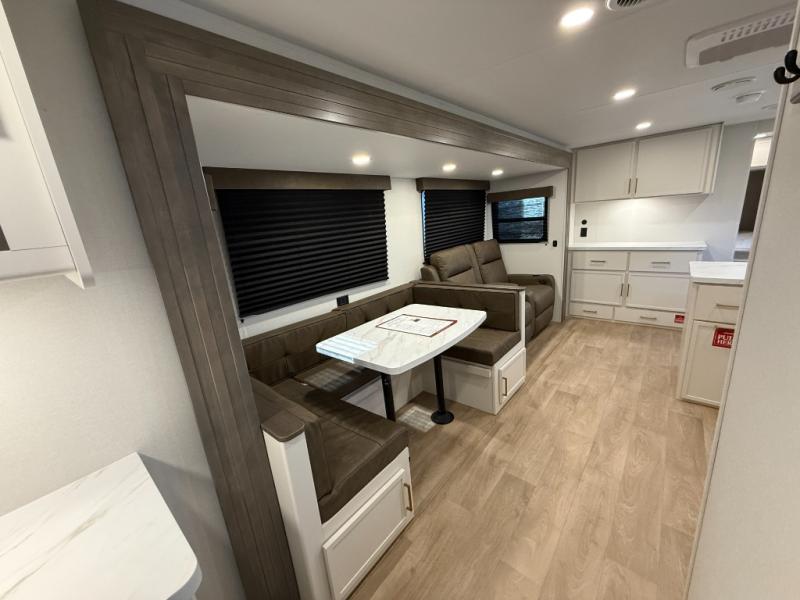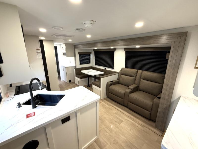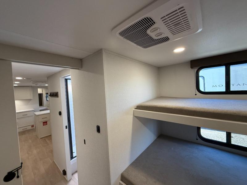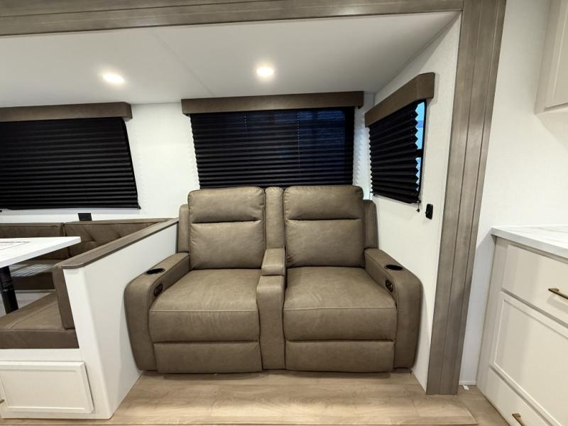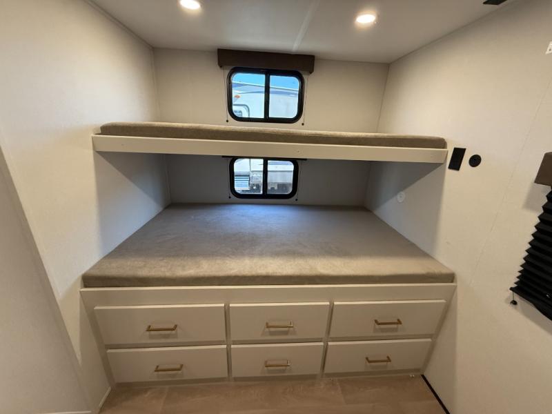 If you're looking for a travel trailer that can house your whole gang, this unit is the one! The rear private bunkhouse can sleep up to five since there is a sleeper sofa and three bunks, plus there are storage drawers for your guests' things. A front private bedroom will be perfect for the owners with a queen bed, storage space, and a convenient laundry chute! Whether you cook outside on the exterior griddle or inside on the three burner range, you'll be able to make your best meals. There is also a 12V French door refrigerator with a glass front and bottom freezer and a convection microwave/combo air fryer for easy meals! A U-shaped dinette and 60" sleeper sofa within the living room slide provides even more seating and sleeping space, or you can choose the optional theater seat in place of the sofa if you're not needing the extra sleeping space!