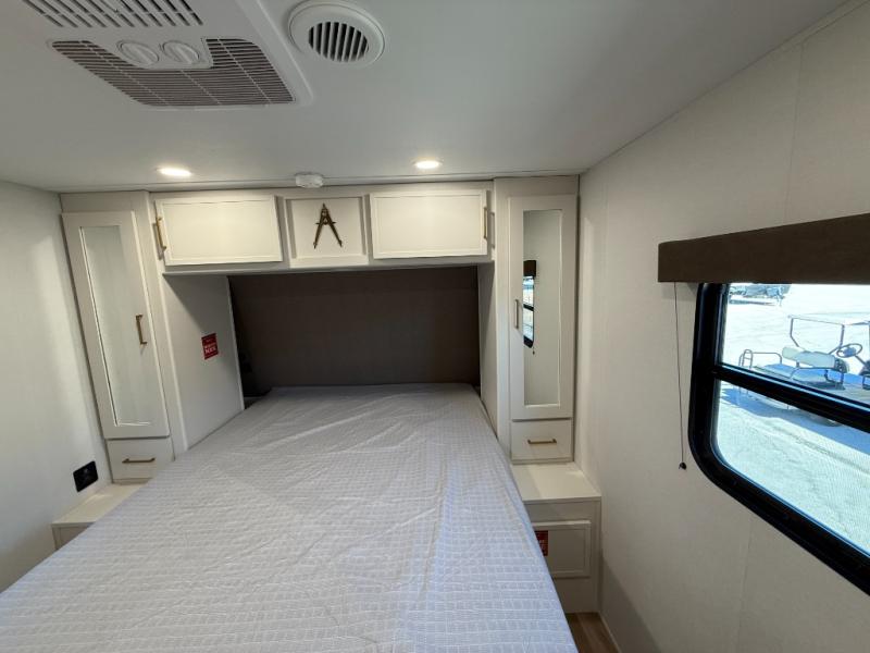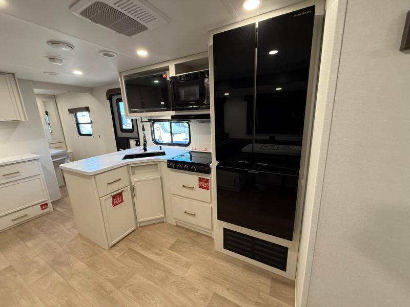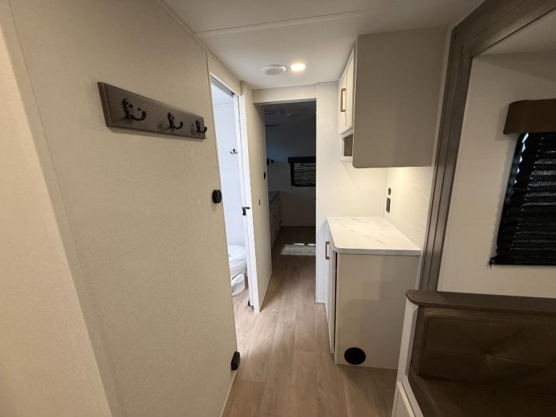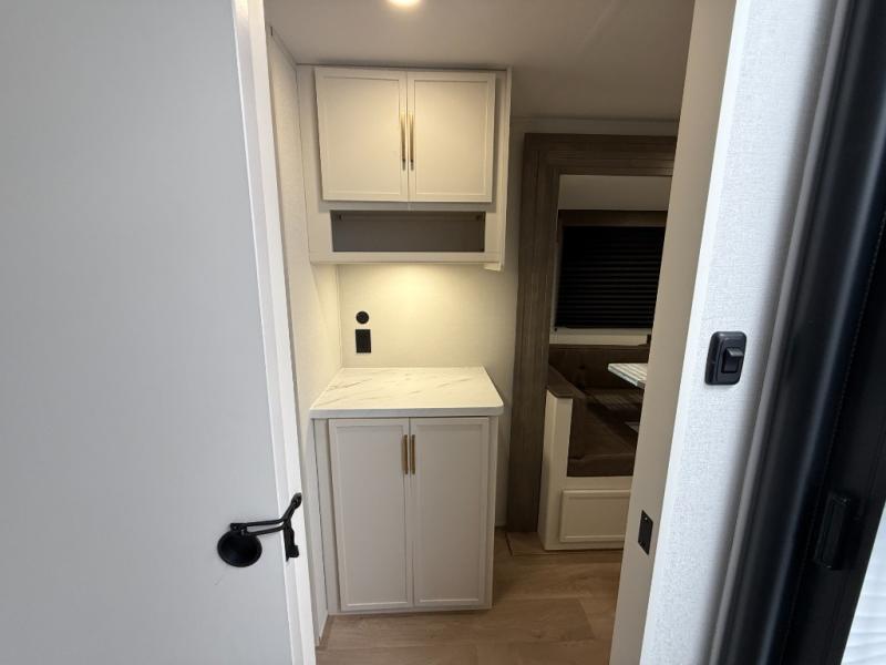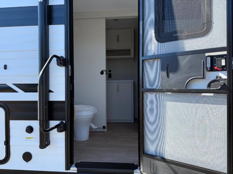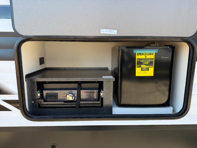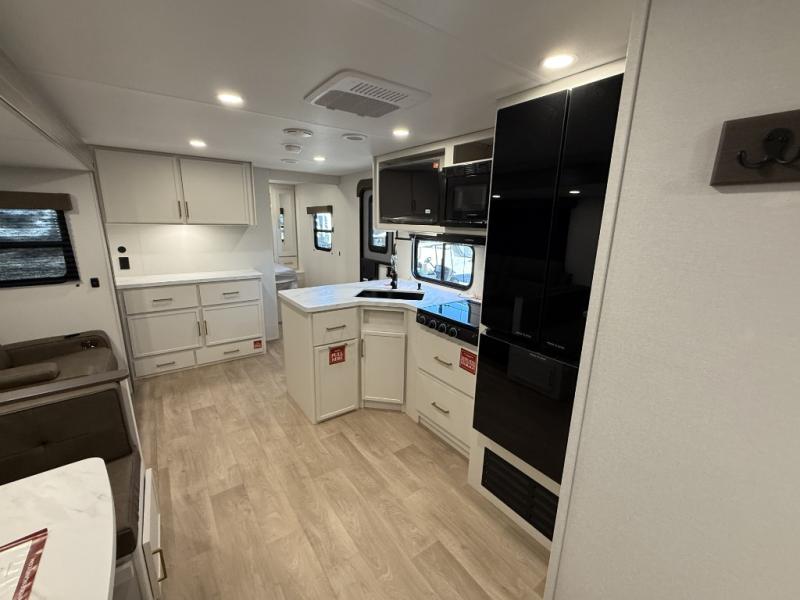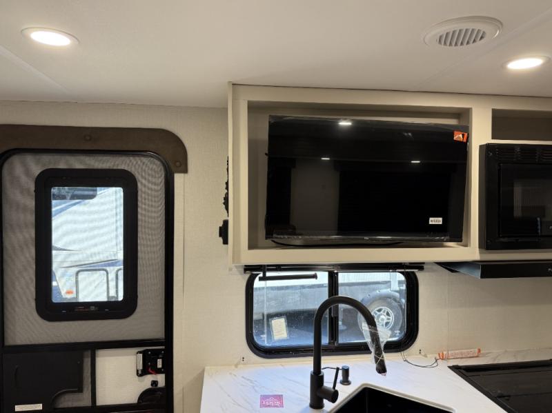 If you're looking for a travel trailer that can house your whole gang, this unit is the one! The rear private bunkhouse can sleep up to five since there is a sleeper sofa and three bunks, plus there are storage drawers for your guests' things. A front private bedroom will be perfect for the owners with a queen bed, storage space, and a convenient laundry chute! Whether you cook outside on the exterior griddle or inside on the three burner range, you'll be able to make your best meals. There is also a 12V French door refrigerator with a glass front and bottom freezer and a convection microwave/combo air fryer for easy meals! A U-shaped dinette and 60" sleeper sofa within the living room slide provides even more seating and sleeping space, or you can choose the optional theater seat in place of the sofa if you're not needing the extra sleeping space!