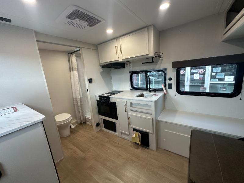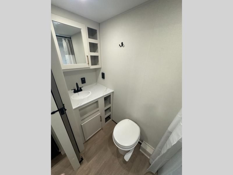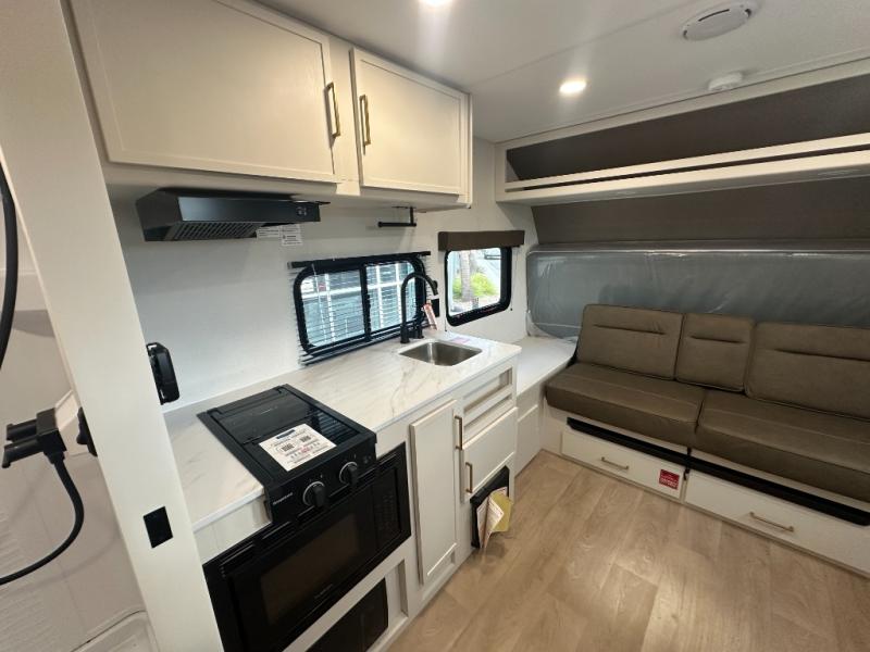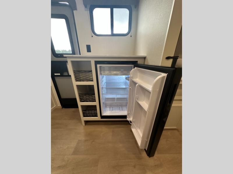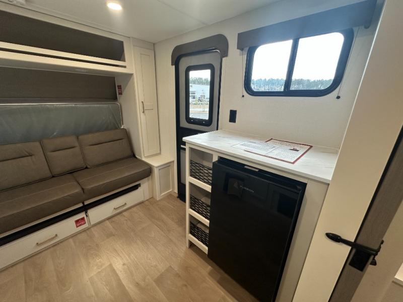Travel in this 131DL model and step inside through the sturdy aluminum entry steps and you'll be greeted by a versatile 60" x 80" Murphy bed that doubles as a comfortable seating area during the day—perfect for relaxing with your furry companion, thanks to the included pet dish. In the center, the kitchen offers all the essentials for preparing a delicious meal, featuring a microwave, 2-burner range, 3.3 cu. ft. refrigerator, and overhead cabinets for added storage. At the rear, enjoy the convenience of a full bathroom complete with a walk-in shower and foot-flush toilet, making life on the road both comfortable and functional.