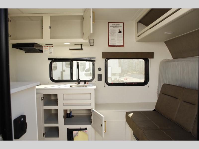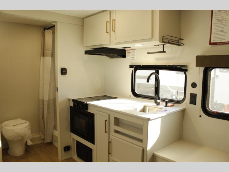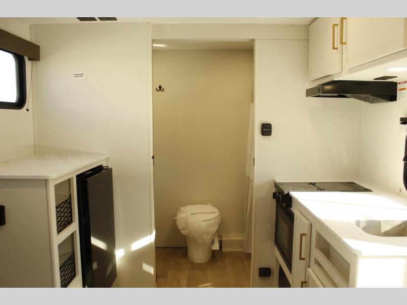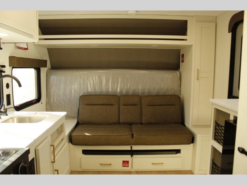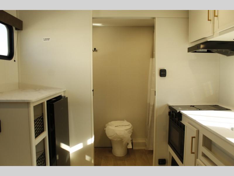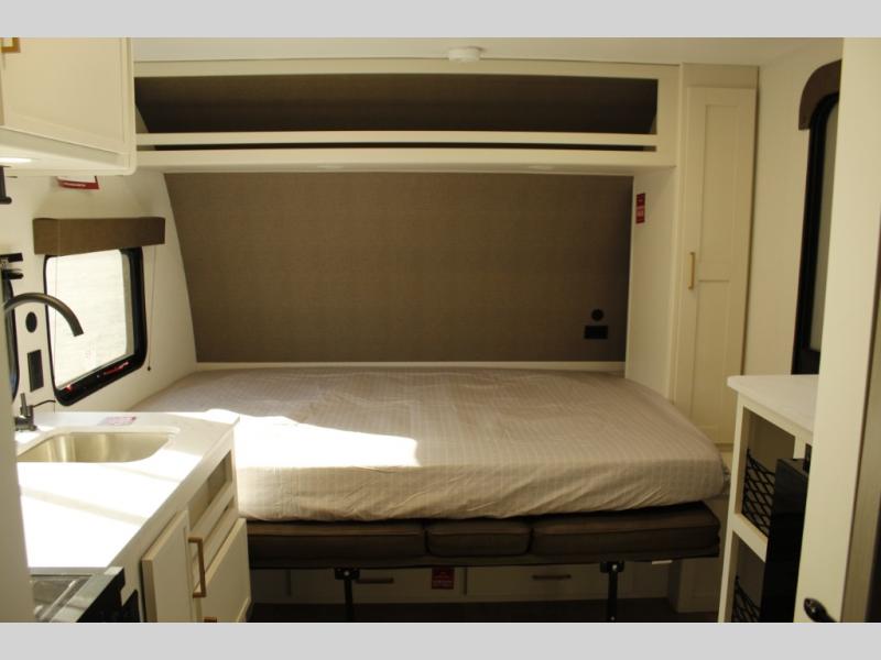 Travel in this 131DL model and step inside through the sturdy aluminum entry steps and you'll be greeted by a versatile 60" x 80" Murphy bed that doubles as a comfortable seating area during the day—perfect for relaxing with your furry companion, thanks to the included pet dish. In the center, the kitchen offers all the essentials for preparing a delicious meal, featuring a microwave, 2-burner range, 3.3 cu. ft. refrigerator, and overhead cabinets for added storage. At the rear, enjoy the convenience of a full bathroom complete with a walk-in shower and foot-flush toilet, making life on the road both comfortable and functional.