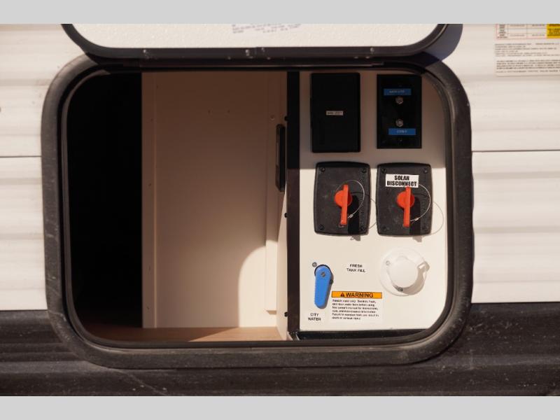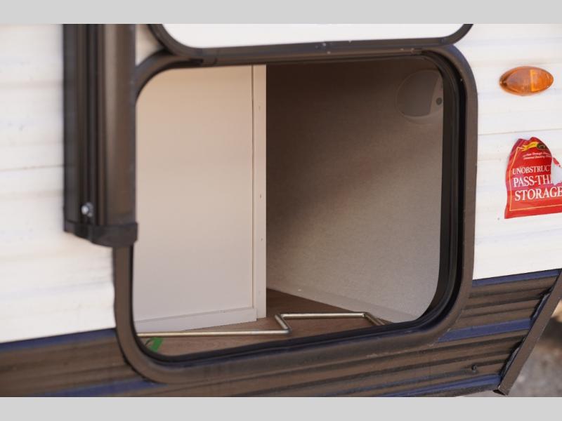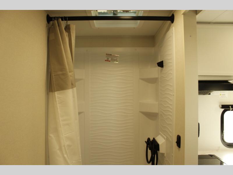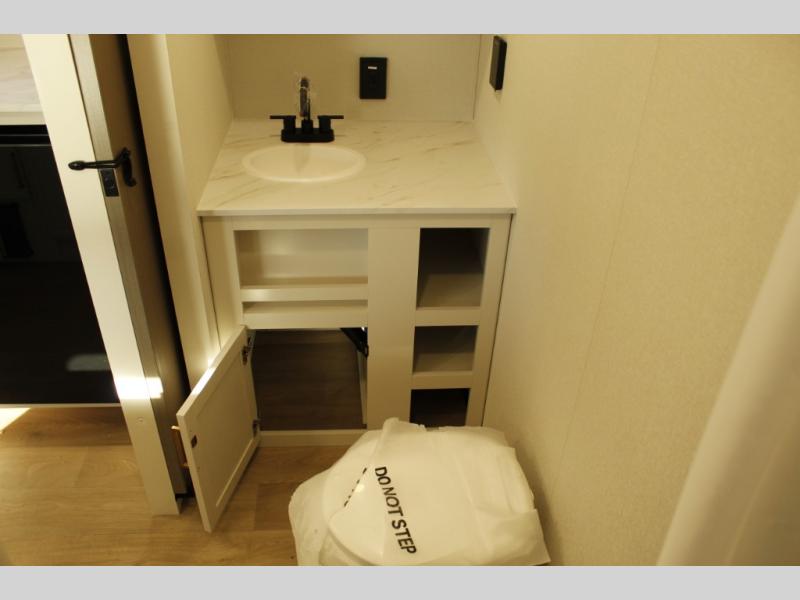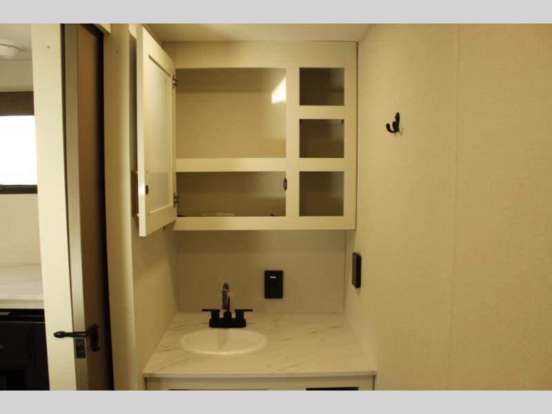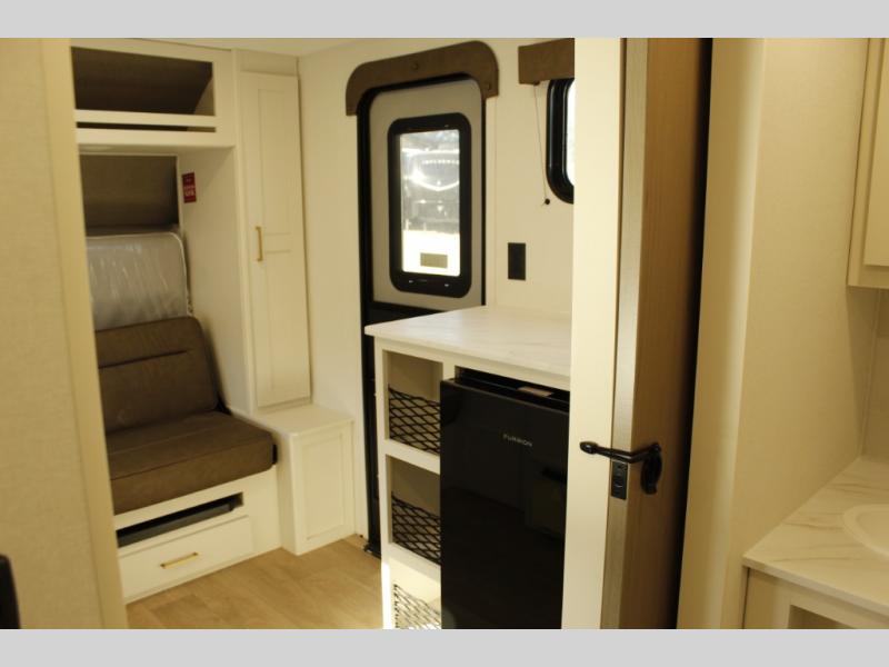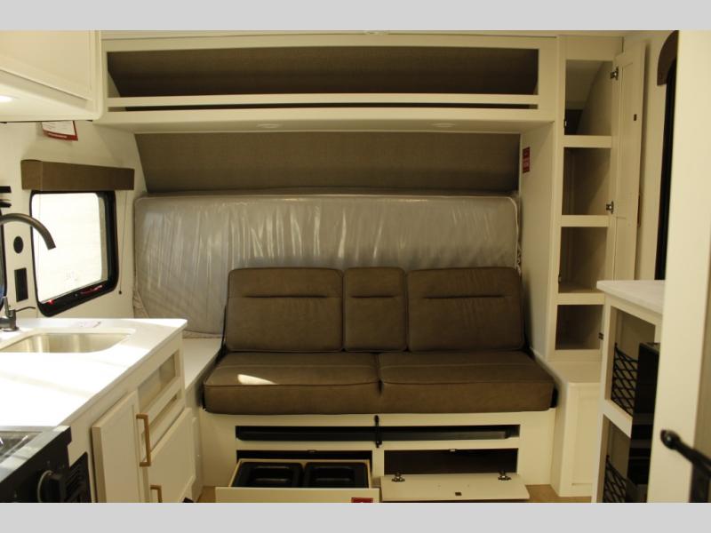 Travel in this 131DL model and step inside through the sturdy aluminum entry steps and you'll be greeted by a versatile 60" x 80" Murphy bed that doubles as a comfortable seating area during the day—perfect for relaxing with your furry companion, thanks to the included pet dish. In the center, the kitchen offers all the essentials for preparing a delicious meal, featuring a microwave, 2-burner range, 3.3 cu. ft. refrigerator, and overhead cabinets for added storage. At the rear, enjoy the convenience of a full bathroom complete with a walk-in shower and foot-flush toilet, making life on the road both comfortable and functional.