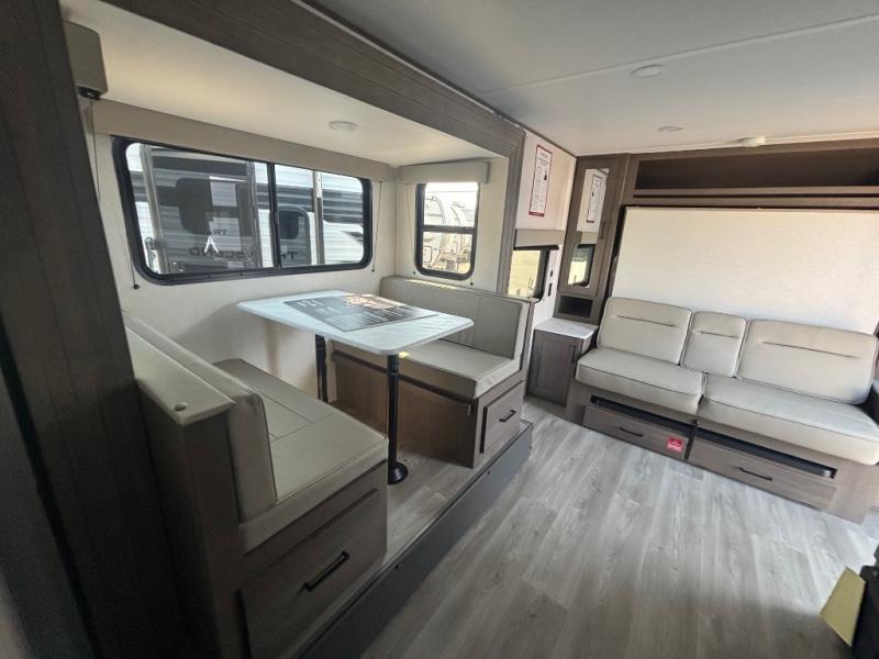 Spacious and versatile, this travel trailer is perfect for weekend trips to the campground or weeklong visits to the lake! There is a front Murphy bed with storage on both sides plus a pull-out pet drawer to keep your furry friends happy. Your guests or little ones will love the double-size bunks with privacy curtains, and the full bath is right next to the bunks for easy nighttime use. Once you make breakfast on the two burner range, you can dine at the booth dinette slide. And this model also includes an outdoor griddle and refrigerator if you want to make breakfast outdoors. Additional exterior features include a 16' power awning, an interior/exterior table, and a pass-thru storage for larger camp gear.