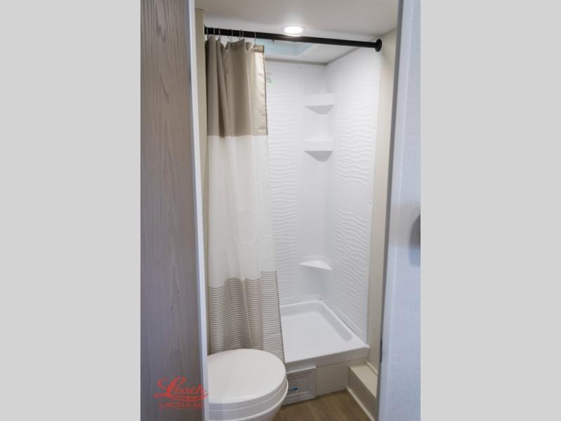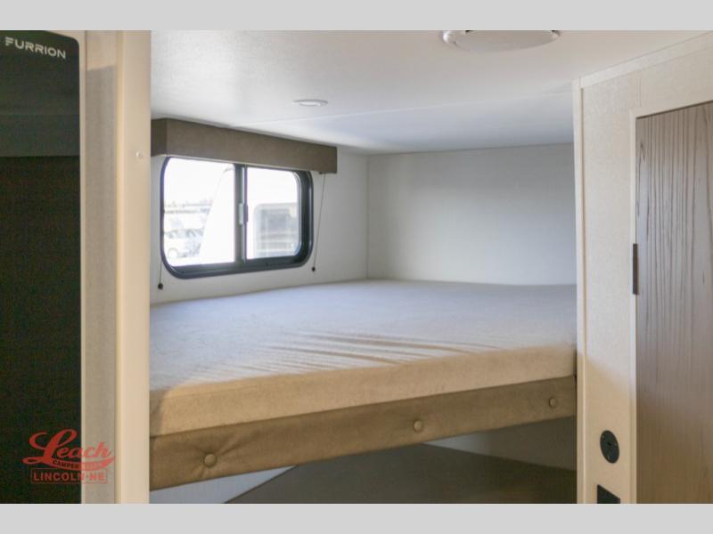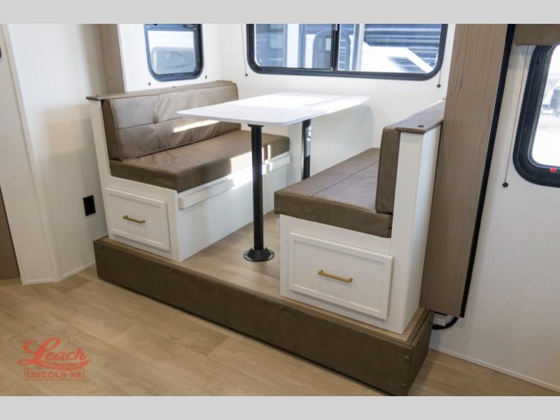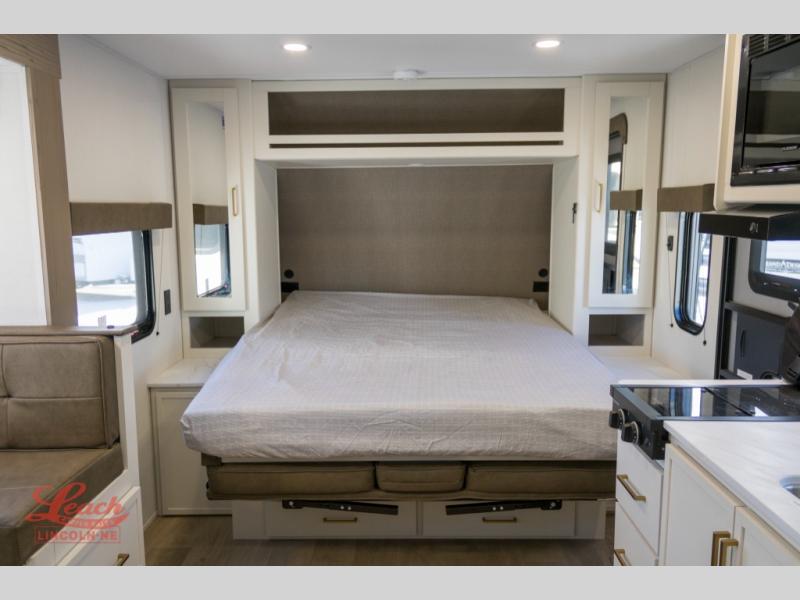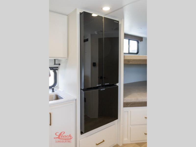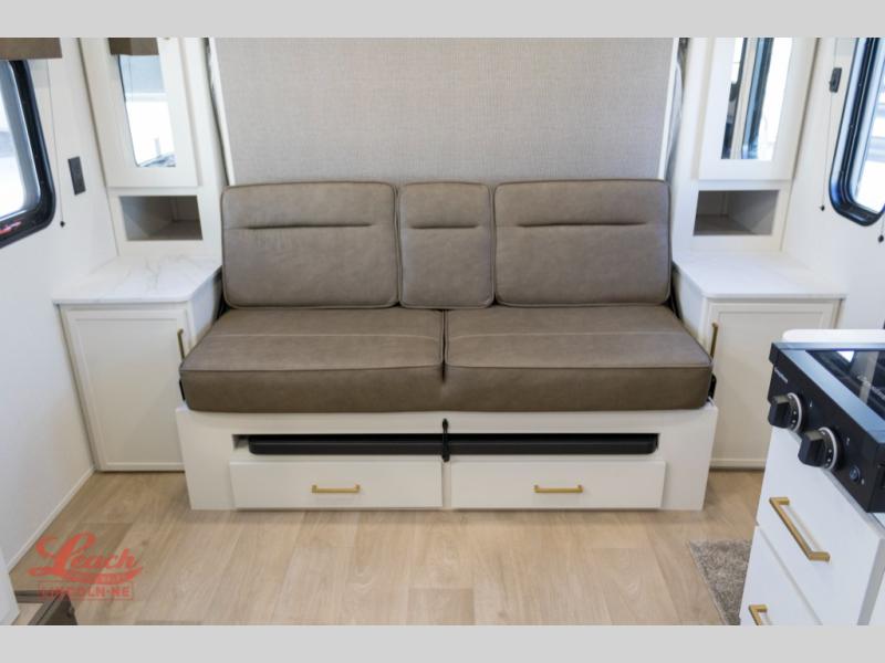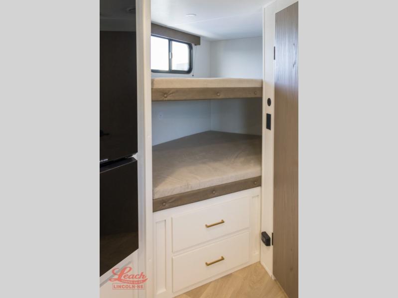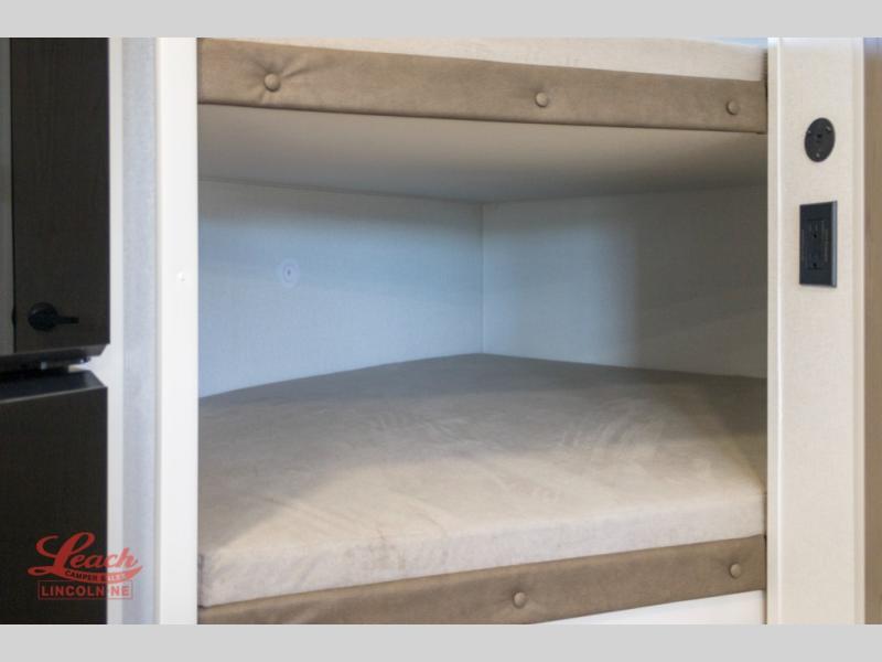 Spacious and versatile, this travel trailer is perfect for getaways to the campground or relaxing escapes by the lake! There is a front Murphy bed with storage on both sides plus a pull-out pet dish to keep your furry friends happy. Your guests or little ones will love the double-size bunks, and the full bath is right next to the bunks for easy nighttime use. Once you make breakfast on the two burner range, you can dine at the booth dinette slide. And this model also includes an outdoor griddle and refrigerator if you want to make breakfast outdoors. Additional exterior features include a 16' power awning, an interior/exterior table, and a pass-thru storage for larger camp gear.