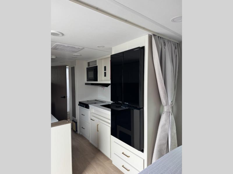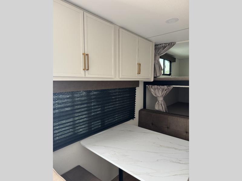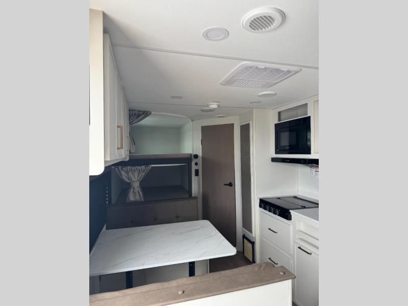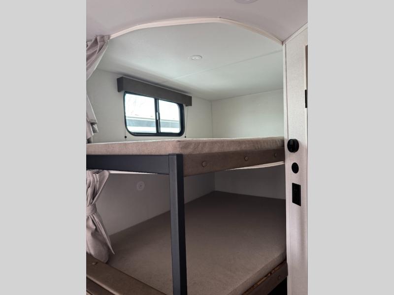 Camping trips are made complete in this travel trailer that can sleep seven each night! The little ones or your guest will love sleeping on the double-size bunks, while you take the queen bed in the front semi-private bedroom with a privacy curtain. A three-burner range and microwave oven will let you make meals each day, and a booth dinette provides a place to dine together. There are also convenient features found here, such as a pull-out pet dish and pull-out trash can, and there is ample storage space for your belongings. You will also appreciate the full bath that will let you stay clean throughout your trip without having to leave your trailer!